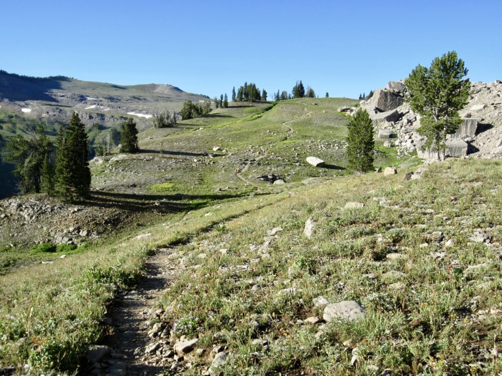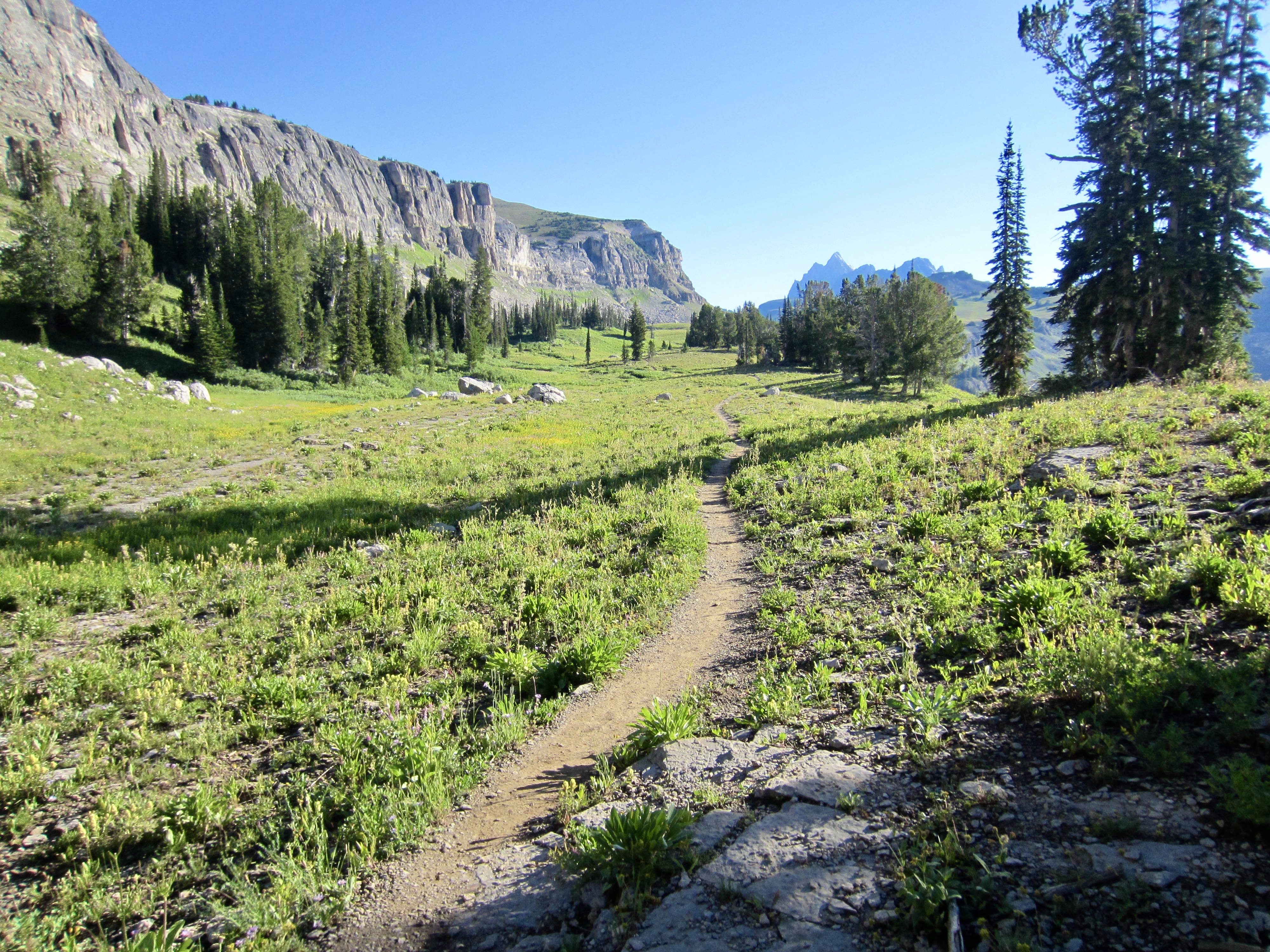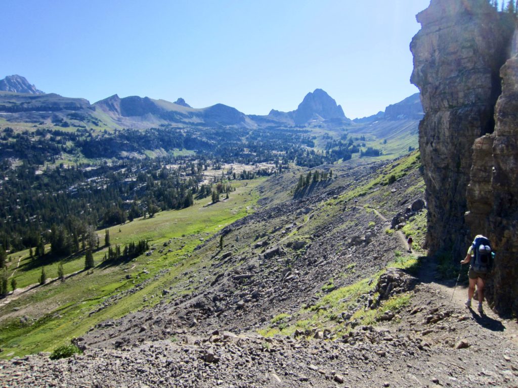 At the northern end of Death Canyon Shelf, the TCT crosses over Mt. Meek Pass and once again leaves the national park on a 4-mile jaunt through the Jedediah Smith Wilderness. We soon rounded a sharp corner and started dropping into one of the most scenic parts of the traverse: Alaska Basin.