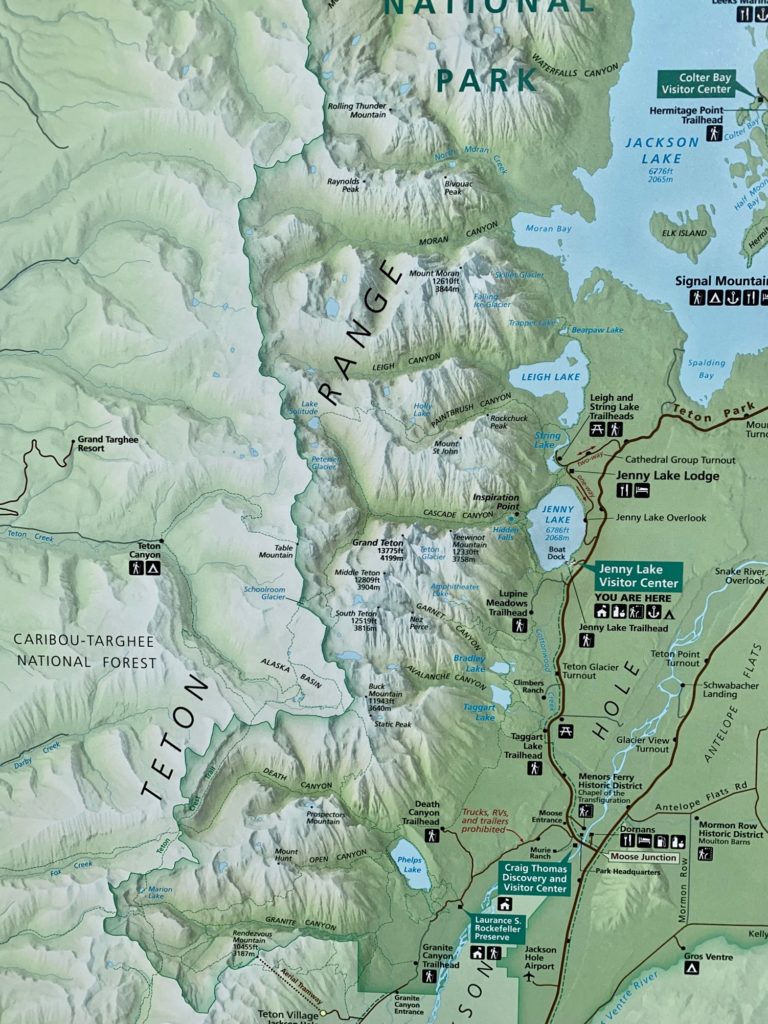 The rest of us maintained a more relaxed pace down to Leigh Lake, and we stopped for a swim in String Lake before reaching the trailhead in early afternoon (4.5 hours + 6.8 miles + 50 feet – 3050 feet from Camp 3). It had been a fabulous trail traverse for everyone, as well as a tantalizing introduction to Grand Teton National Park for those of us who had never been here before. Eileen and I were thrilled to be spending another week in the area, with high summits in mind!