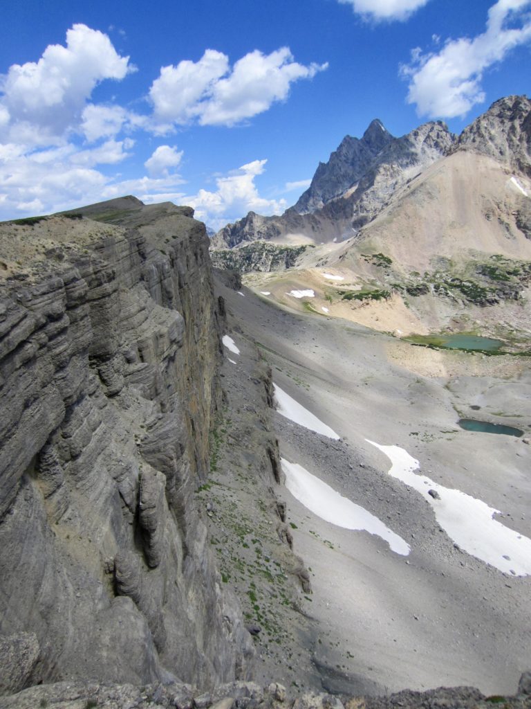 The tundra slope abruptly ended at a tall, vertical, mile-long limestone cliff called The Wall. From this vantage, we could look up at the craggy Teton peaks and down at the turquoise water of Snowdrift Lake.