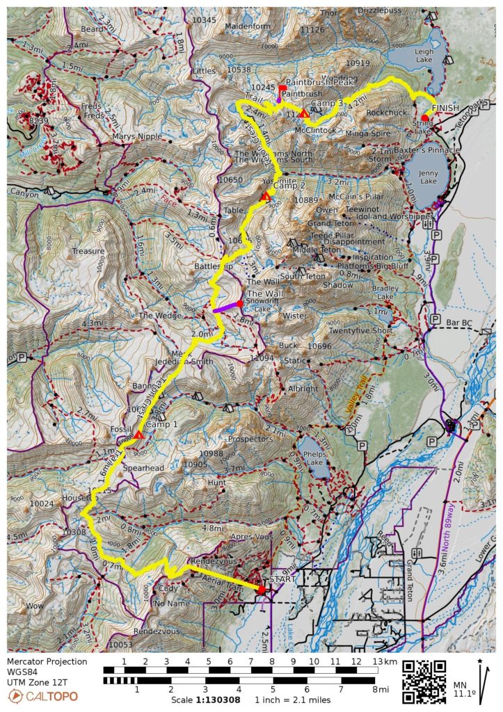 The Teton Crest Trail Traverse can readily be done in a north-to-south direction or a south-to-north direction. Either way, the logical northern terminus is the String Lake / Leigh Lake Trailhead off Jenny Lake Loop Road. In contrast, there are multiple options for the southern terminus; these include the Granite Canyon Trailhead, Teton Village, Phillips Canyon Trailhead, Phillips Bench Trailhead, and Coal Creek Trailhead. Our group elected to do a south-to-north traverse starting at Teton Village because this allowed us to ride the Jackson Hole Aerial Tramway up Rendezvous Mountain, thereby saving us many miles and more than 4000 feet of elevation gain. If given an extra day, we might have chosen to start at the Coal Creek Trailhead just for the sake of “completeness and purity.”