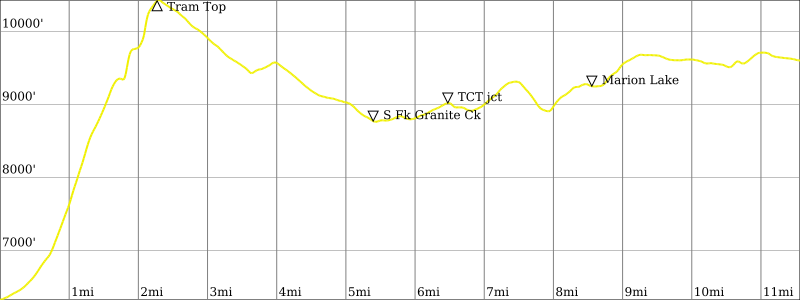 In mid-afternoon, we arrived at Marion Lake, which is tucked below a cliffy cirque on Housetop Mountain. Most of us took a swim in the chilly water before heading northward.