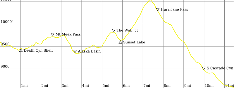 Approximate Stats (including sidetrips): 37 miles traveled on foot; 7600 feet gained; 11,000 feet lost.