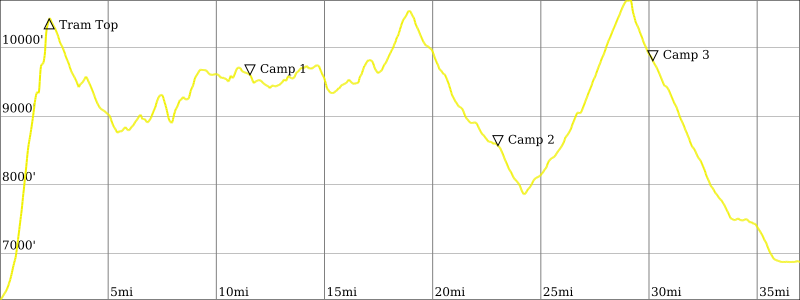 Approximate Stats (excluding sidetrips): 35 miles traveled on foot; 6300 feet gained; 9900 feet lost.