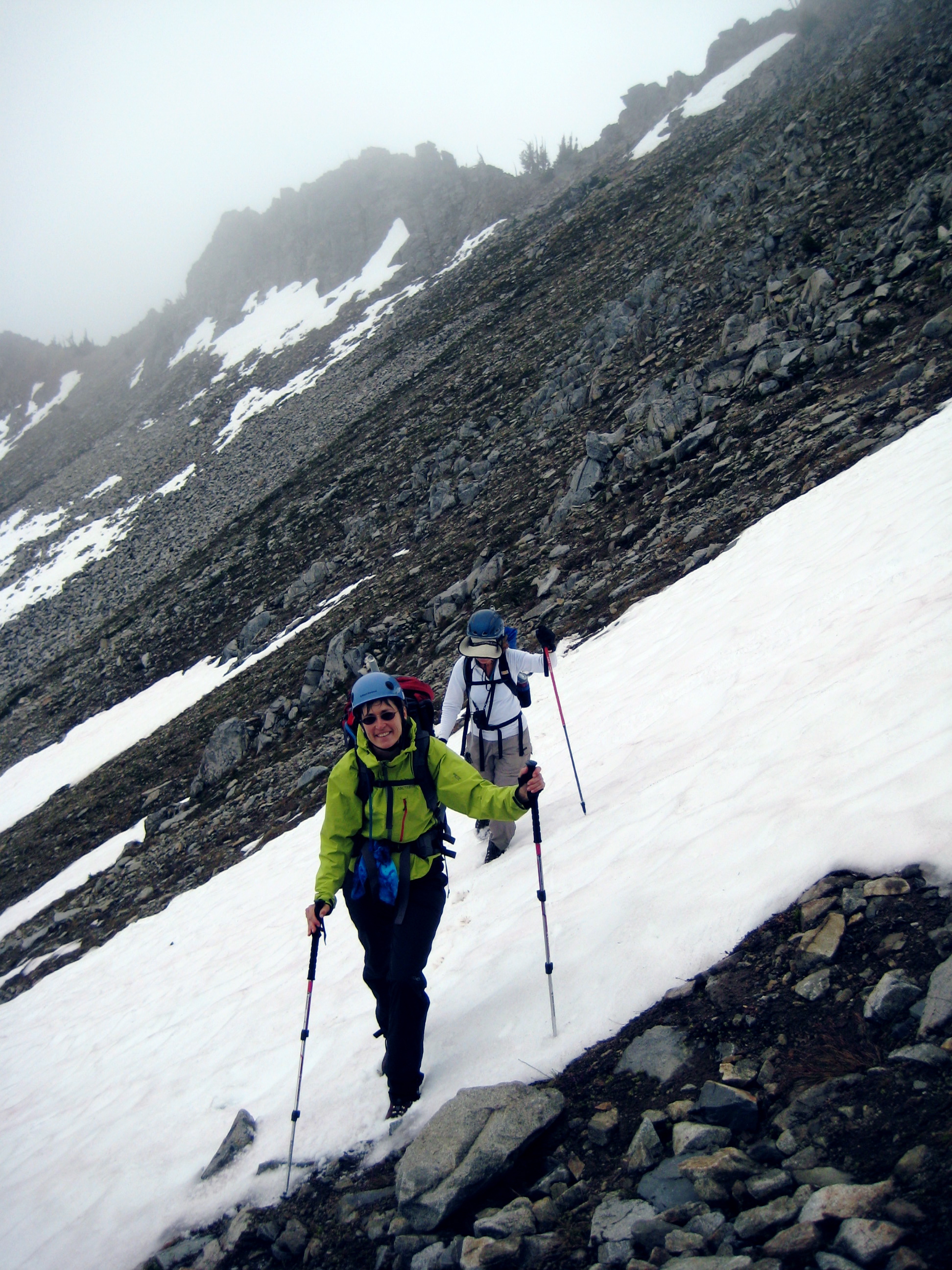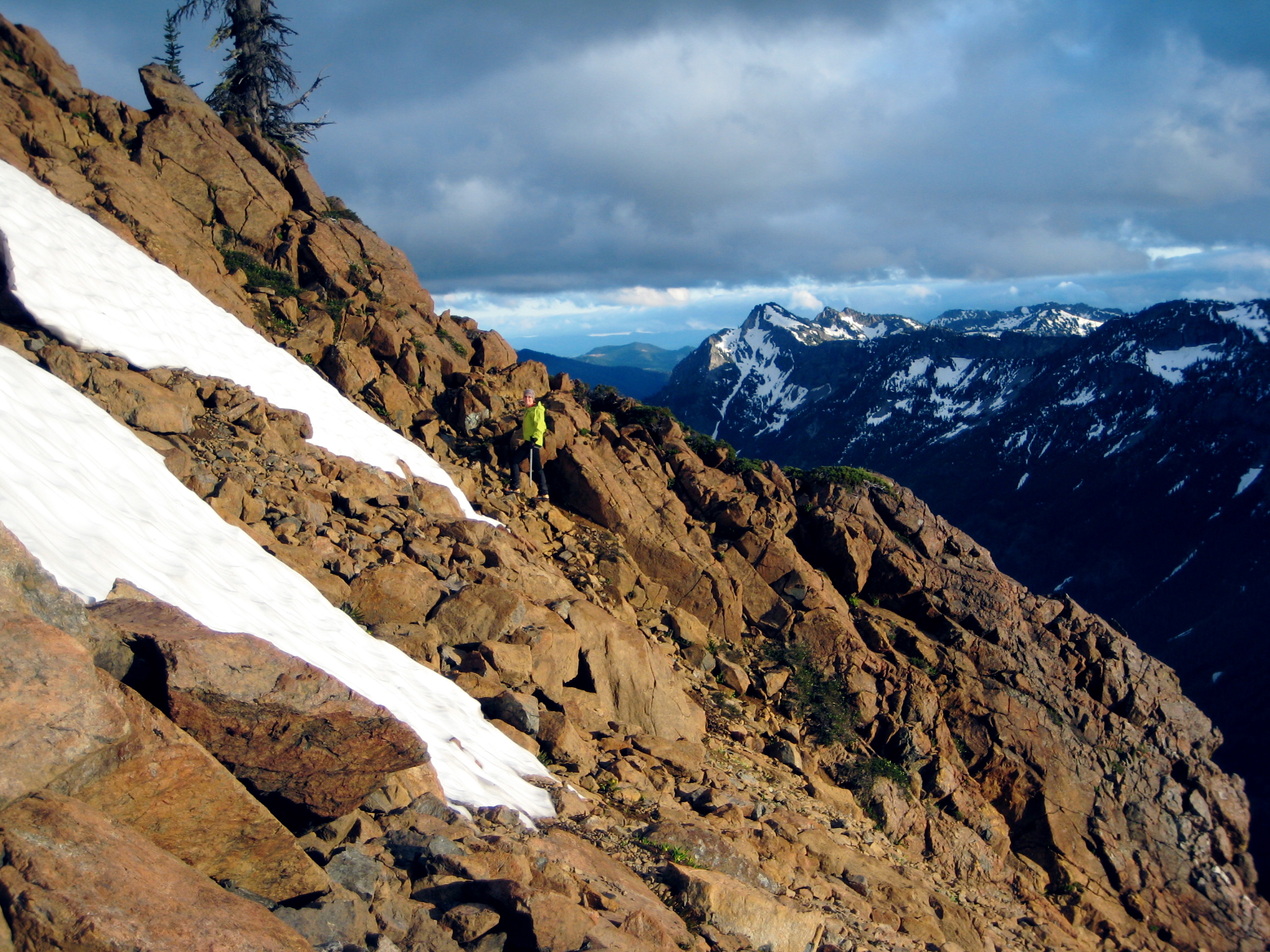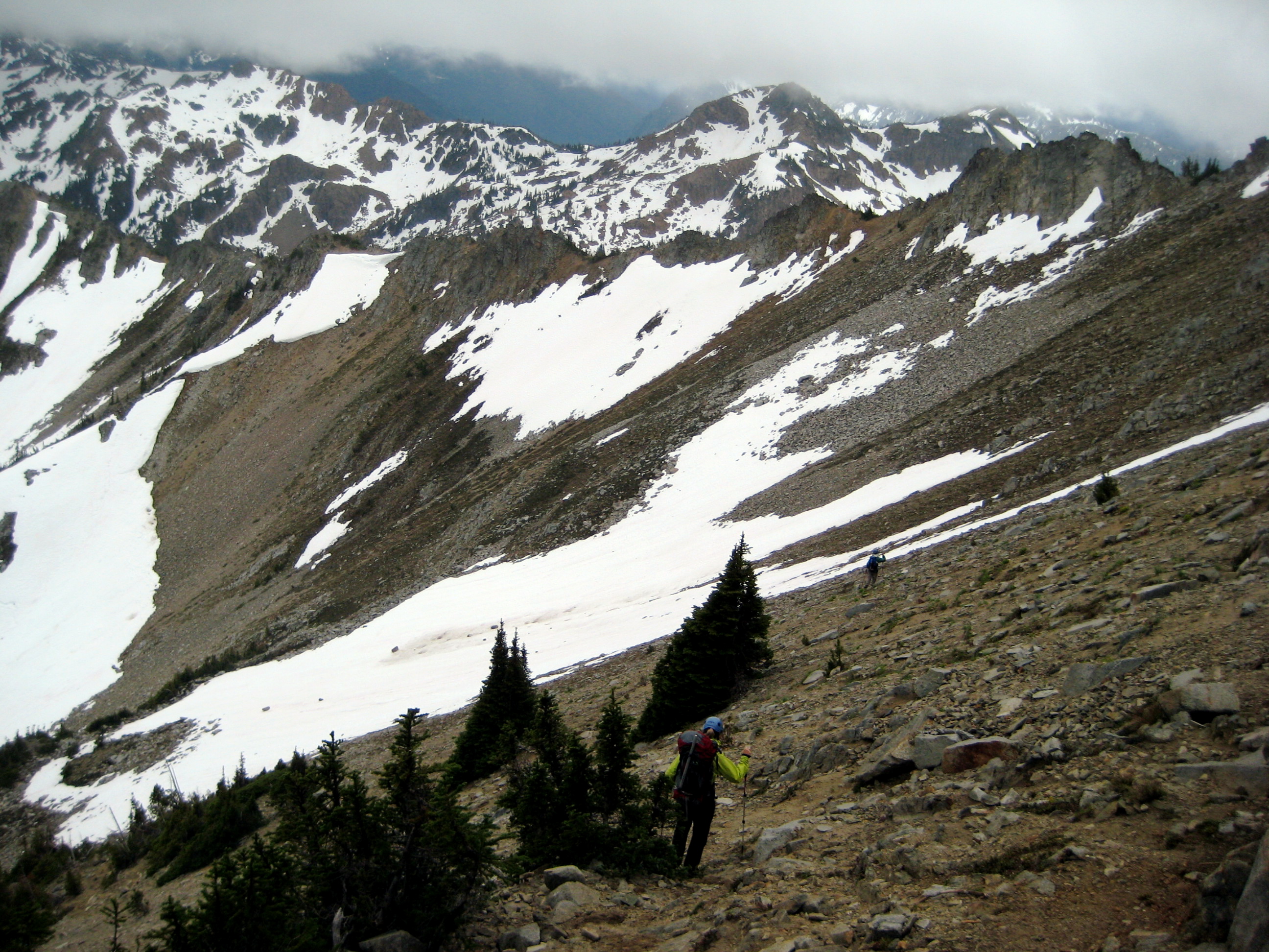 It rained off-and-on all night, and Sunday began with dark clouds, but blue skies soon prevailed. After breaking camp and hiking up to Paddy-Go-Easy Pass, we scrambled up 6573-foot Paddy-Go-North Peak for morning views.