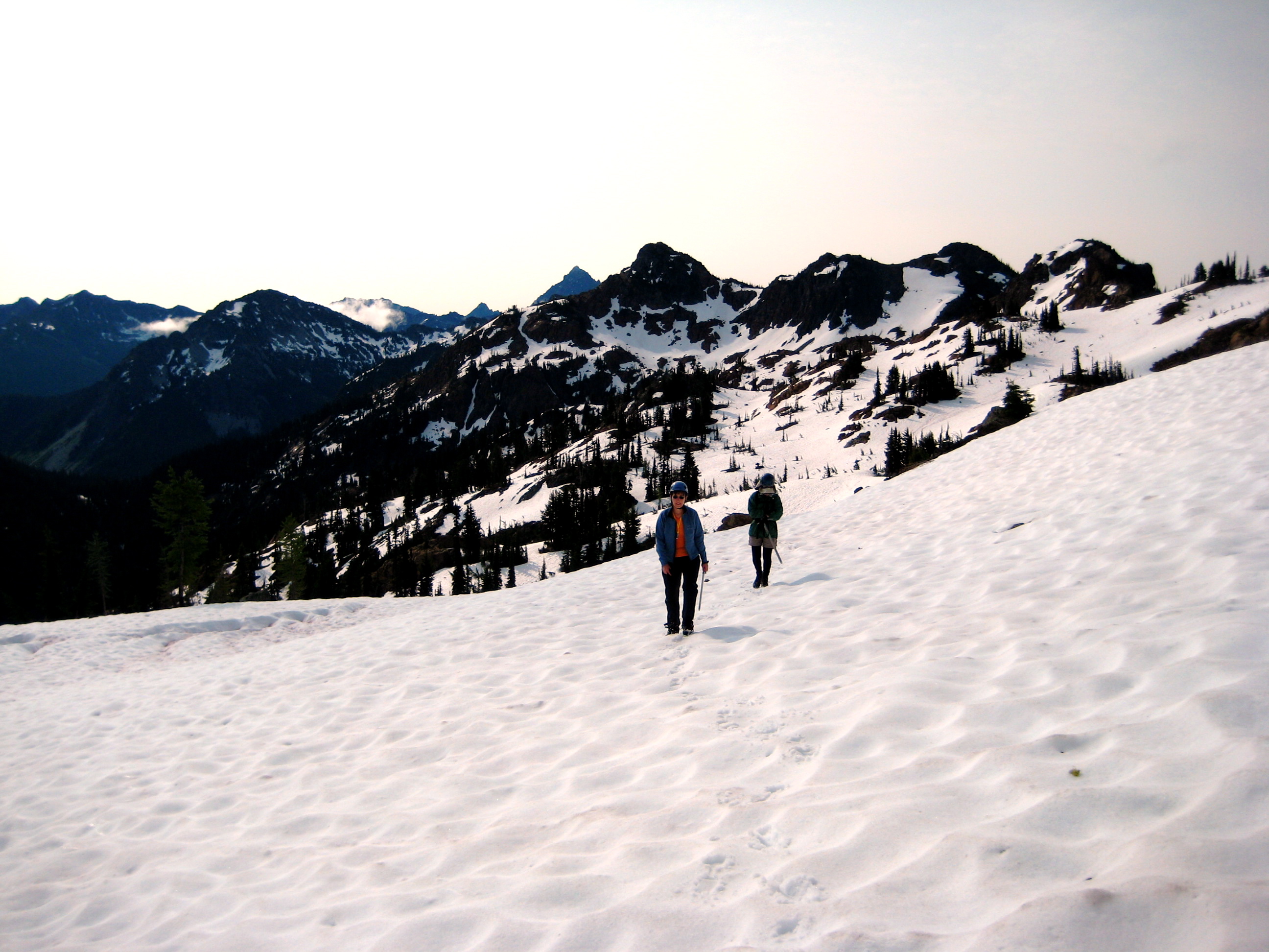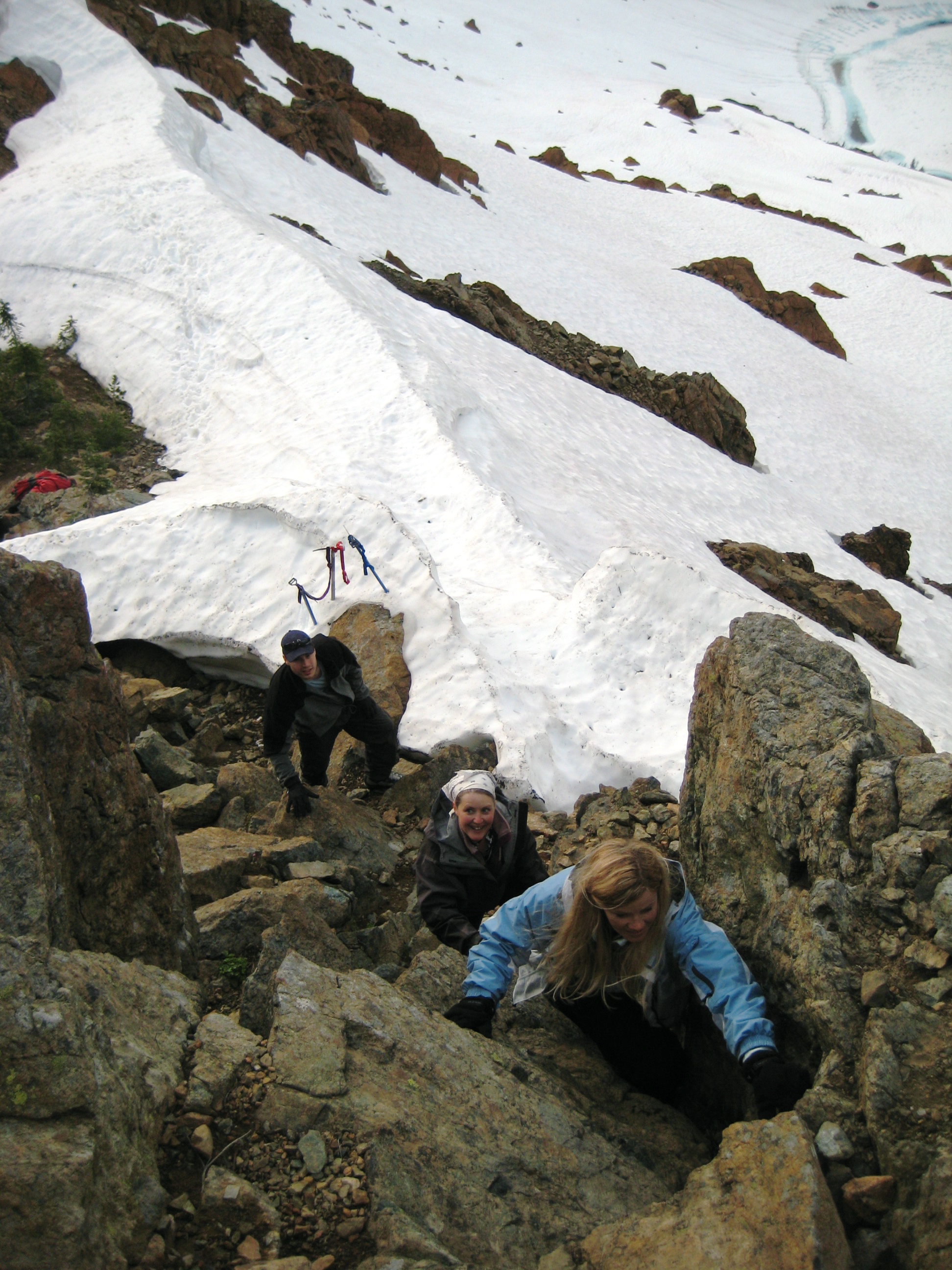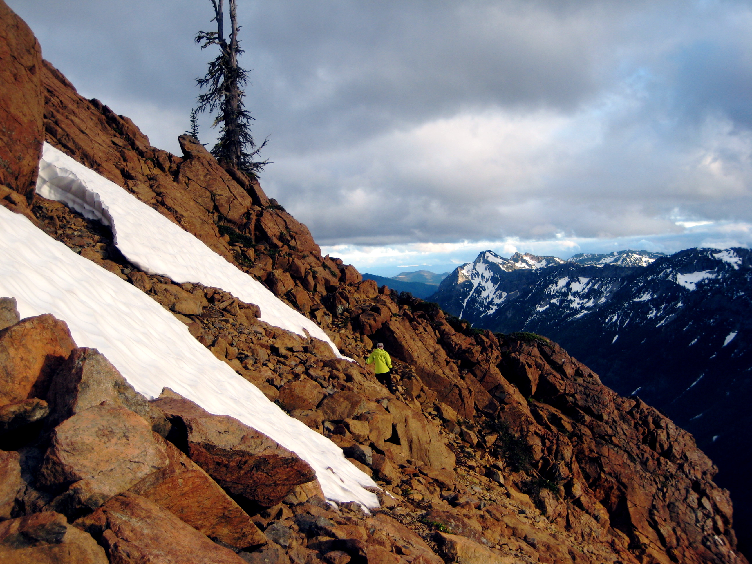 It rained off-and-on all night, and Sunday began with dark clouds, but blue skies soon prevailed. After breaking camp and hiking up to Paddy-Go-Easy Pass, we scrambled up 6573-foot Paddy-Go-North Peak for morning views.