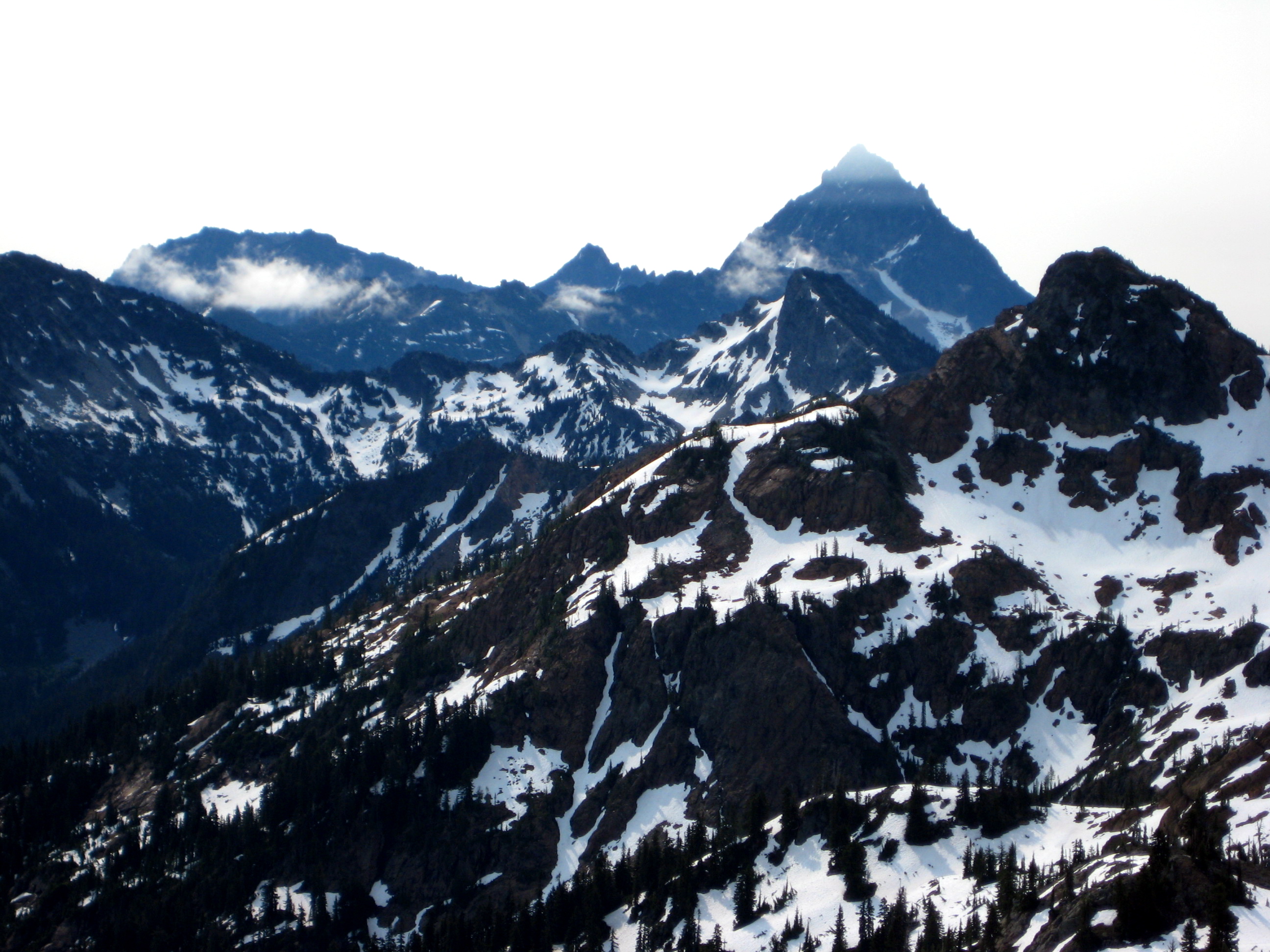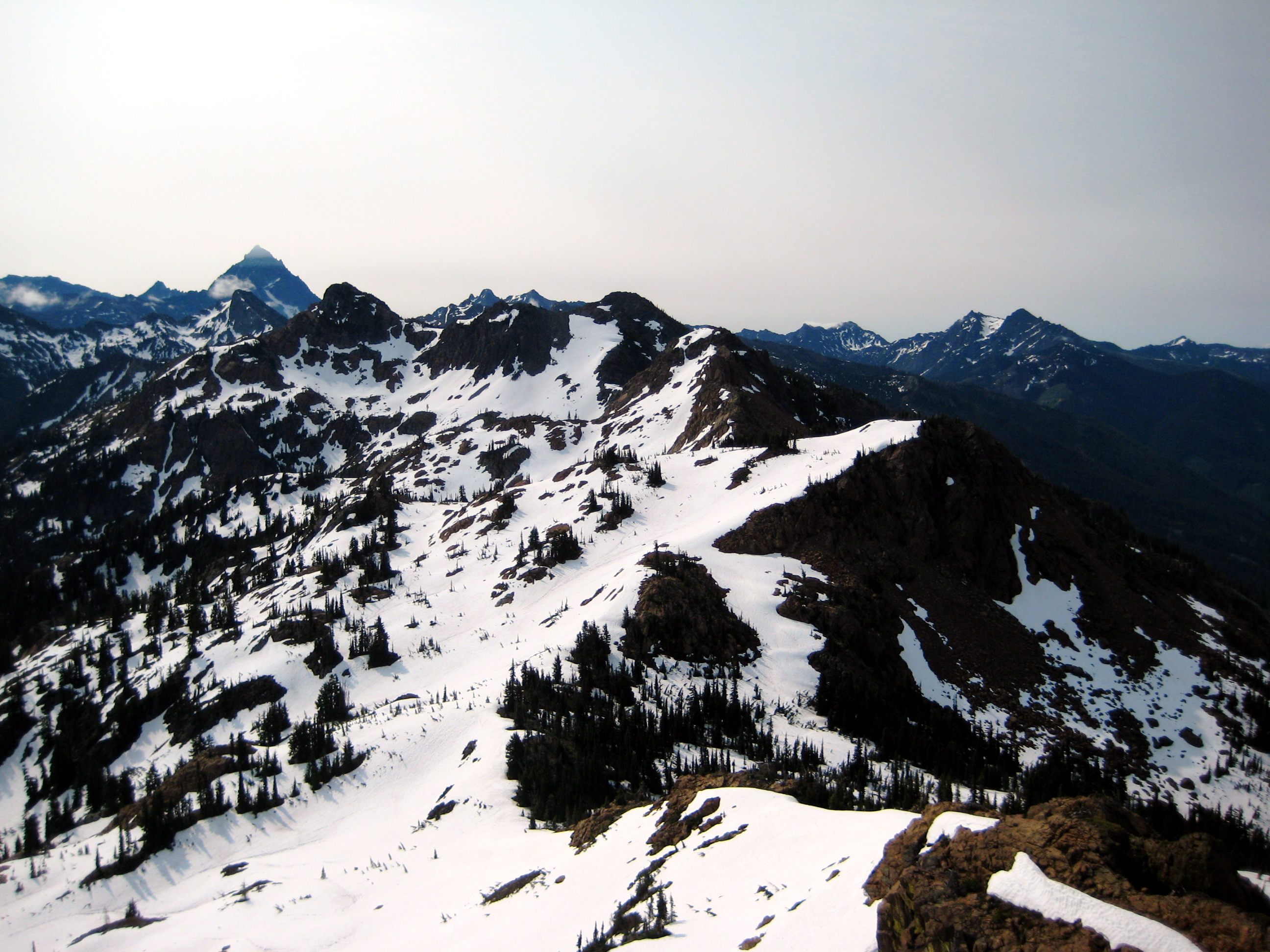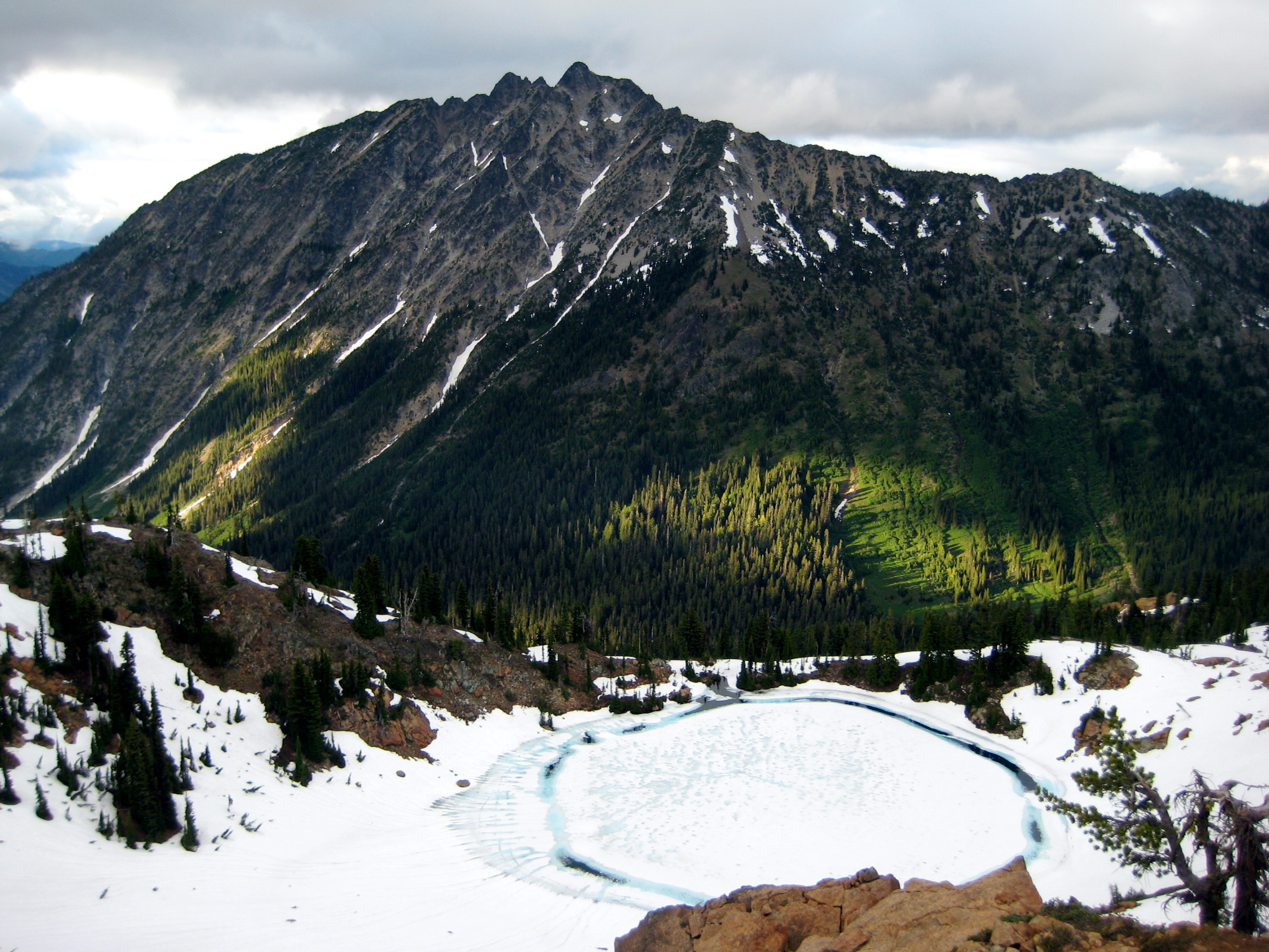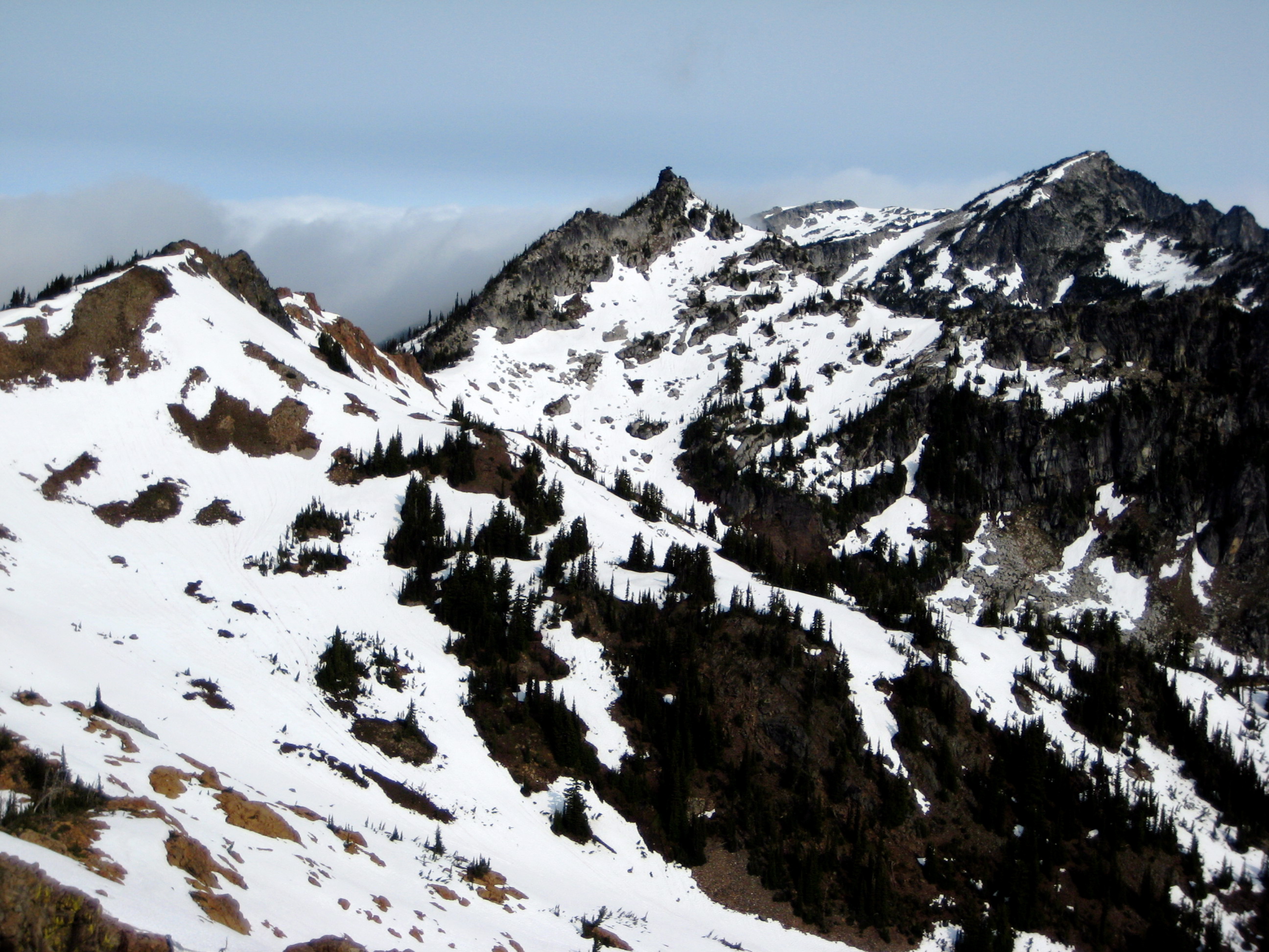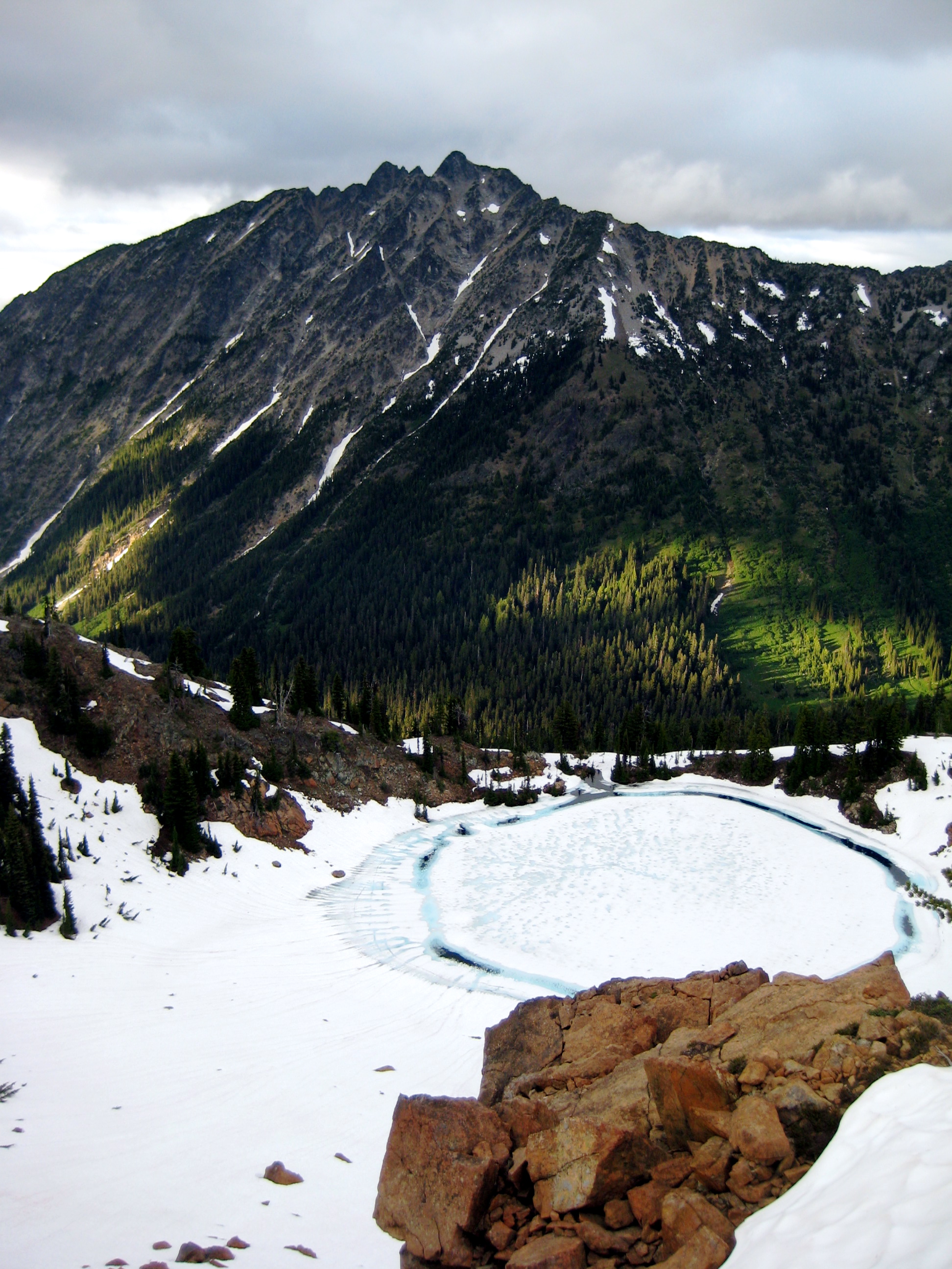 We had a great view of Mt. Daniel, The Citadel, Cathedral Rock, and The Cradle from this summit. Still-frozen Sprite Lake was visible directly below us to the east.
