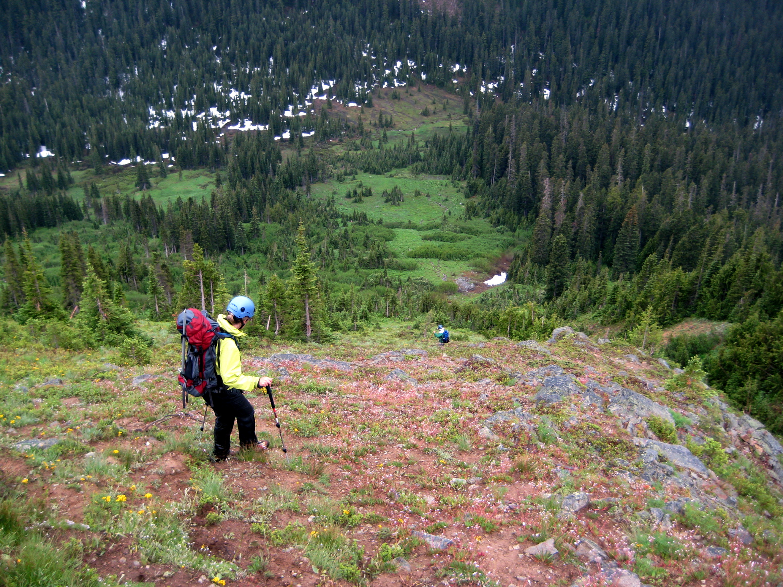 We started our descent at 4:00pm and found a wonderfully open grassy slope that led all the way to the broad French-Meadow Saddle, which separates French Creek and Meadow Creek. It was raining steadily when we rolled into camp that evening, cold and wet.
