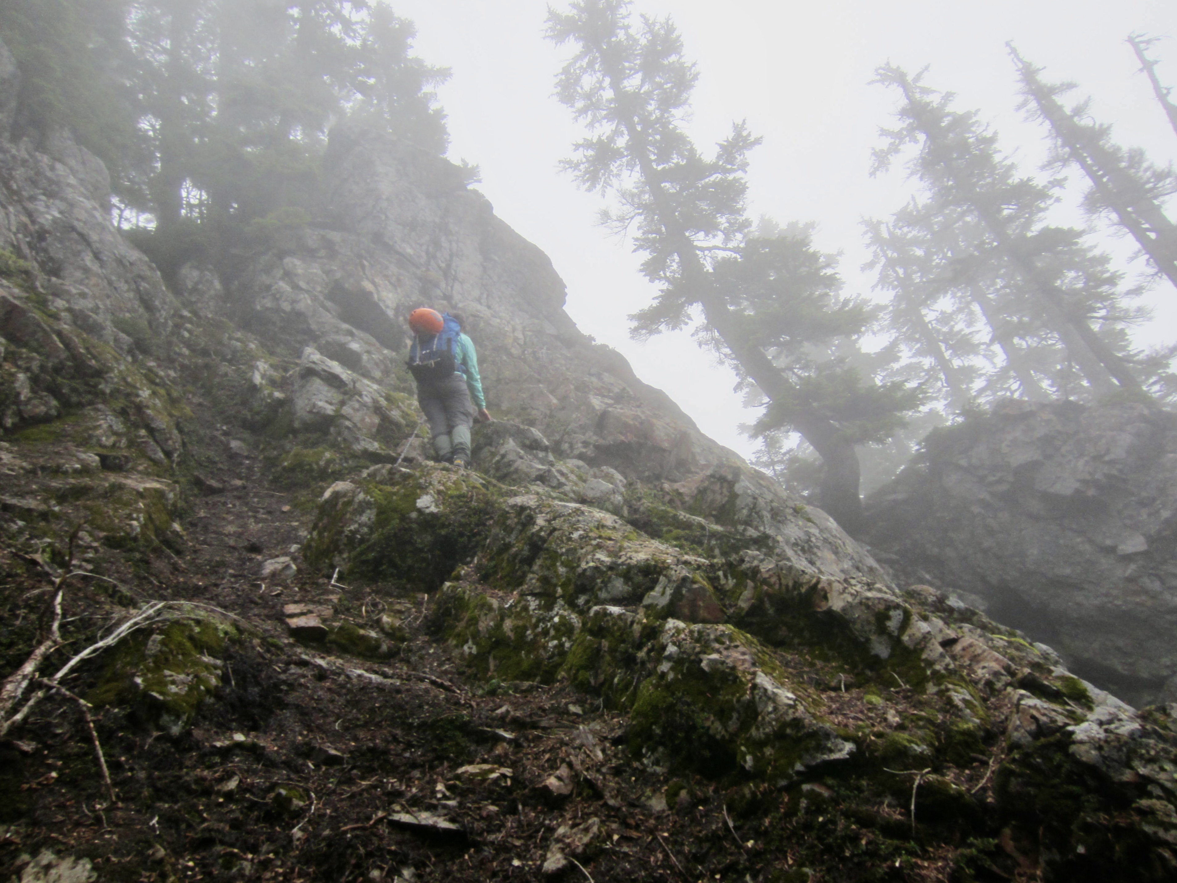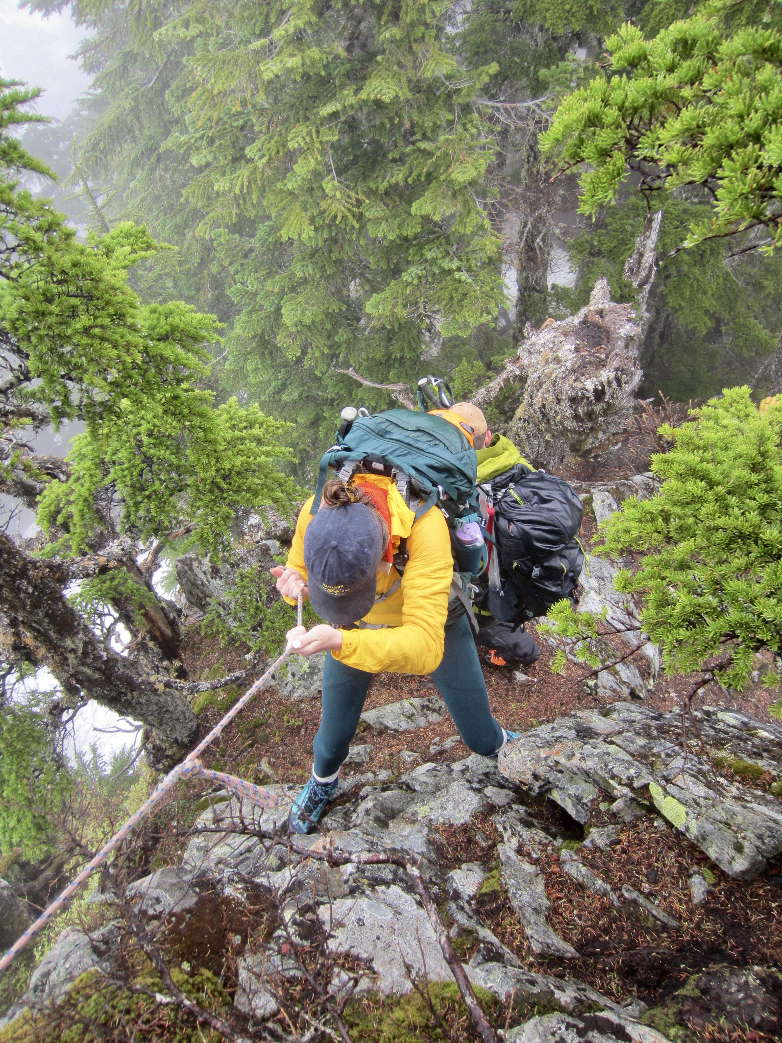 Upon reaching the ridge saddle closely below Thompson Point, we worked our way northeasterly along the crest. This involved following a brushy climber’s path (getting soaked in the process), down-climbing a rock step with the aid of a fixed rope, and booting along a ribbon of snow.