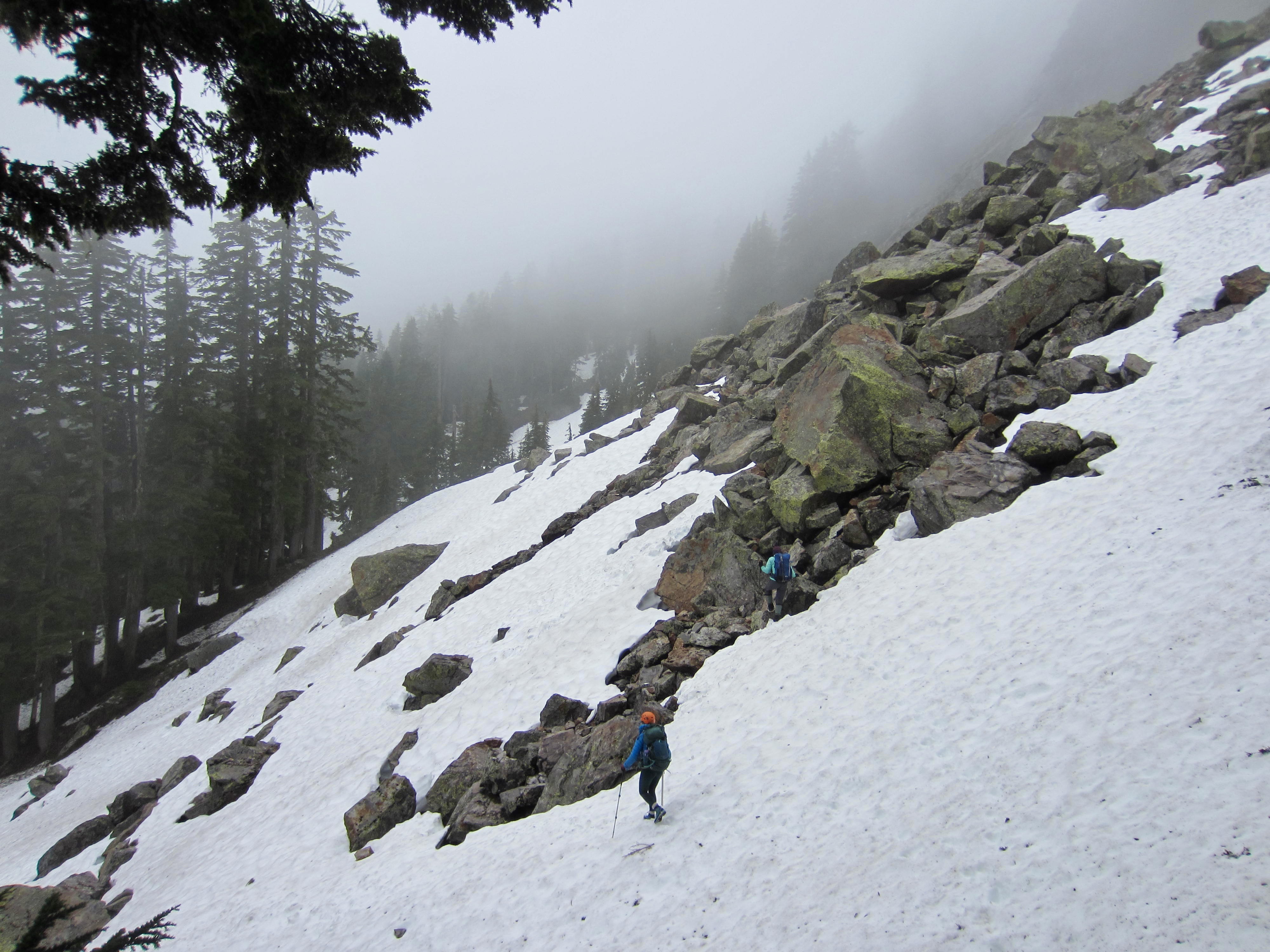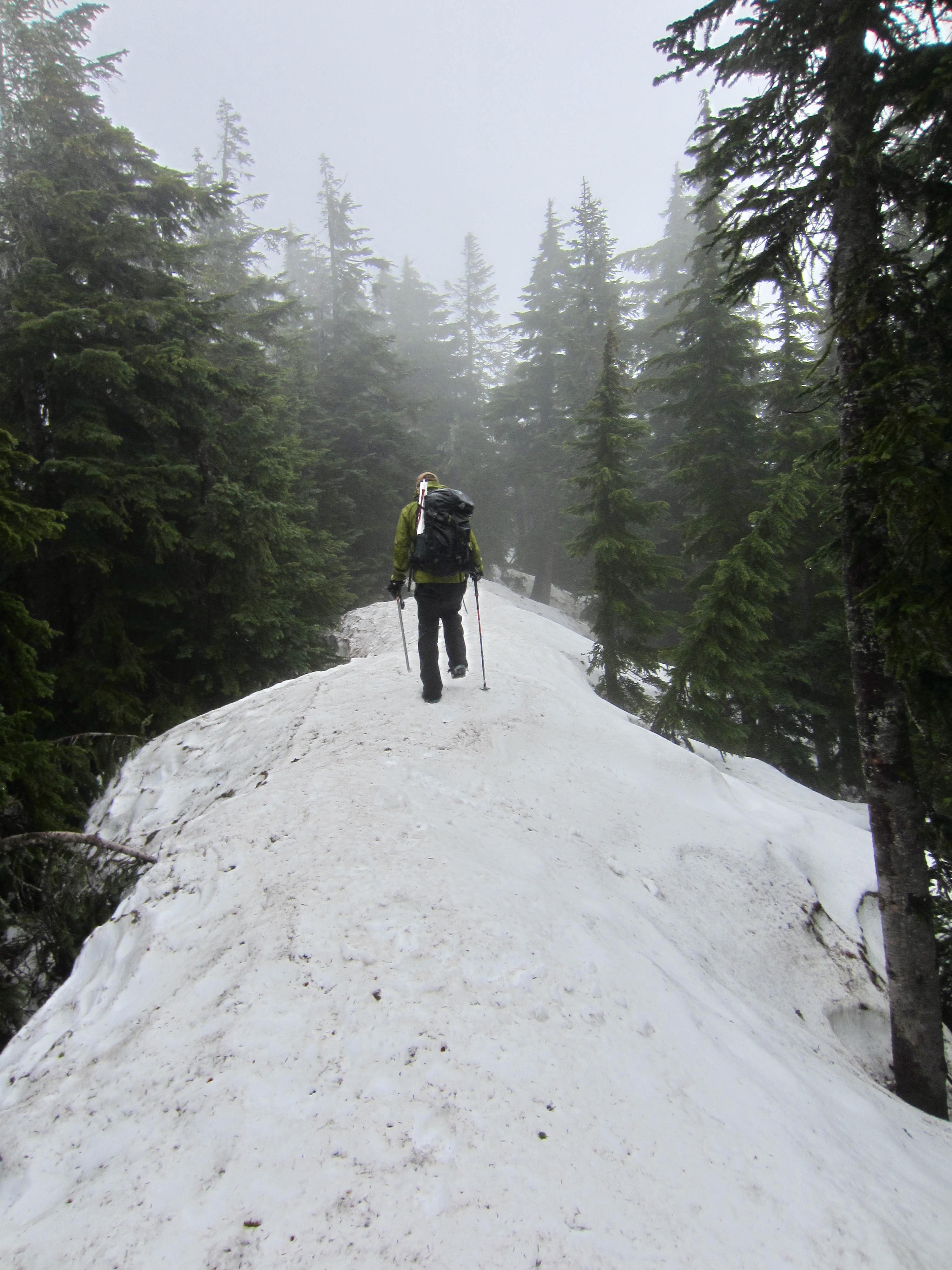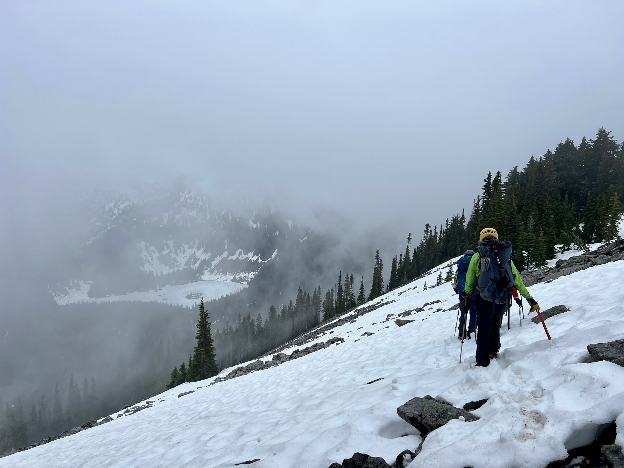 After a night of rain showers, we awoke to dry but still-foggy weather, with visibility hovering around 75 yards. We began our traverse over to Revolution Peak by walking out a northeast-trending spur road and then cutting straight uphill to gain the Thompson-Revolution saddle. Most of this steep hillside was covered by firm snow that offered good step-kicking conditions without crampons.
