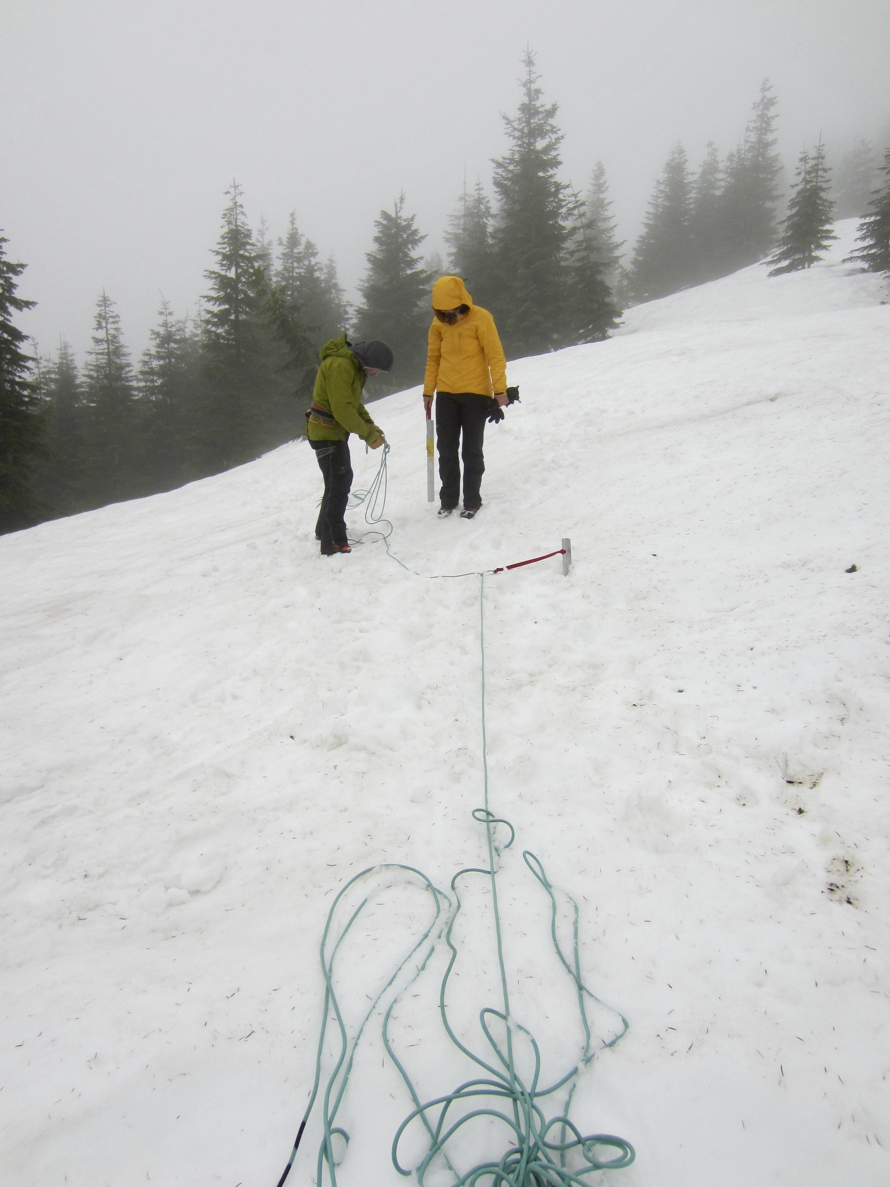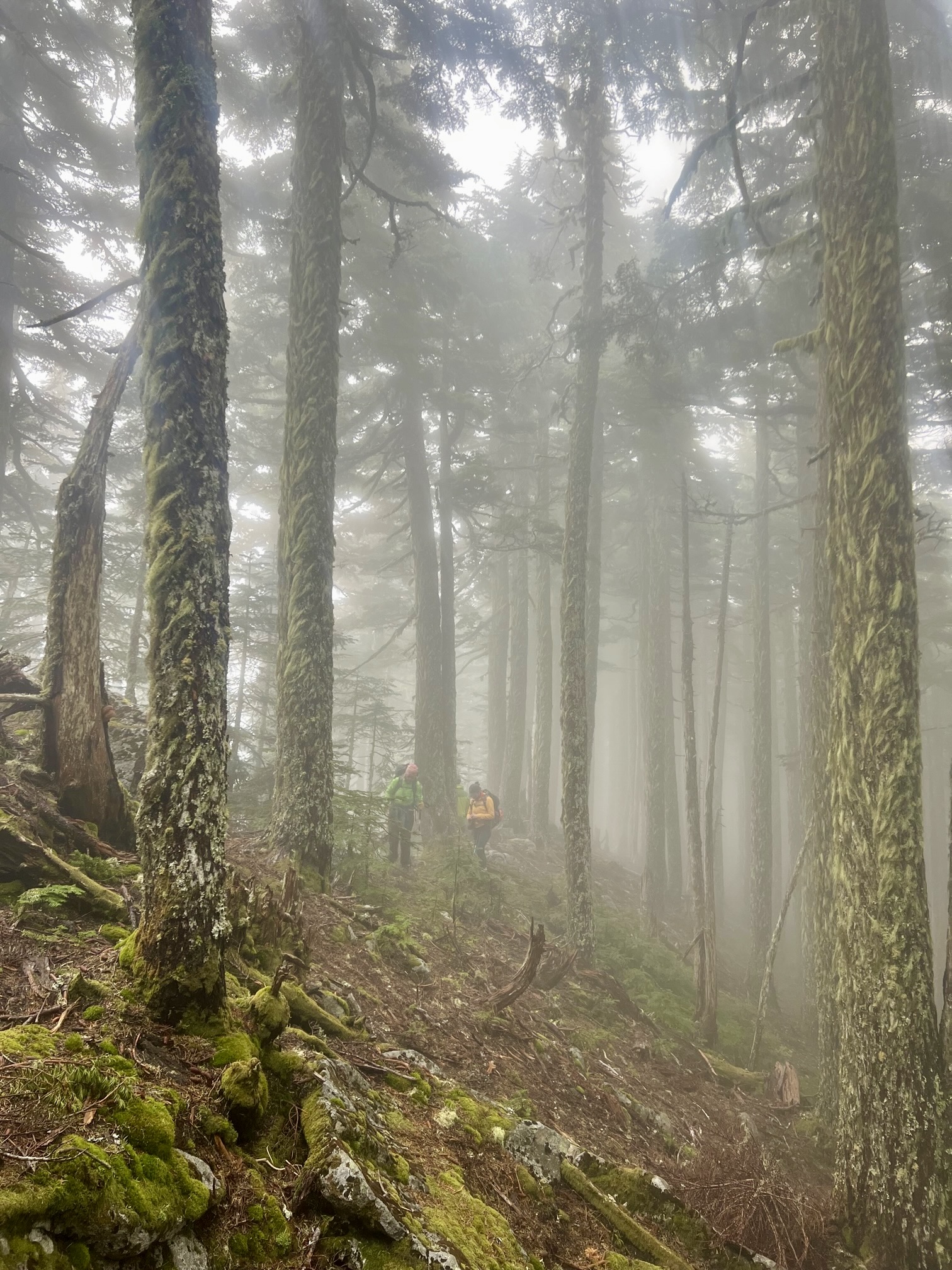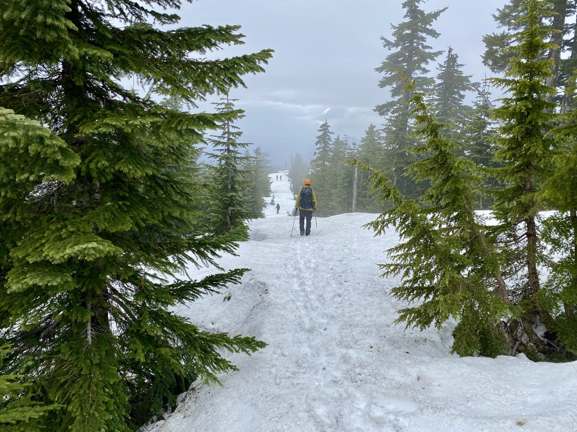 After a night of rain showers, we awoke to dry but still-foggy weather, with visibility hovering around 75 yards. We began our traverse over to Revolution Peak by walking out a northeast-trending spur road and then cutting straight uphill to gain the Thompson-Revolution saddle. Most of this steep hillside was covered by firm snow that offered good step-kicking conditions without crampons.