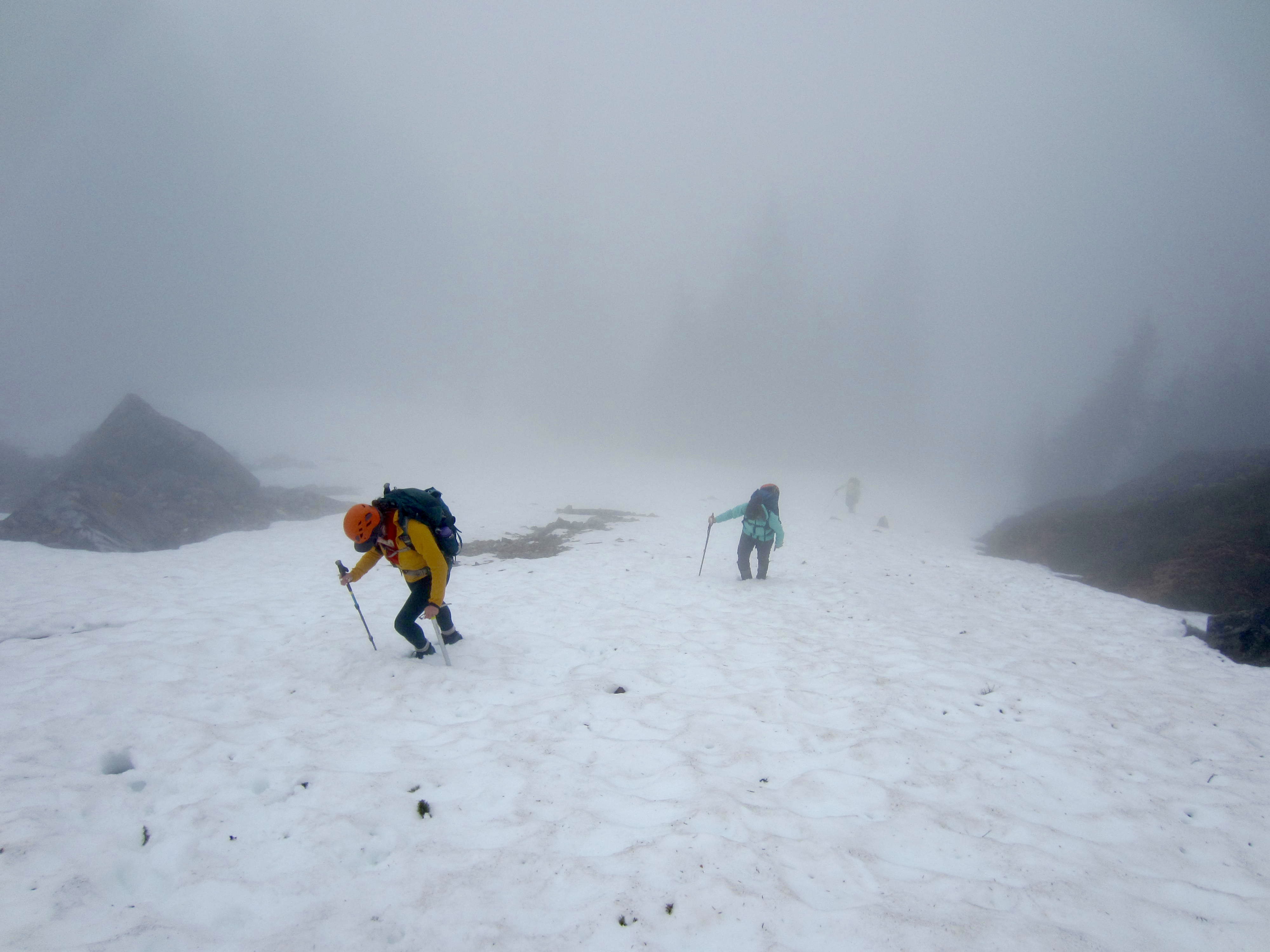 In mid-afternoon, we arrived at a 4800-foot bench on the south ridge of Thompson Point (5.2 hours + 5.5 miles + 3950 feet from TH). A large patch of bare ground here provided a nice campsite for our three tents. Unfortunately, we were enveloped in a cold fog with no view. Eileen and Andrew spent the remainder of our afternoon practicing some snow-climbing techniques, while Brooke and Kellie hunkered down in their tent and I melted snow for drinking and cooking water.