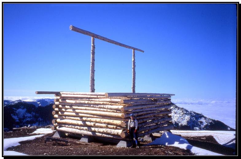 To descend, we initially went down the east ridge and then angled across the northeast slope. At an elevation around 4700 feet, we began a long northward traverse through pleasantly open forest. Snow conditions were very good for booting, but wherever the snow was underlain by a talus field, our feet would unexpectedly punch through. This situation was very stressful and greatly slowed our progress.