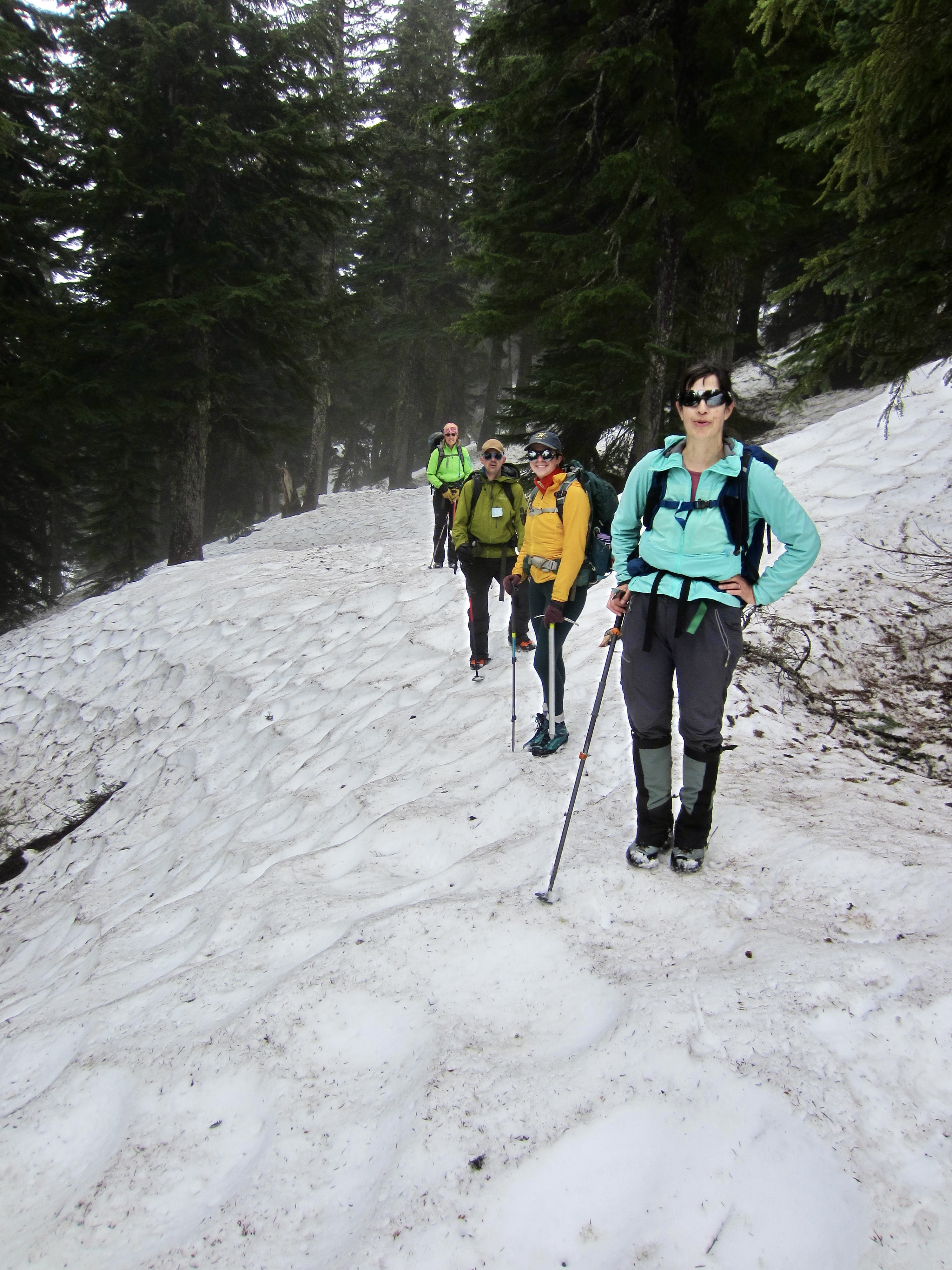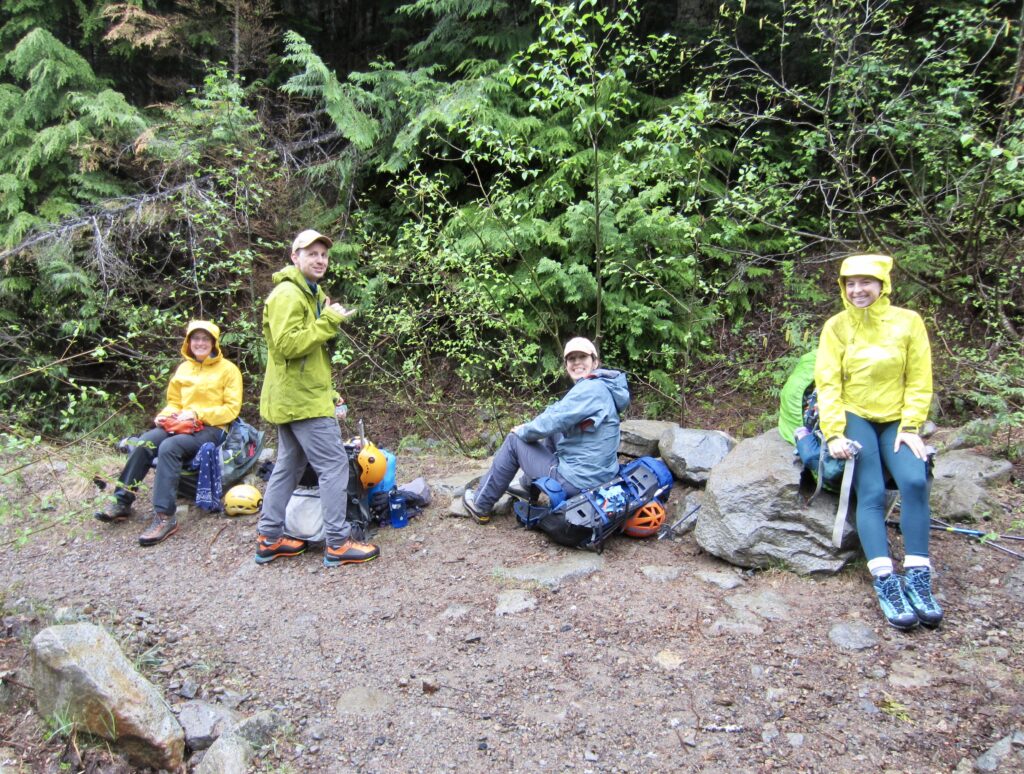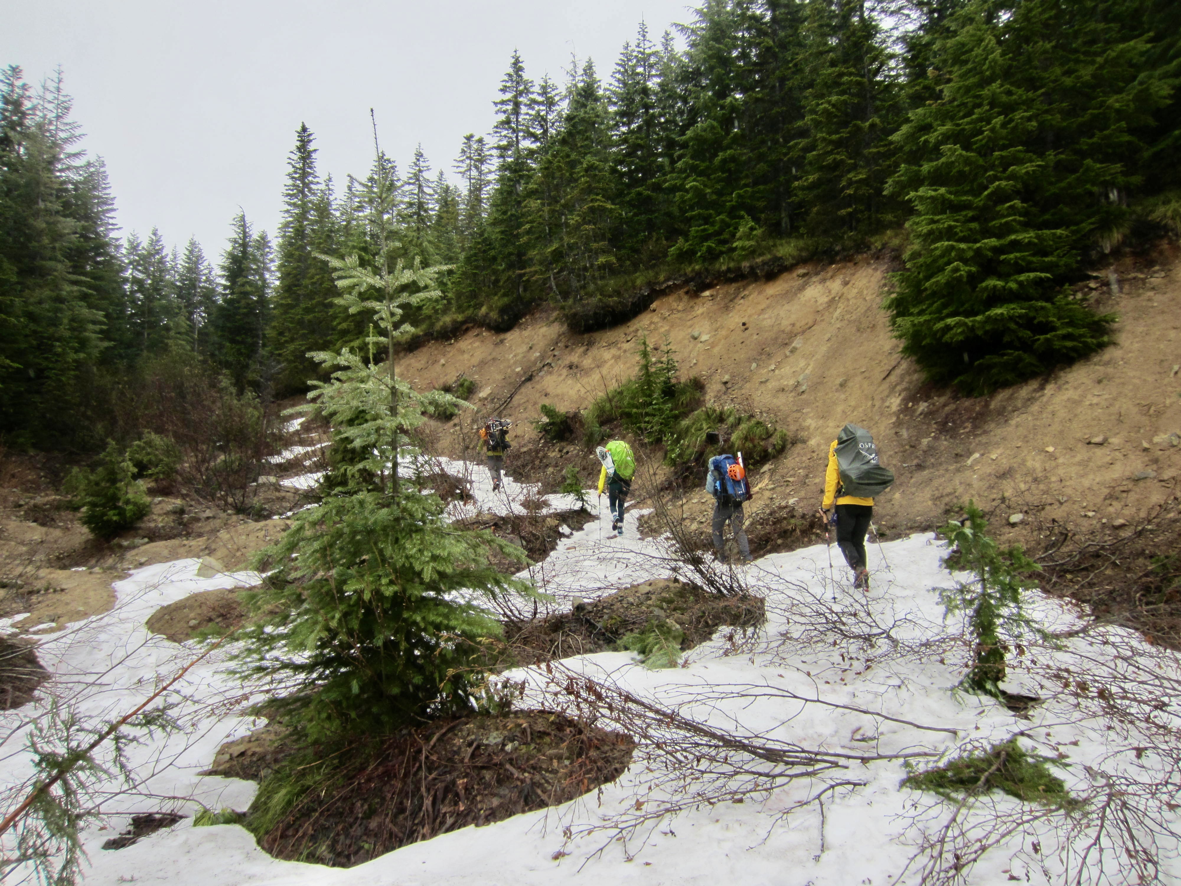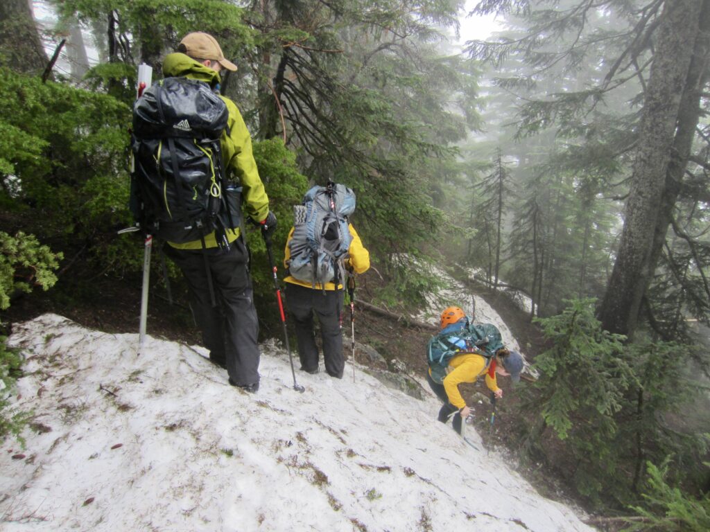 Starting at the Granite Creek Trailhead on a cool, drizzly Monday morning, we hiked up the trail (an abandoned logging road) laden with camping gear, snowshoes, crampons, snow pro, and other climbing paraphernalia. Not knowing what snow and rock conditions we would encounter, it seemed prudent to prepare for almost anything, and this resulted in big, unwieldy backpacks.