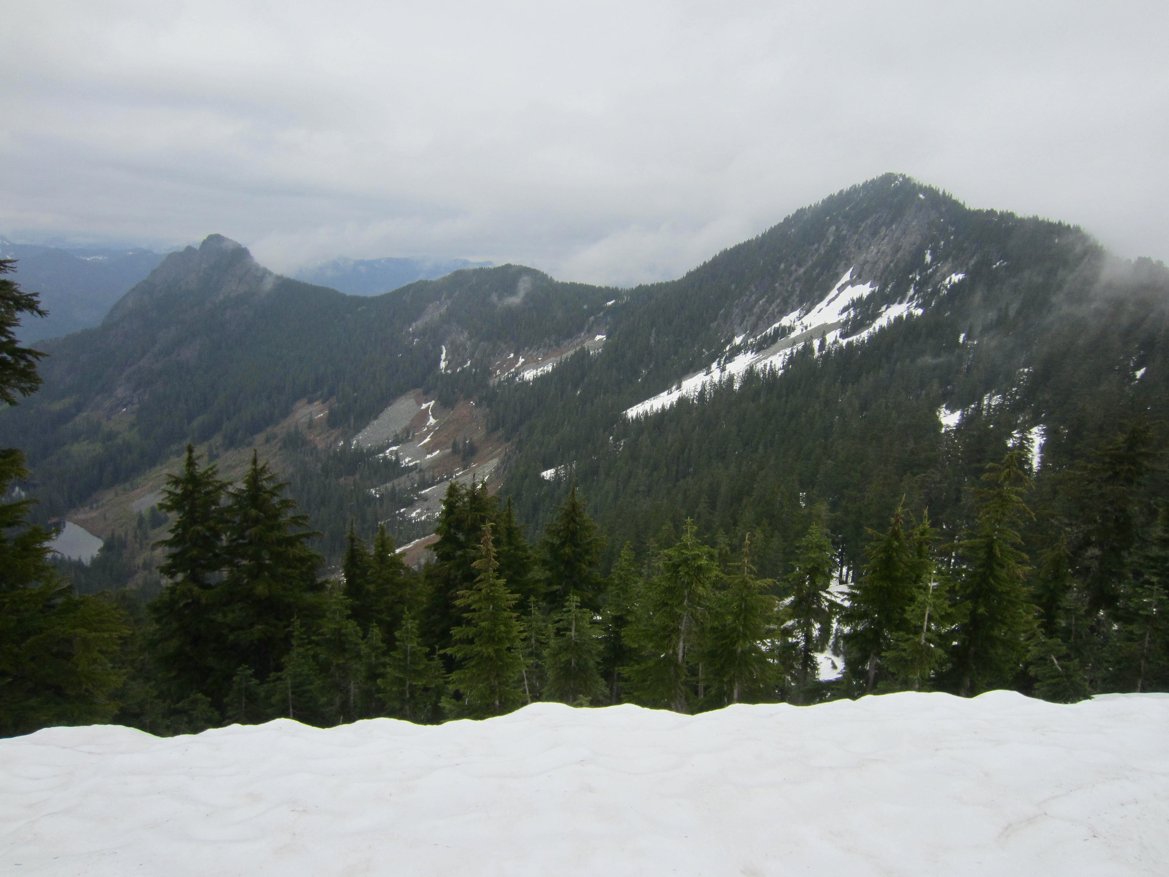 Eileen, Brooke, Kellie, Andrew, and I made an early-season climbing attempt on Revolution Peak and Russian Butte in the Lower Snoqualmie Range. We were successful on the former summit but not on the latter. Although snow conditions were quite favorable for both summits, the weather refused to live up to our optimistic spin on a marginal forecast.