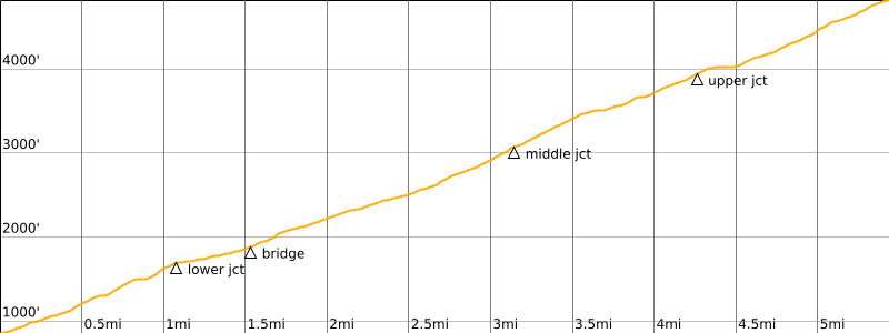 Having hiked and snowshoed up this road-trail at the same time last year, I was surprised how much less snow there is this year. We didn’t hit patchy snow until an elevation of about 3300 feet, and continuous snow didn’t start until 4300 feet. A positive result was that snowshoes were not needed.