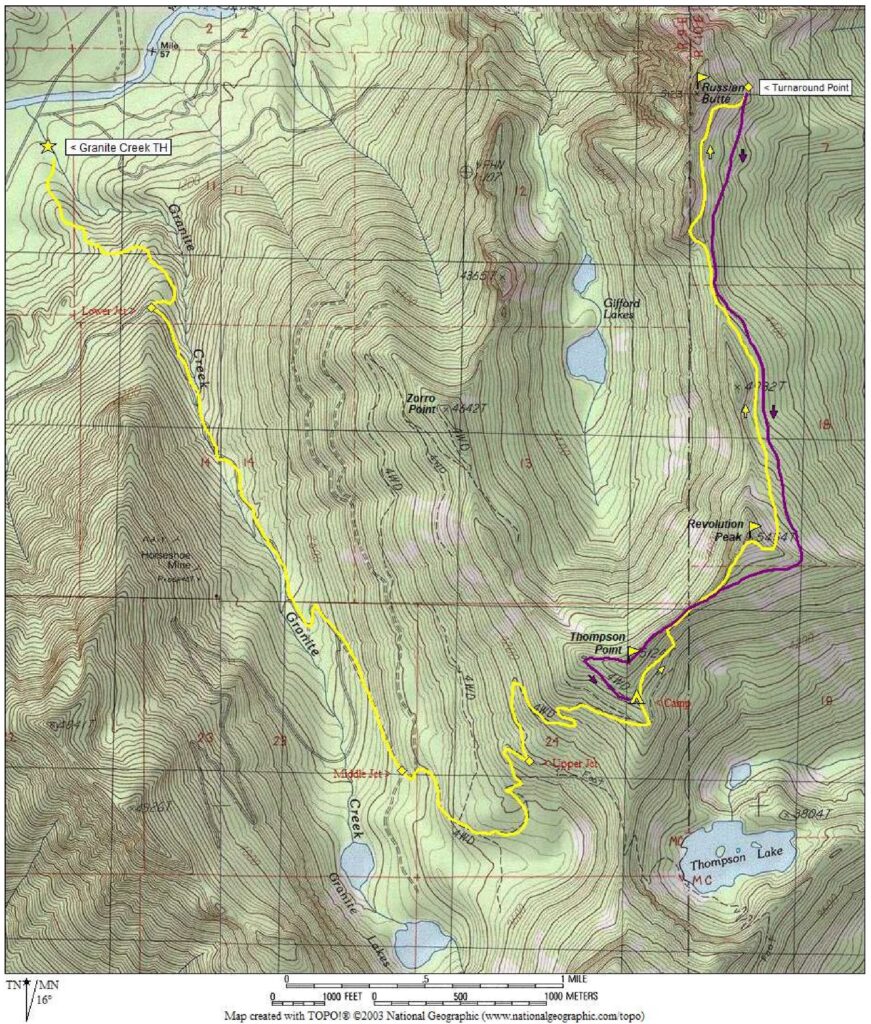 Way Points: Granite Creek Connector Trail junction & Granite Creek Bridge & Granite Lakes Trail junction & Thompson Lake Trail junction & Thompson Point bench (trail hike & snow hike)