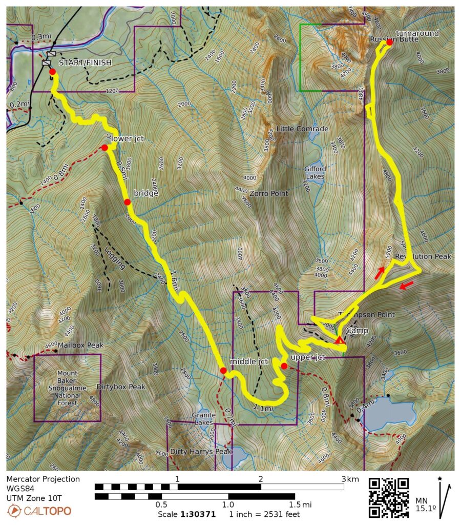 Sidetrip: Thompson-Revolution Saddle & Revolution Peak summit & Revolution-Russian Saddle & Russian Butte slope; return via Thompson Point summit (snow hike & snow climb & rock scramble)