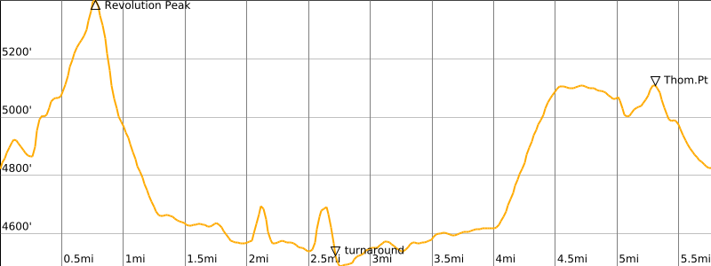 Rather than climbing back over the summit of Revolution Peak, we crossed its east ridge at 5100 feet and then contoured into the Thompson-Revolution saddle. Our final deviation was to hike over the top of 5124-foot Thompson Point and then descend an old logging road down the west ridge.