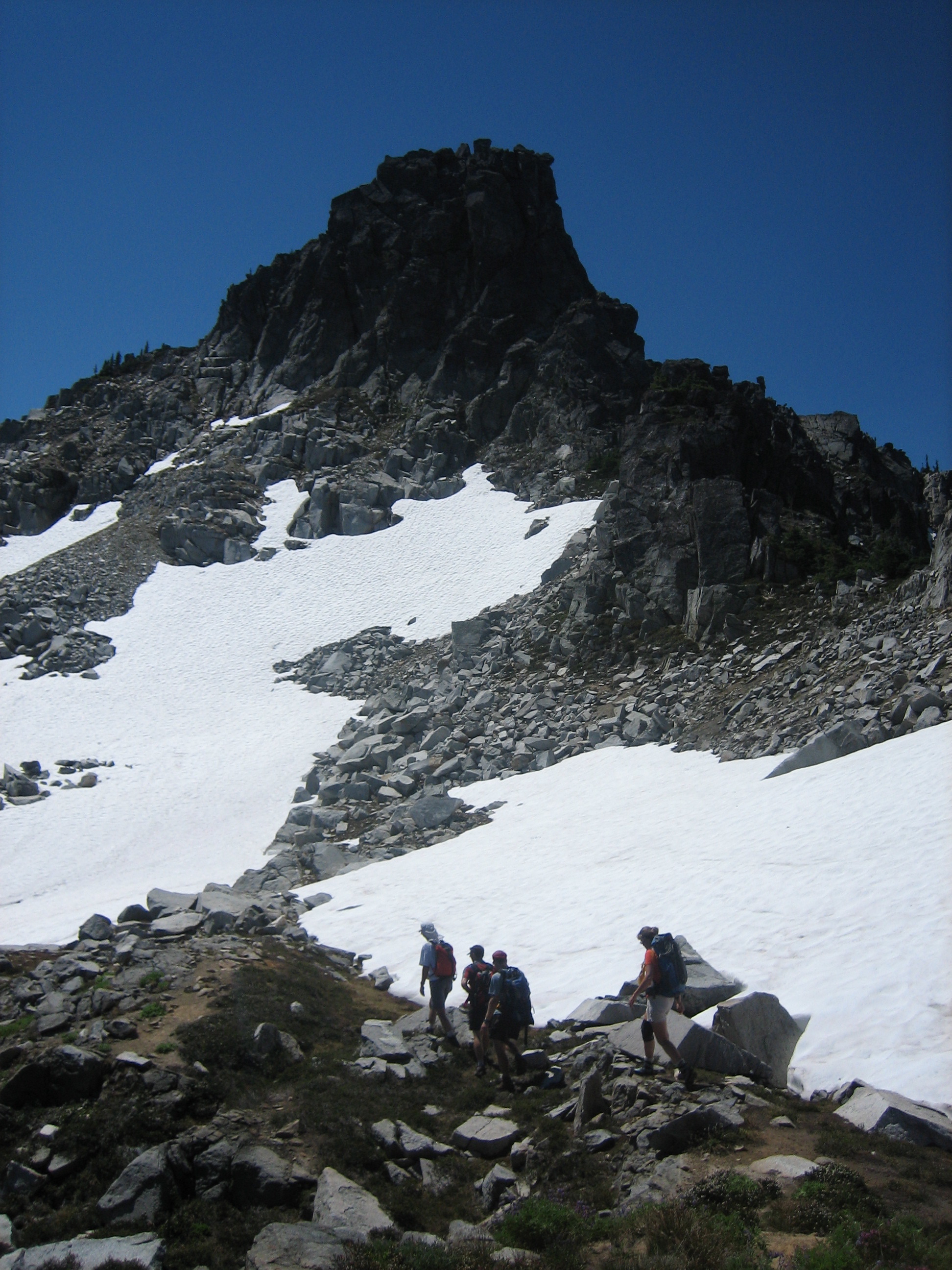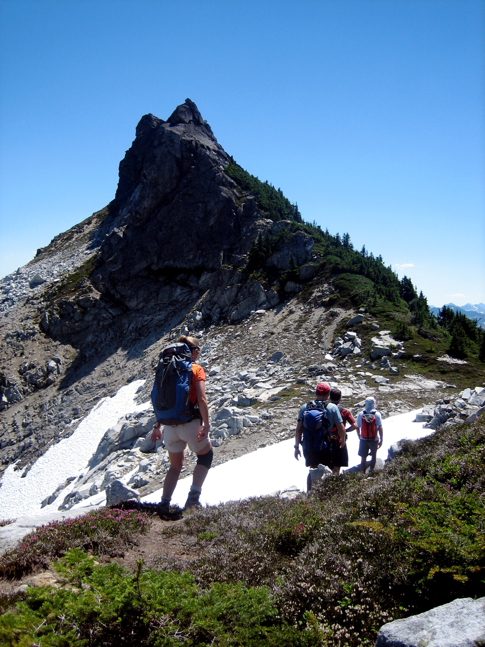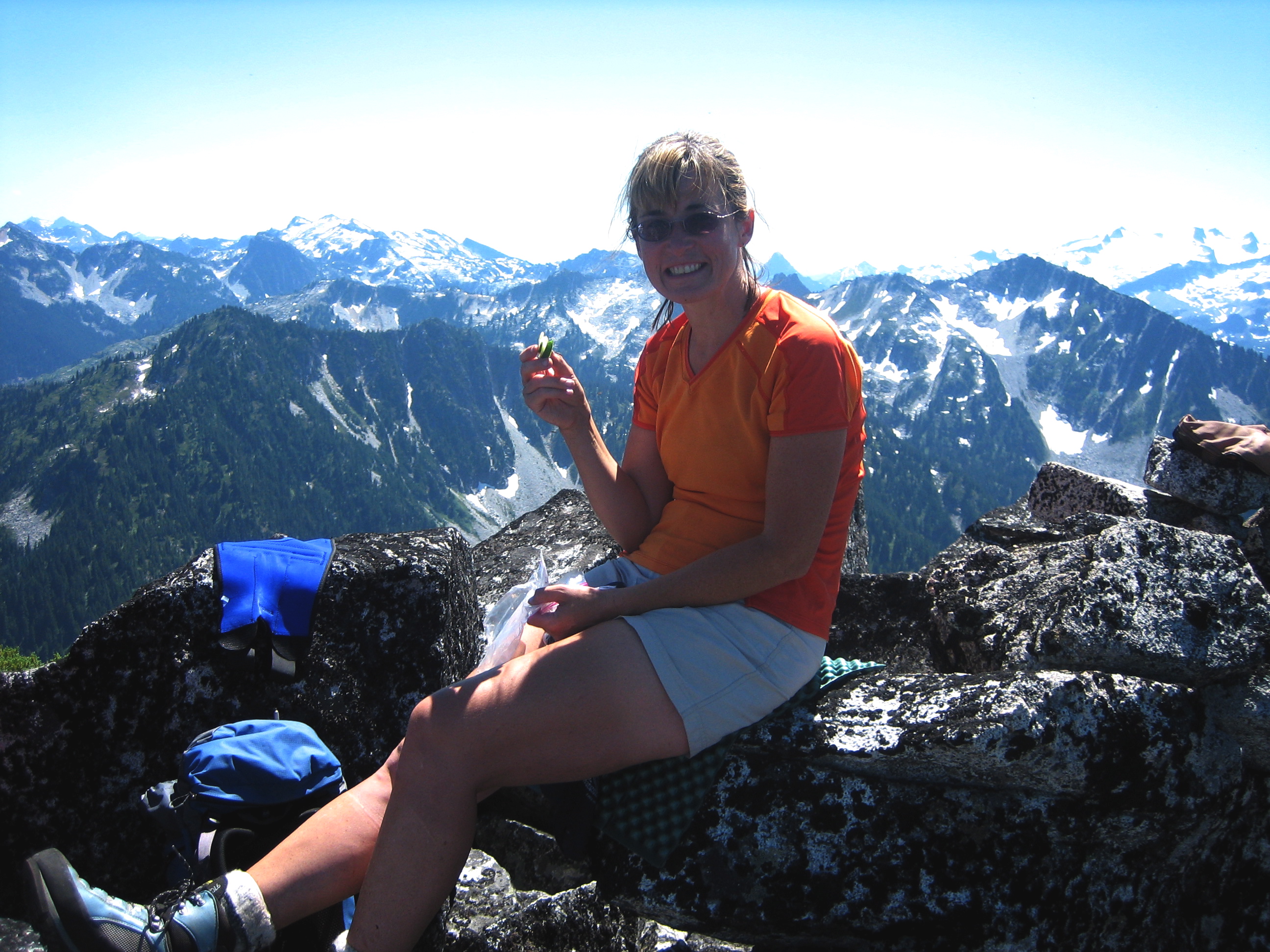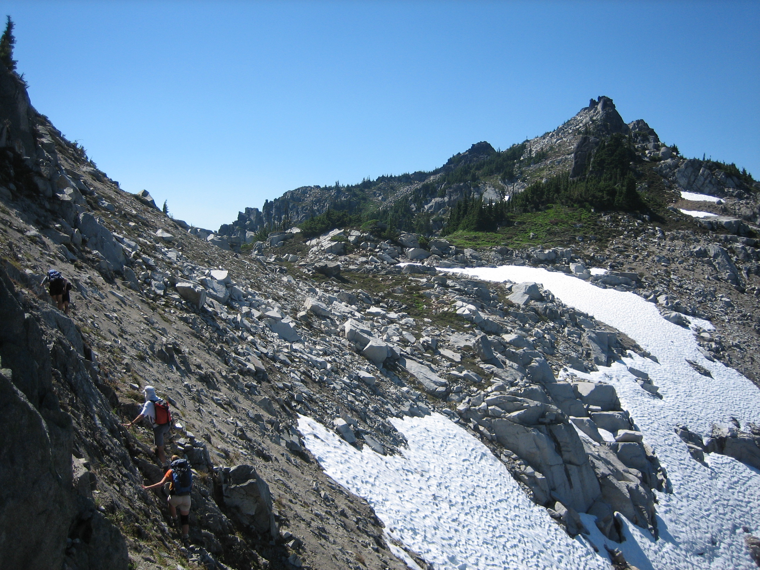 … scrambled down steep heather and Class 2-3 rock to a 6200-foot saddle, then strolled up alp slopes to Thor Peak’s panoramic summit. The summit register was a glass jar with a roll of steno paper. We were the first group signing in for 2006.