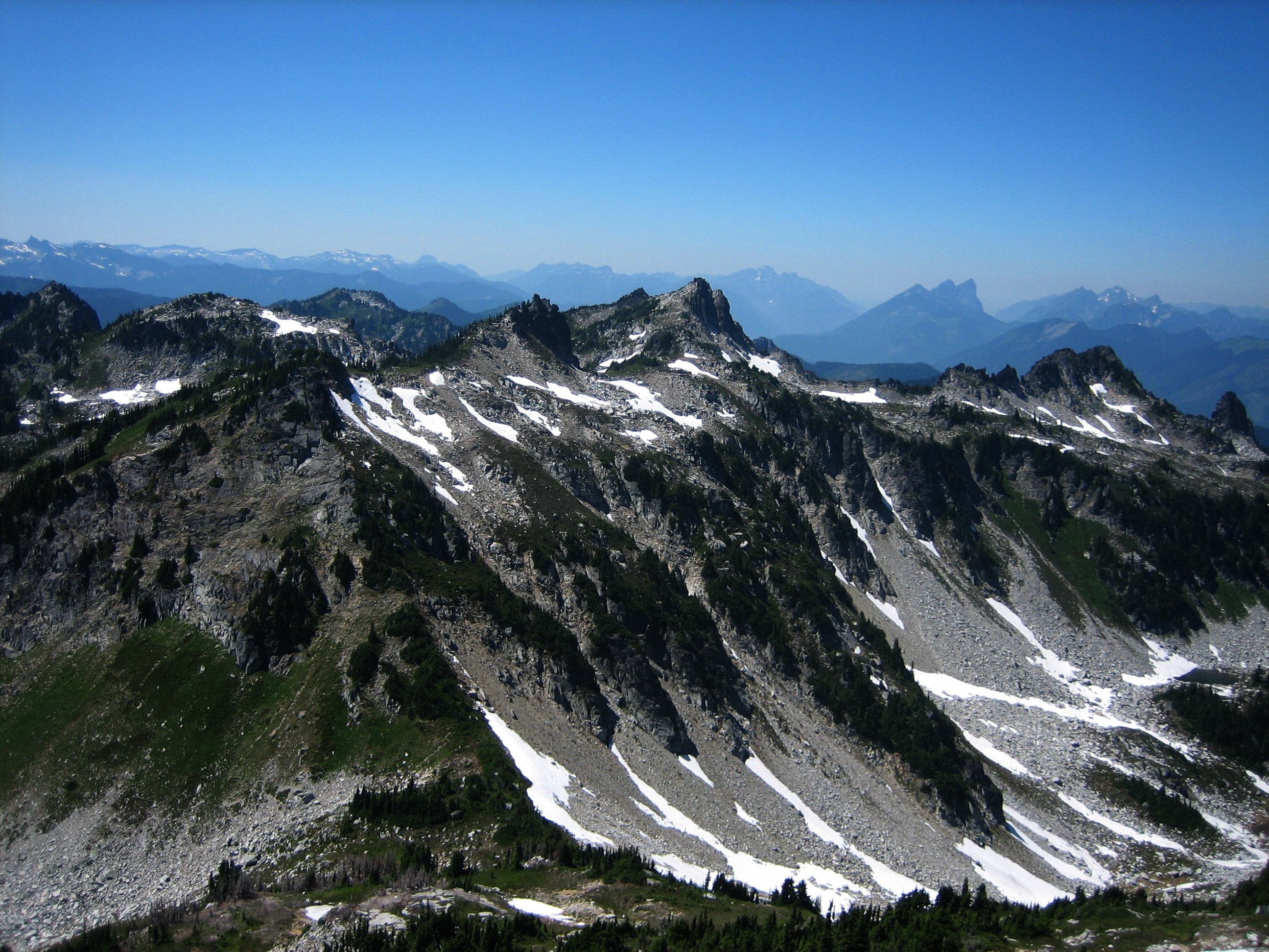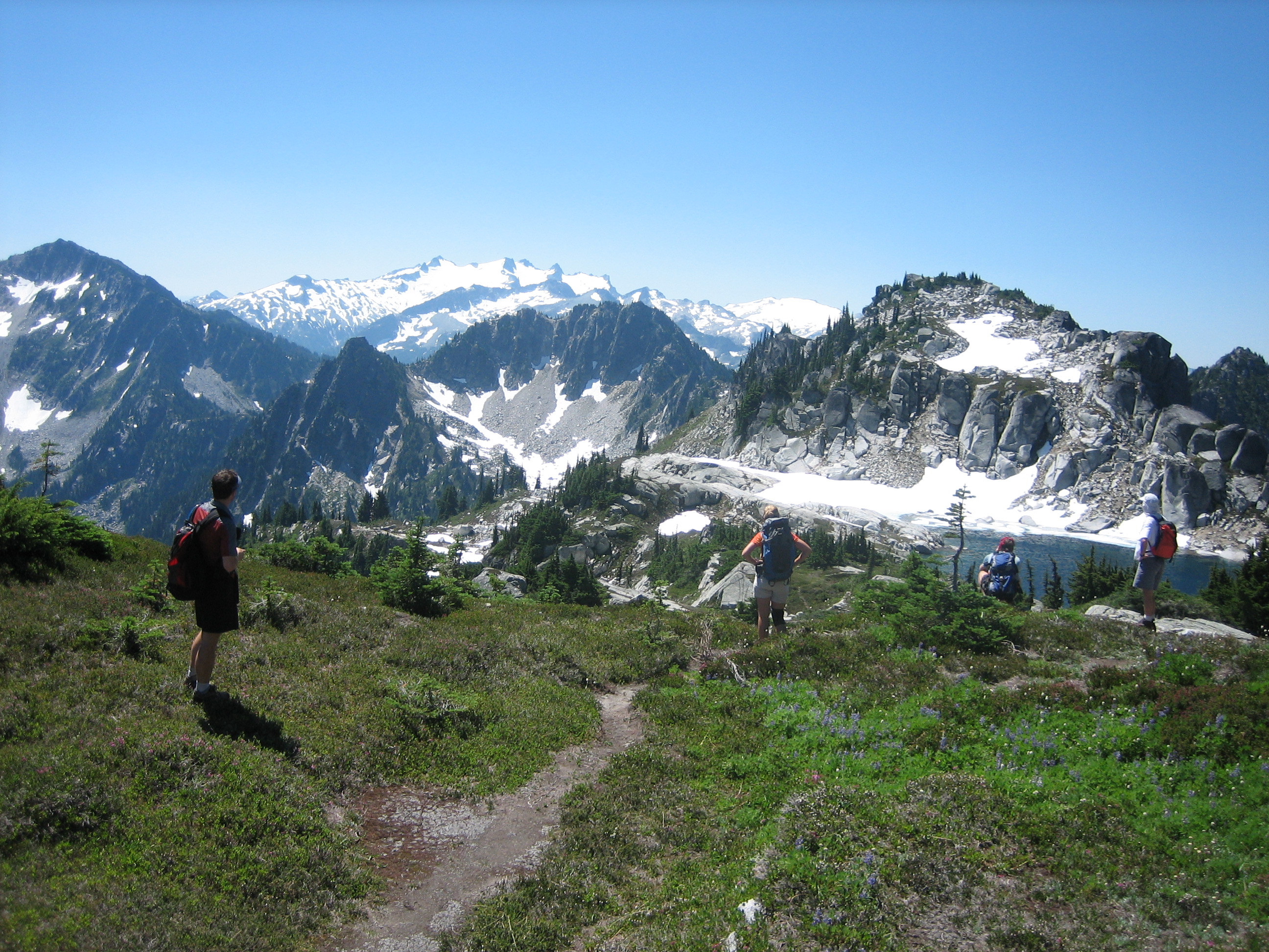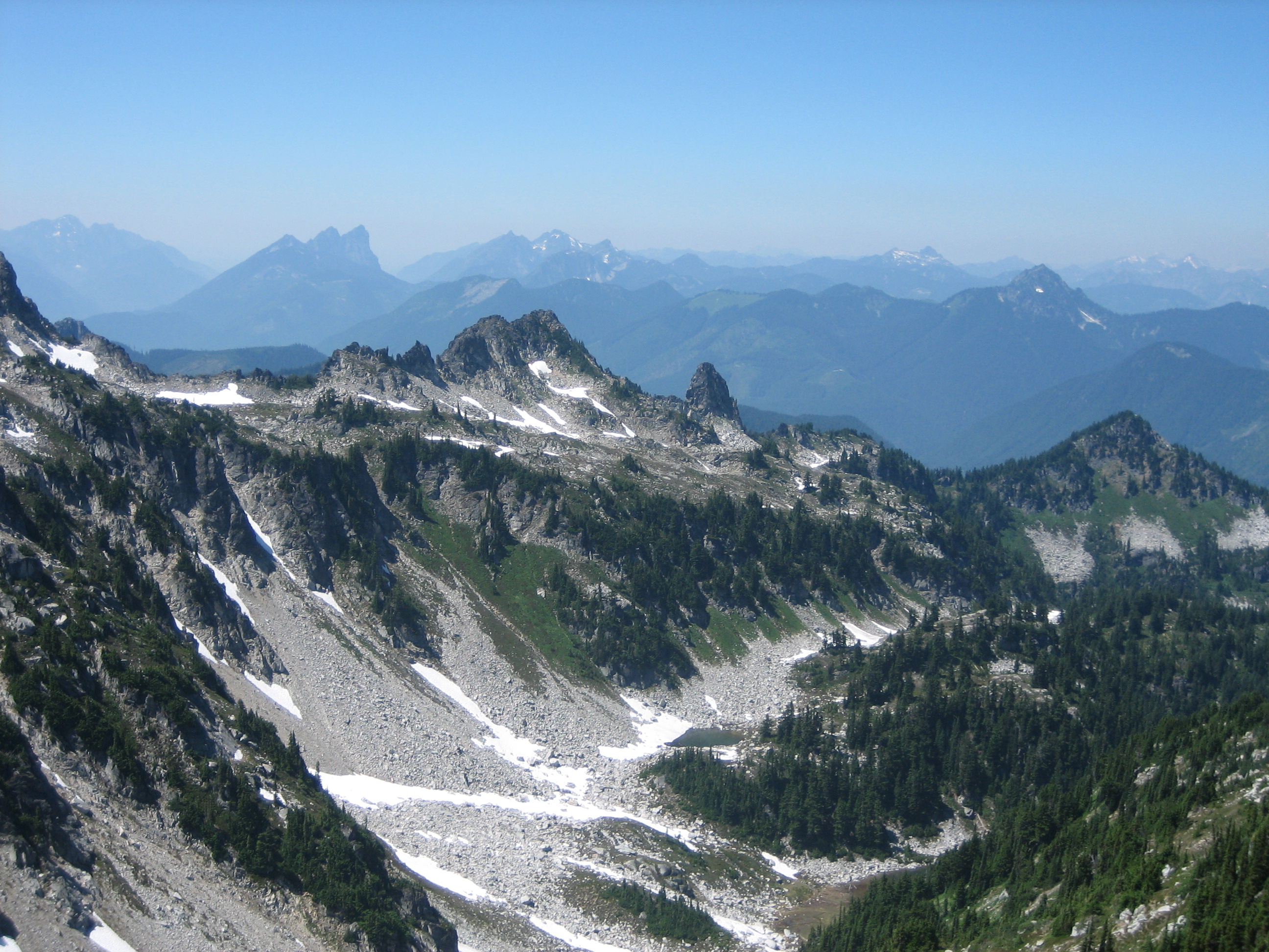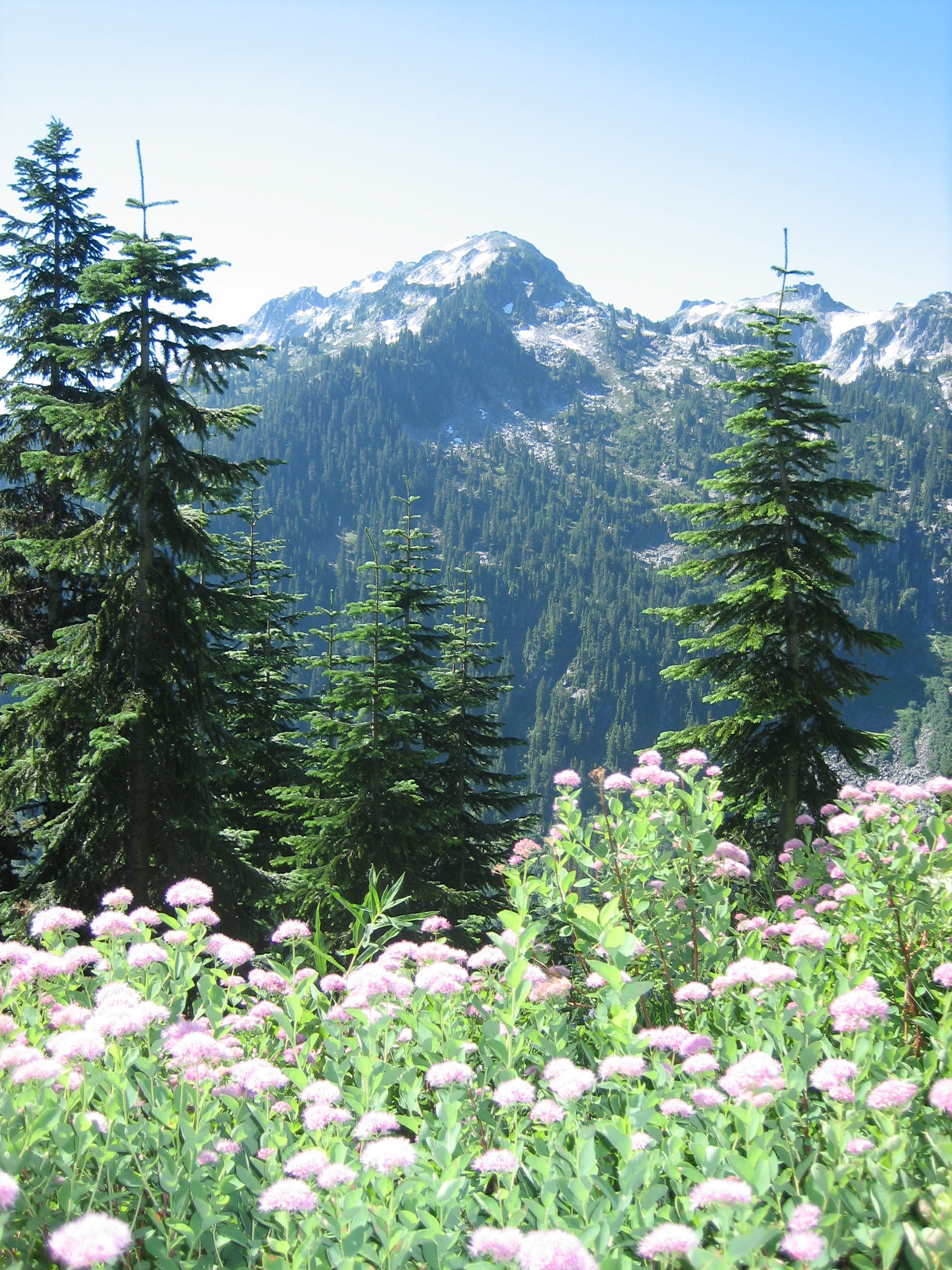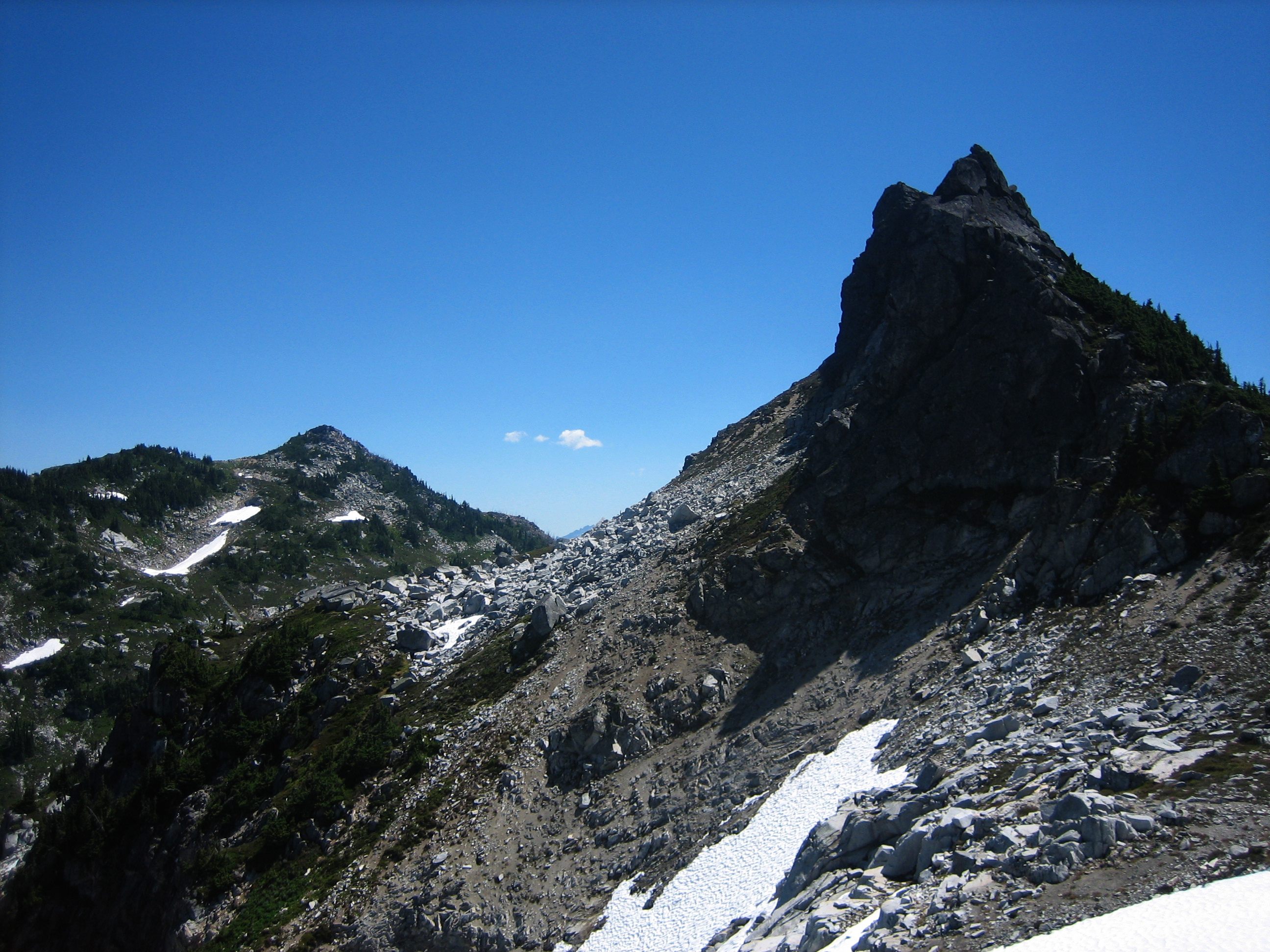 … scrambled down steep heather and Class 2-3 rock to a 6200-foot saddle, then strolled up alp slopes to Thor Peak’s panoramic summit. The summit register was a glass jar with a roll of steno paper. We were the first group signing in for 2006.