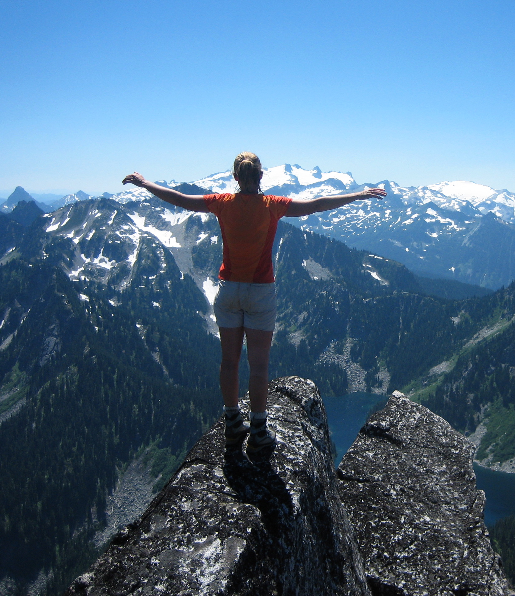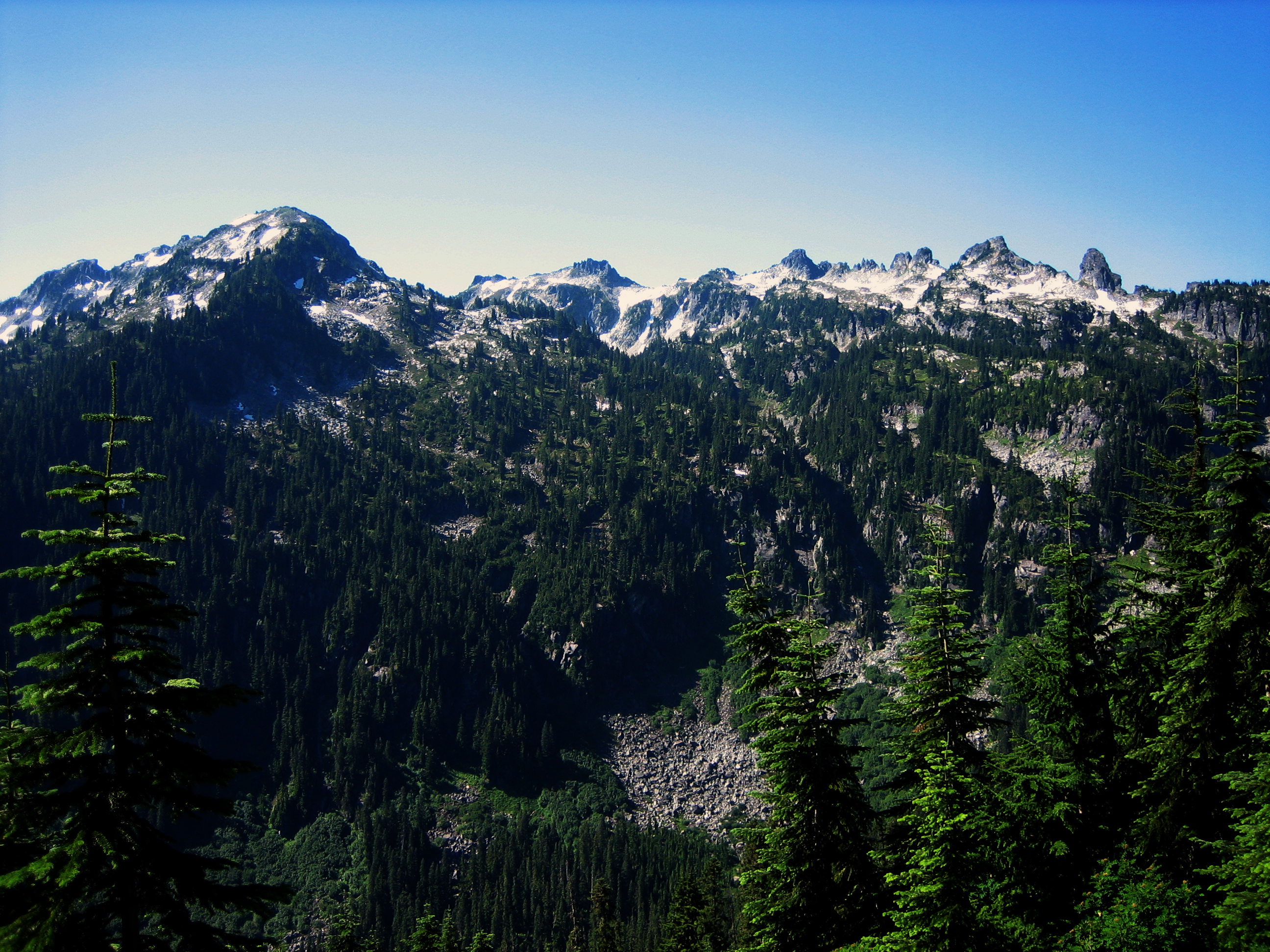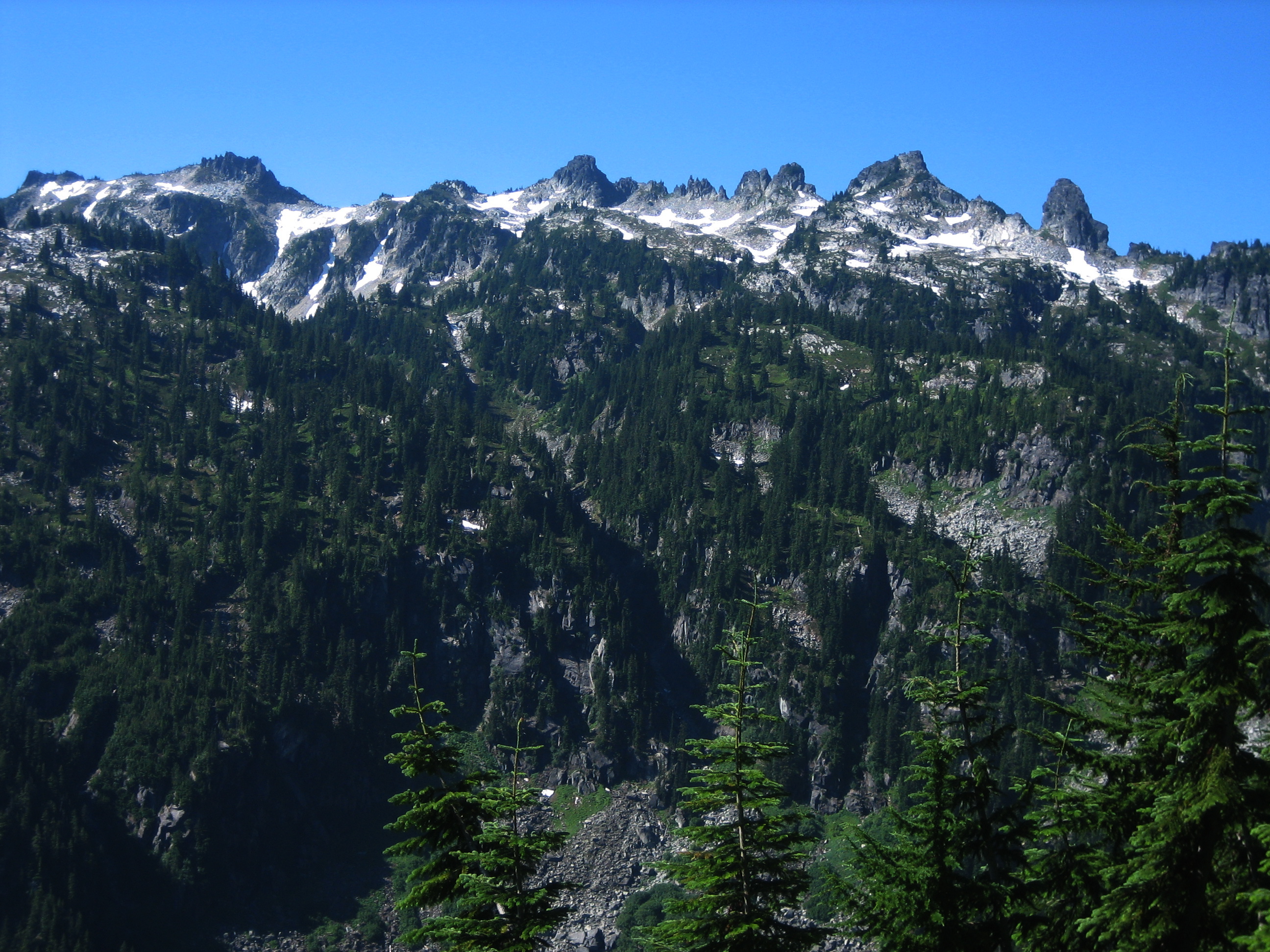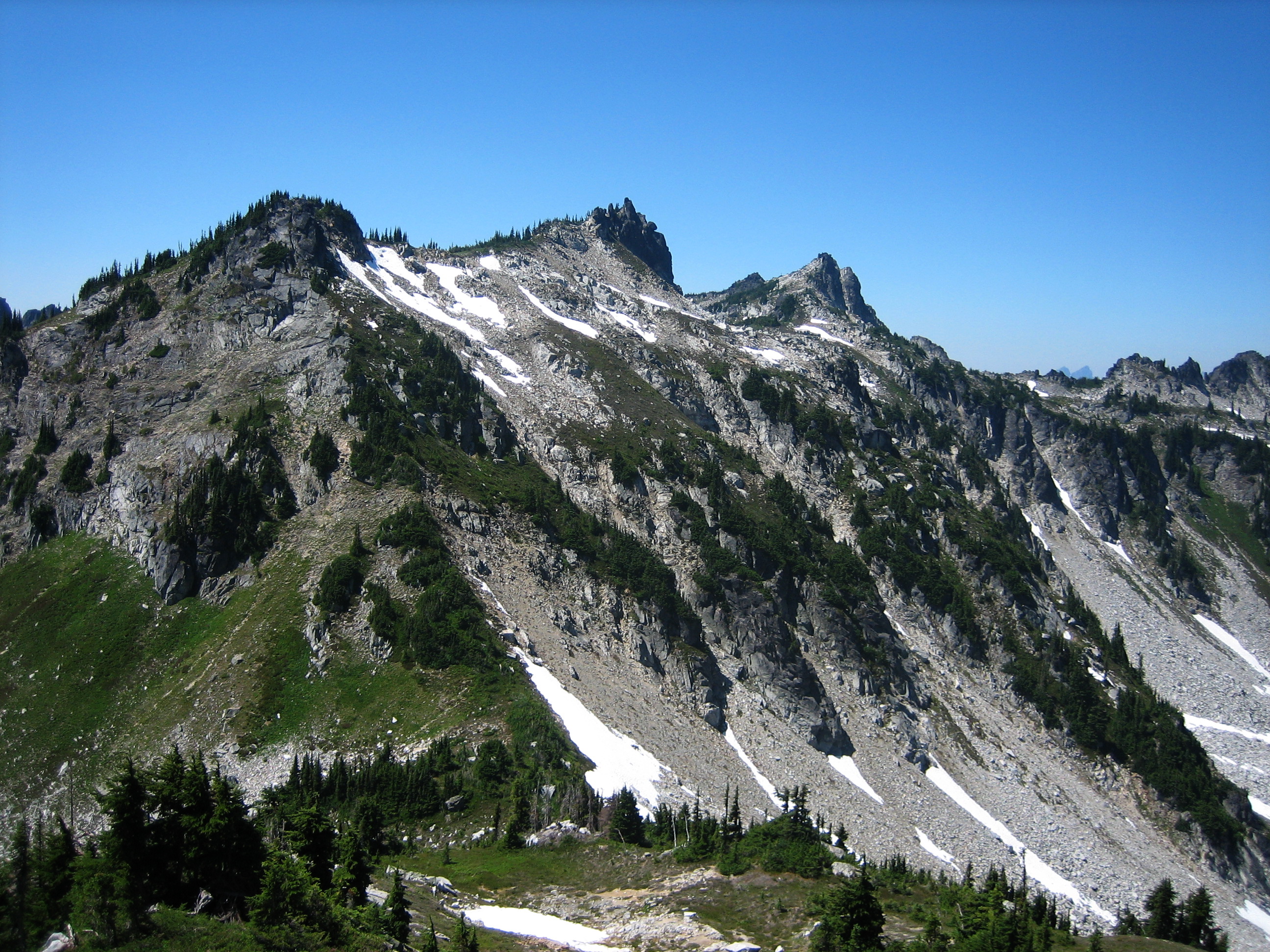 … scrambled down steep heather and Class 2-3 rock to a 6200-foot saddle, then strolled up alp slopes to Thor Peak’s panoramic summit. The summit register was a glass jar with a roll of steno paper. We were the first group signing in for 2006.