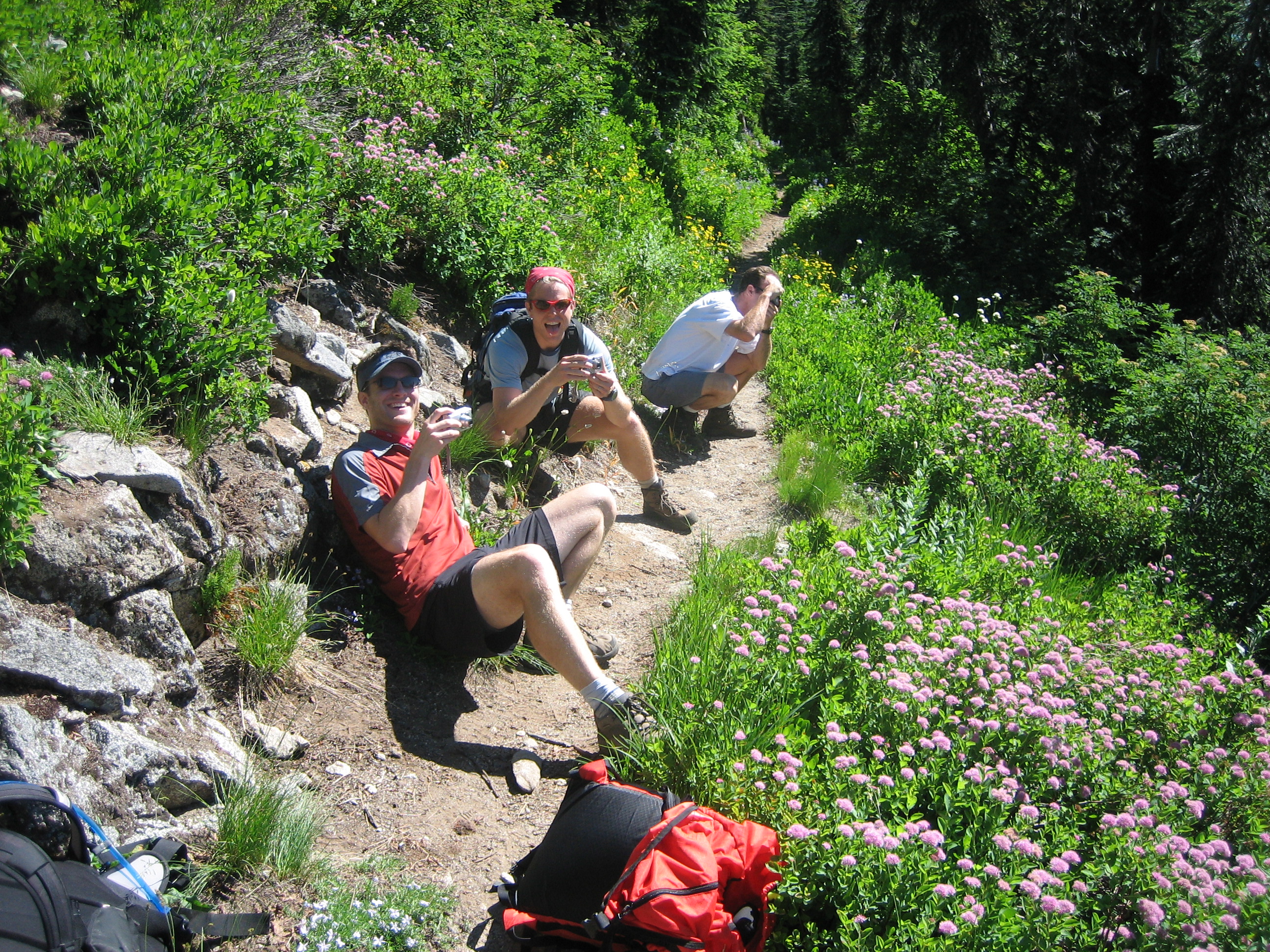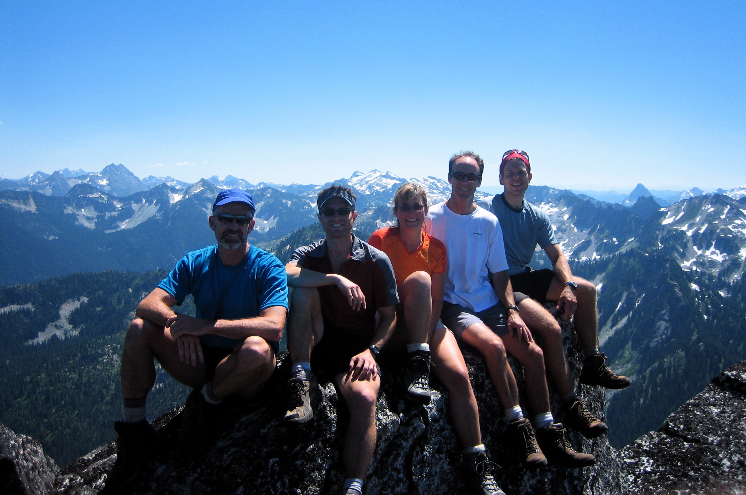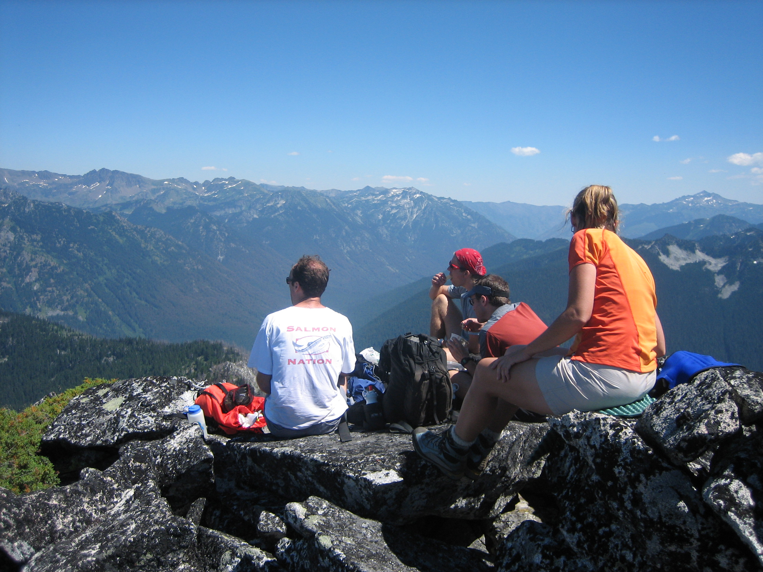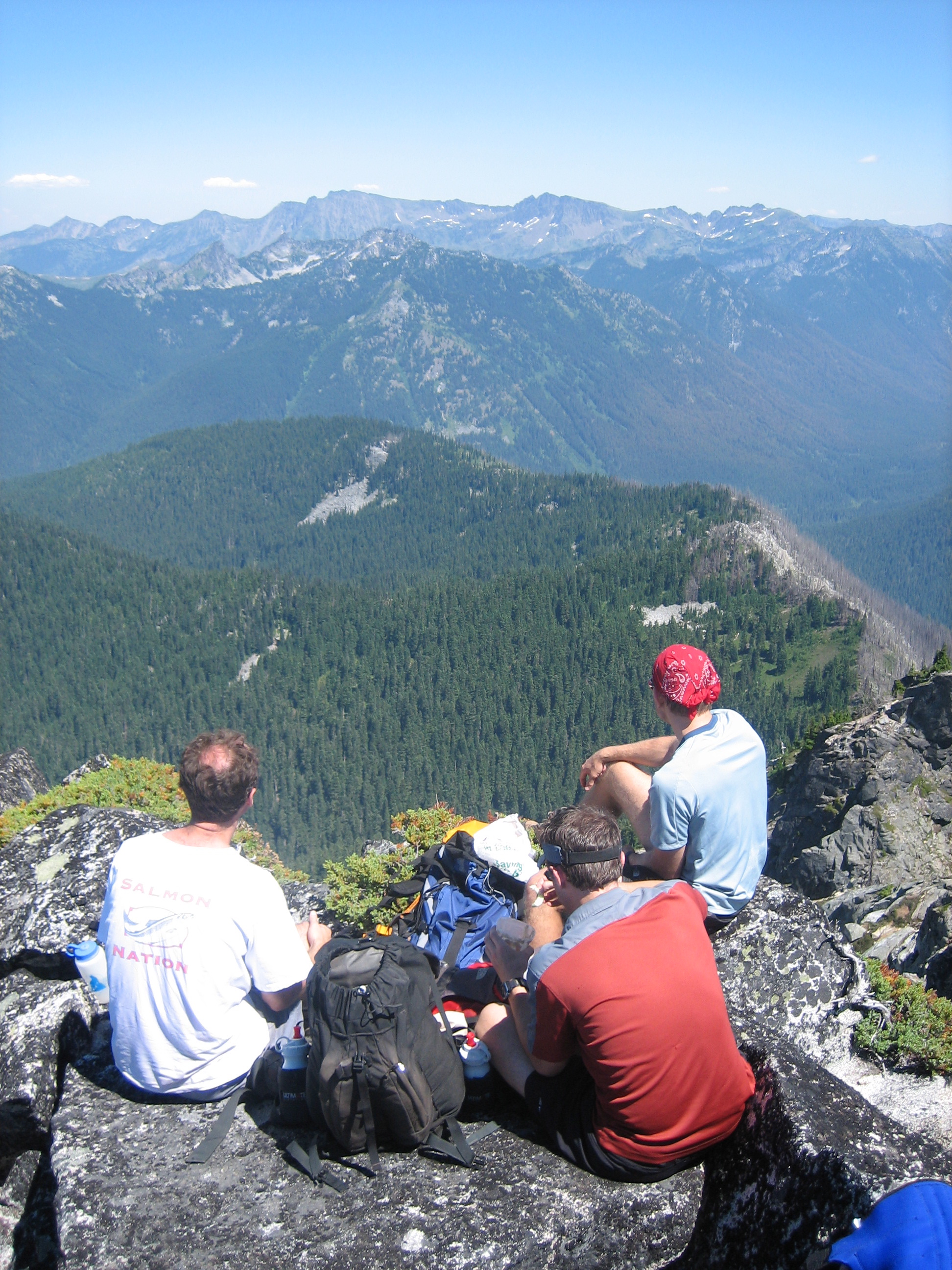 There were many familiar names, and a running debate about whether to call this Thor Peak or Wolverine Peak. Seems as though the Viking god of thunder and rain is winning. We hung out for 45 minutes before the attraction of Thunder Mtn Lakes pulled us off the summit.