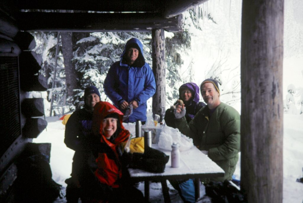After several miles of tromping through fresh snow, first on the road and then on the Grindstone Trail (a nice shortcut), we arrived at Mowich Lake in time for lunch (2.6 hours from gate). It had snowed heavily throughout the morning, so we took shelter under the ranger station roof.