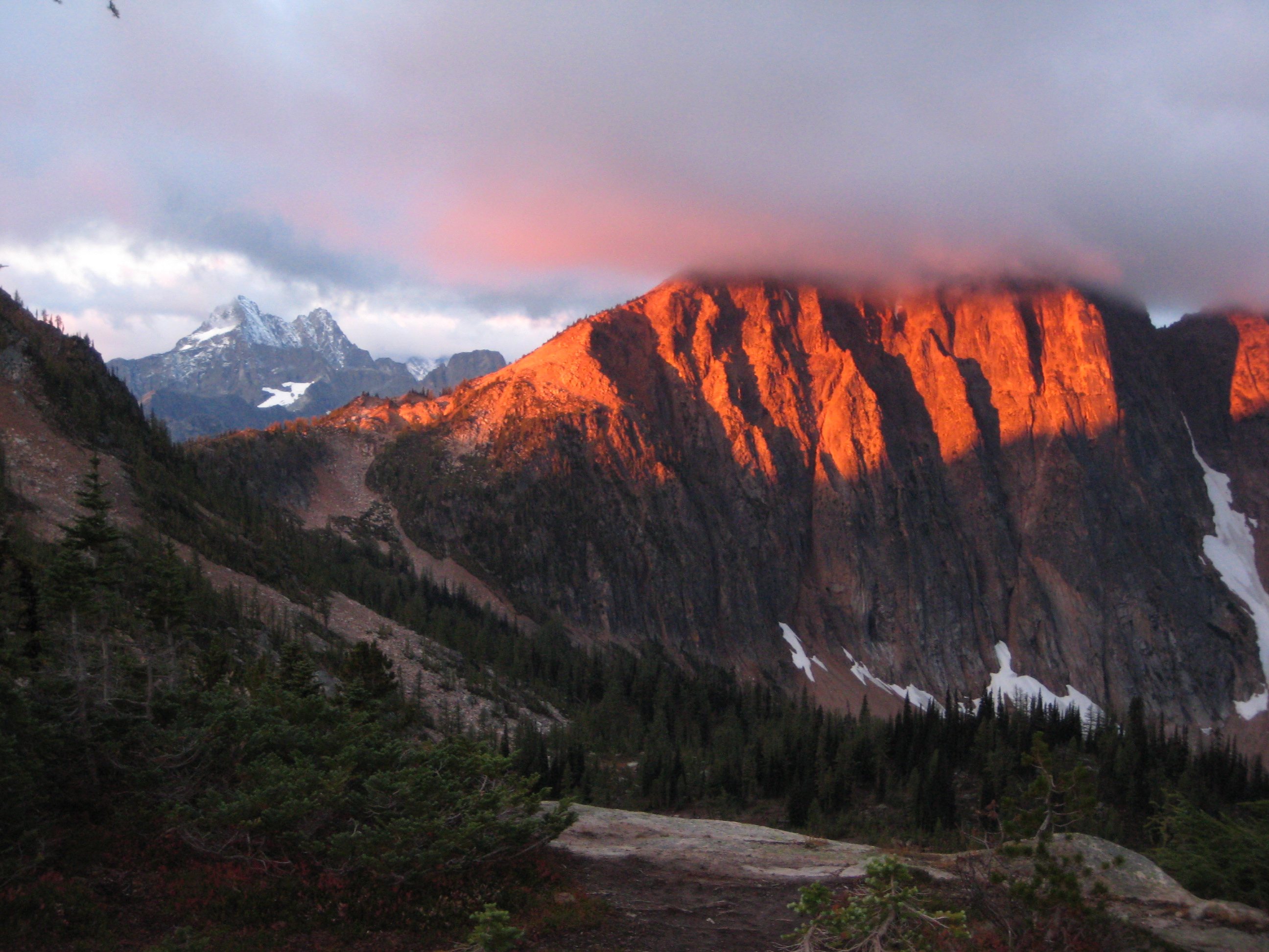 sunset firey light above Tower Mountain in the Upper Methow Mountains with mountain climber's camp on the rock slabs of Snowy Lakes