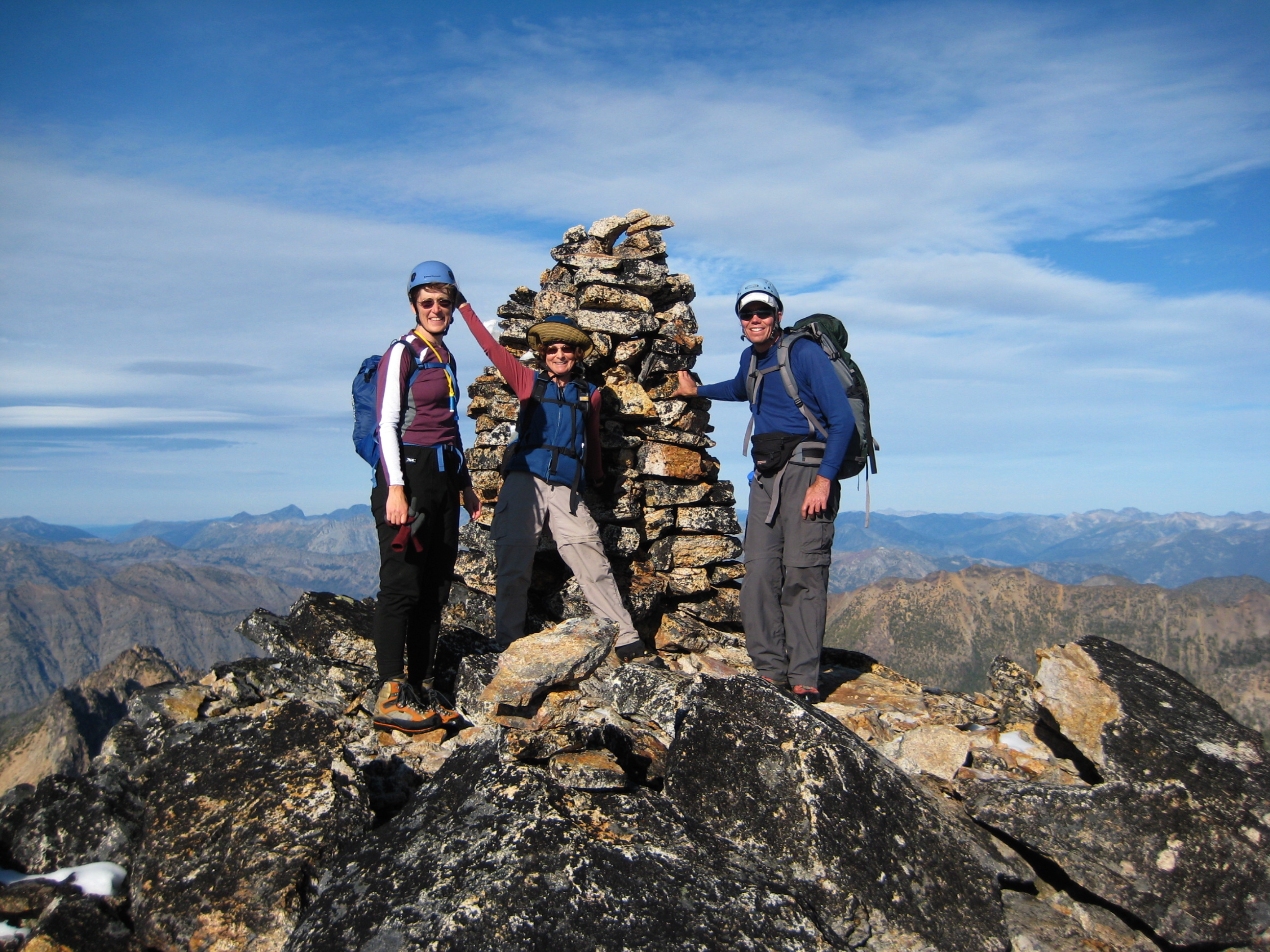 group of mountain climbers in front of rock cairn on the summit of Tower Mountain in the Upper Methow Mountains