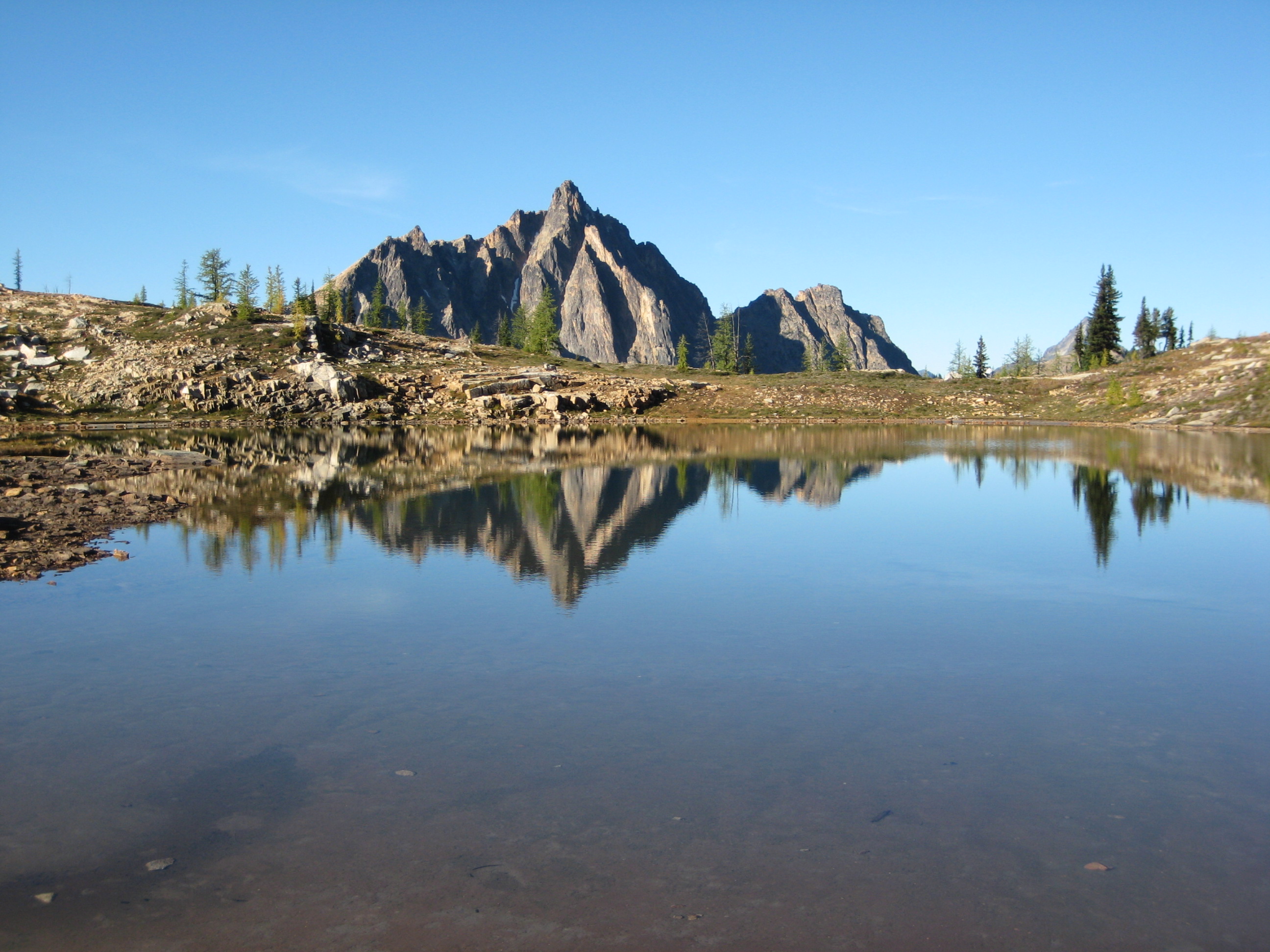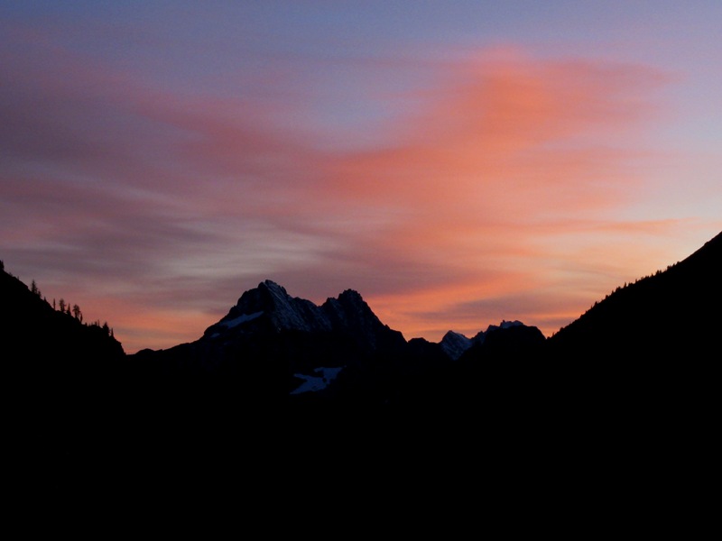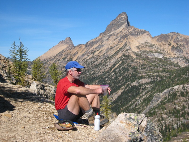 On Friday, we hiked in about 11 miles and set up camp in the grassy saddle above Upper Snowy Lake (6.0 hours from TH). Larch trees were just starting to turn gold, so this became known as “The Turning Larch Trip.” The night was clear, chilly, and surprisingly wind-free.