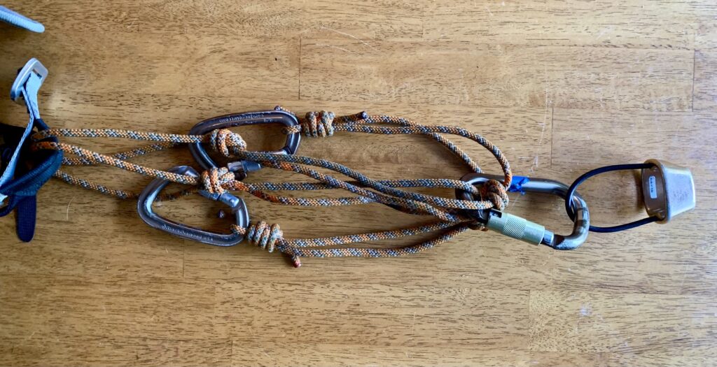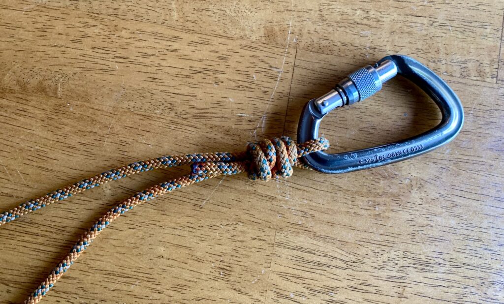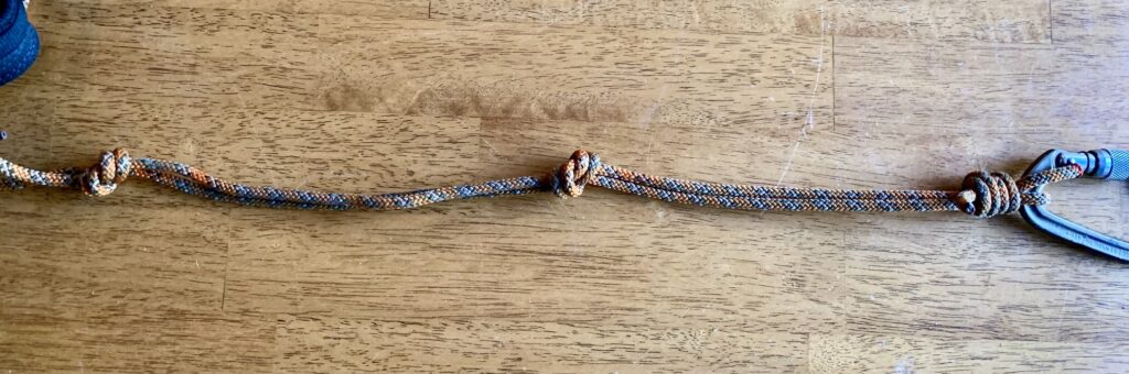 Step 5: Pull the strands taut again and tie a second overhand knot approximately 6 to 8 inches from the carabiner end of the sling. The exact location of this knot isn’t critical, but make sure that all strands coming out of the knot are equally taut. A completed tether is shown below. With use, you might find it beneficial to adjust the location of these knots, or to add a third knot.
