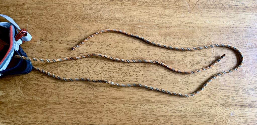 Tether Cord: For each tether, start with about 7 feet of 5mm to 6mm nylon accessory cord.  (Avoid using any of the high-strength cords such as Dyneema or Spectra, because they do not hold knots well.) This cord length results in a finished tether length of about 28 inches, which roughly matches the length of my outstretched arm. I have found such a length to be appropriate for the vast majority of my climbing applications, such as hanging from a double-bolt anchor on a sport route, or clipping to my ice axe on a snow route.  Climbers who prefer a shorter or longer tether should adjust the starting cord length accordingly, but the basic procedure is unchanged.