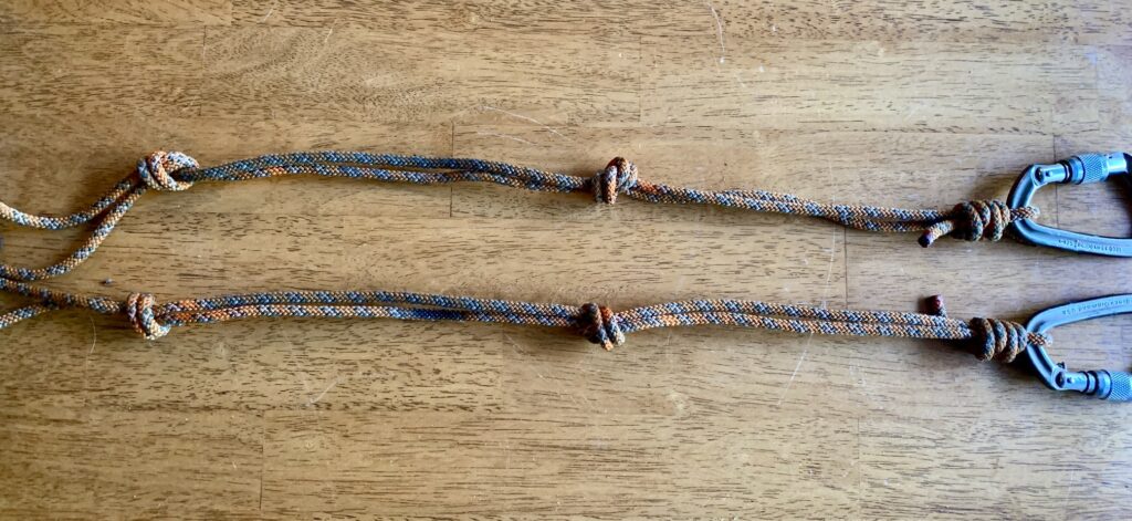 Double Tether Construction: As previously mentioned, I use two tethers on my crag harness because it allows me to clip to each side of a double-bolt anchor.  This provides safety redundancy in the overall system, and the tethers form an acute triangle, which gives me a tad more lateral stability when hanging on a steep wall. For the second tether, simply follow the above-described construction procedure, being careful to match up all knots with those of the first tether.