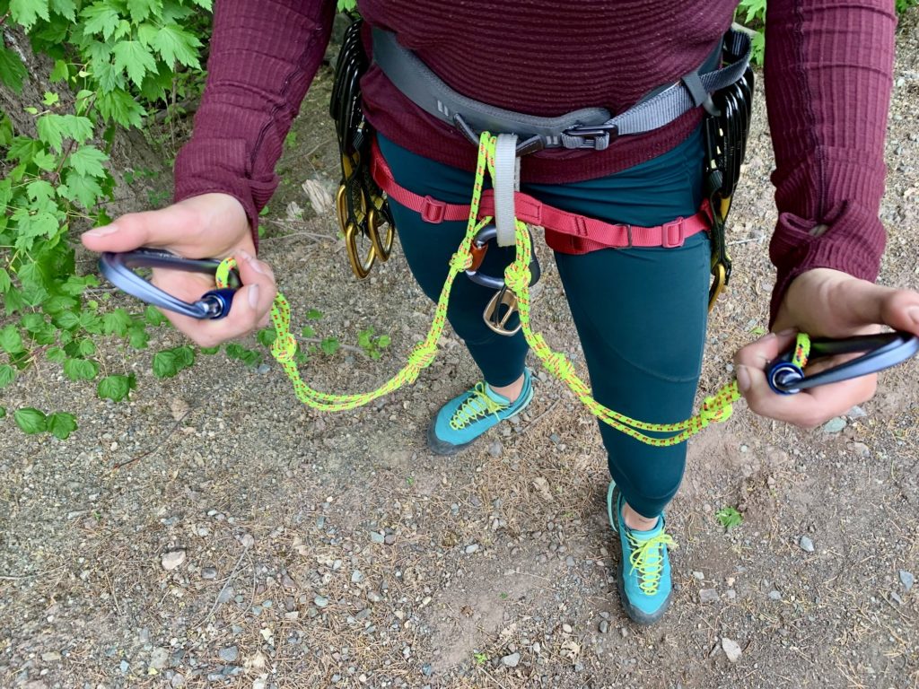 Rappelling Extension: A handy feature of some tether systems, including this one, is that the tethers can be used to create an extended rappel sling, thereby eliminating the need for a separate sling. For such a situation, simply clip your rappel device to an intermediate knot in the tether and then clip the end carabiner back to the belay loop or other convenient location. I typically clip my rappel device to both tethers for redundant strength, but this isn’t strictly necessary given the high strength of each tether compared to the low force imposed during a rappel.