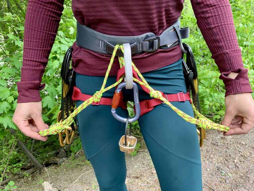 Step 1: Pass one end of the cord through both tie-in loops on your harness, then fold the cord into approximate thirds. It is important that the cord runs through both tie-in loops, not just the waist loop or the leg loop. Furthermore, do not feed the cord through just the belay loop; it does not possess enough durability for this type of tether attachment.