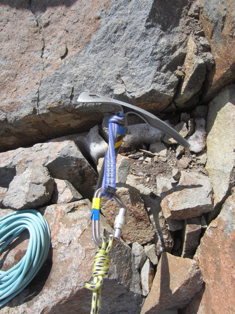 Single Tether Clipped To Ice Axe Rock Anchor