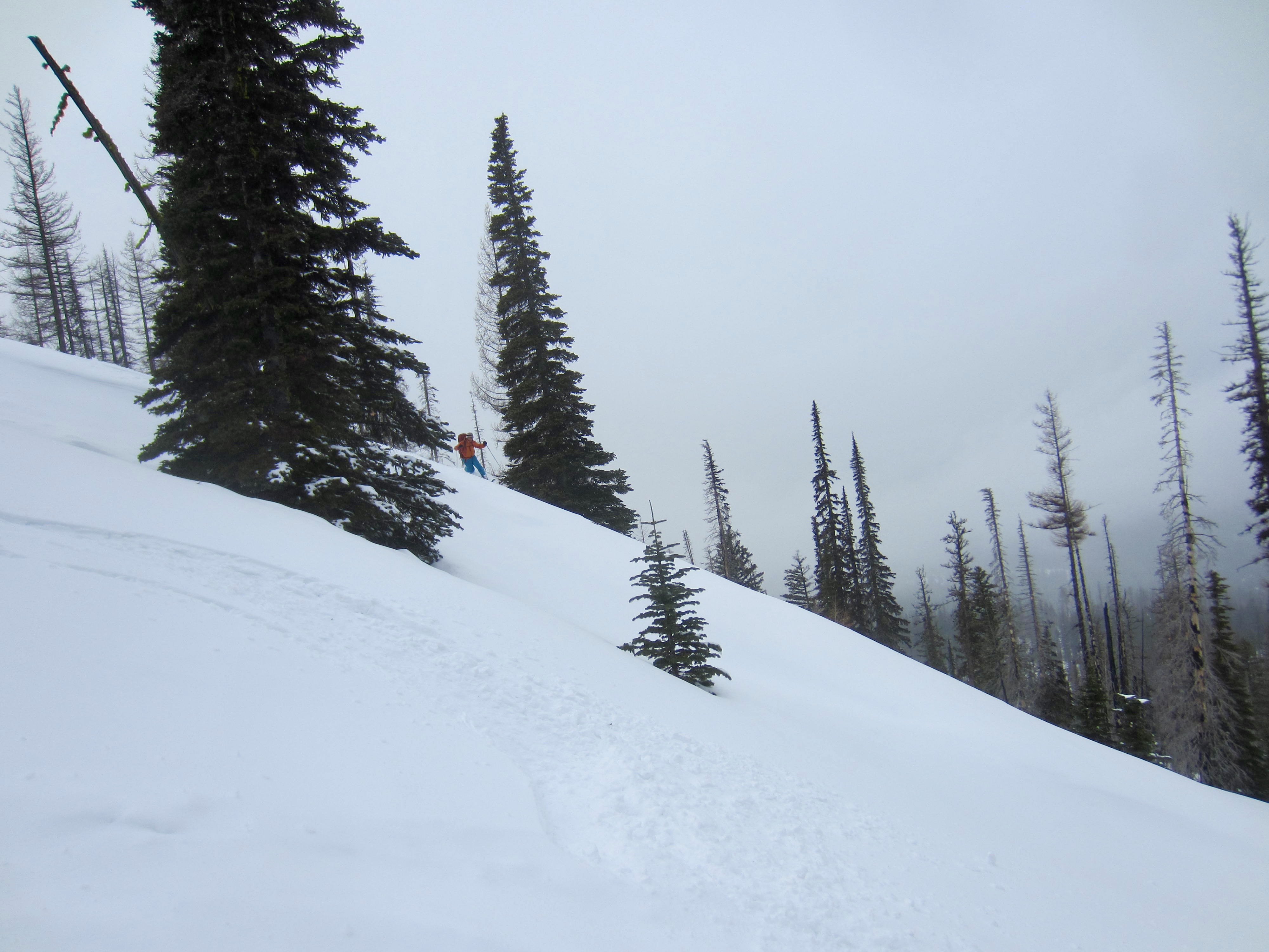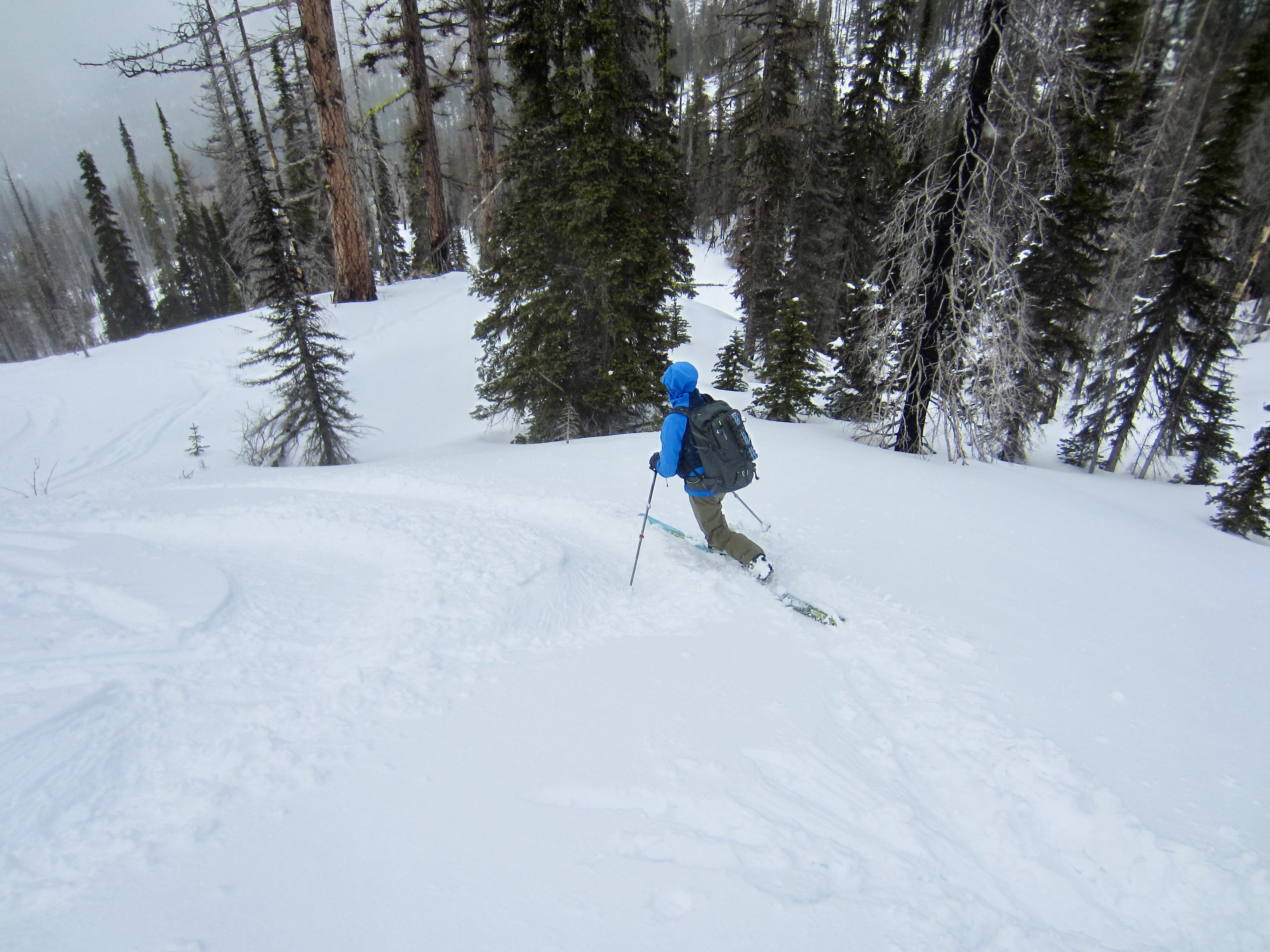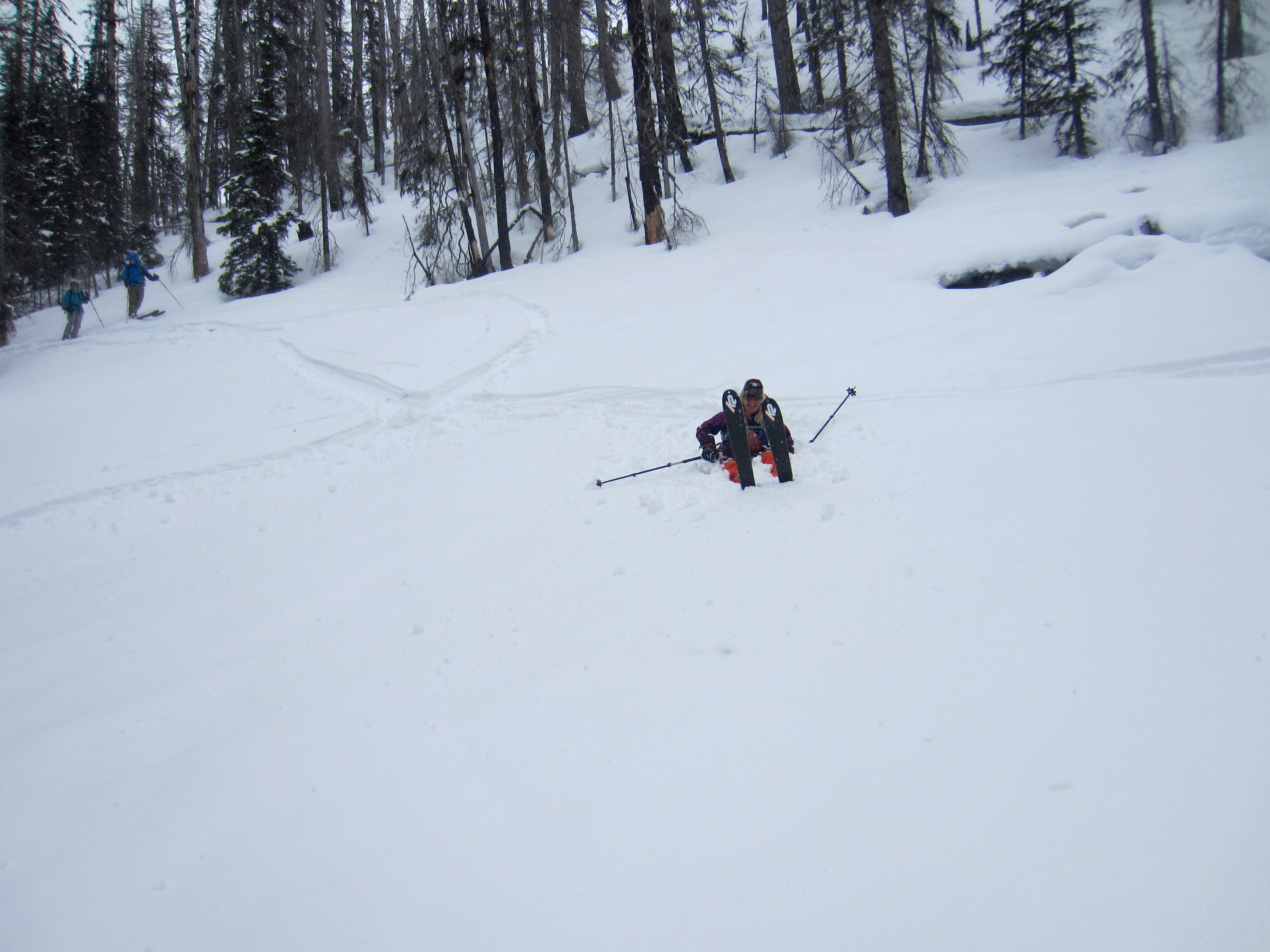 We carefully picked our way down the east ridge of Tronsen Head, dodging fallen trees, and then crossed through Haney Gap to reach the north-facing slopes. The snow here was relatively good—at least in isolated places—such that we collectively managed to squeeze in some nice telemark and alpine turns. There were also lots of spectacular tumbles and face-plants.