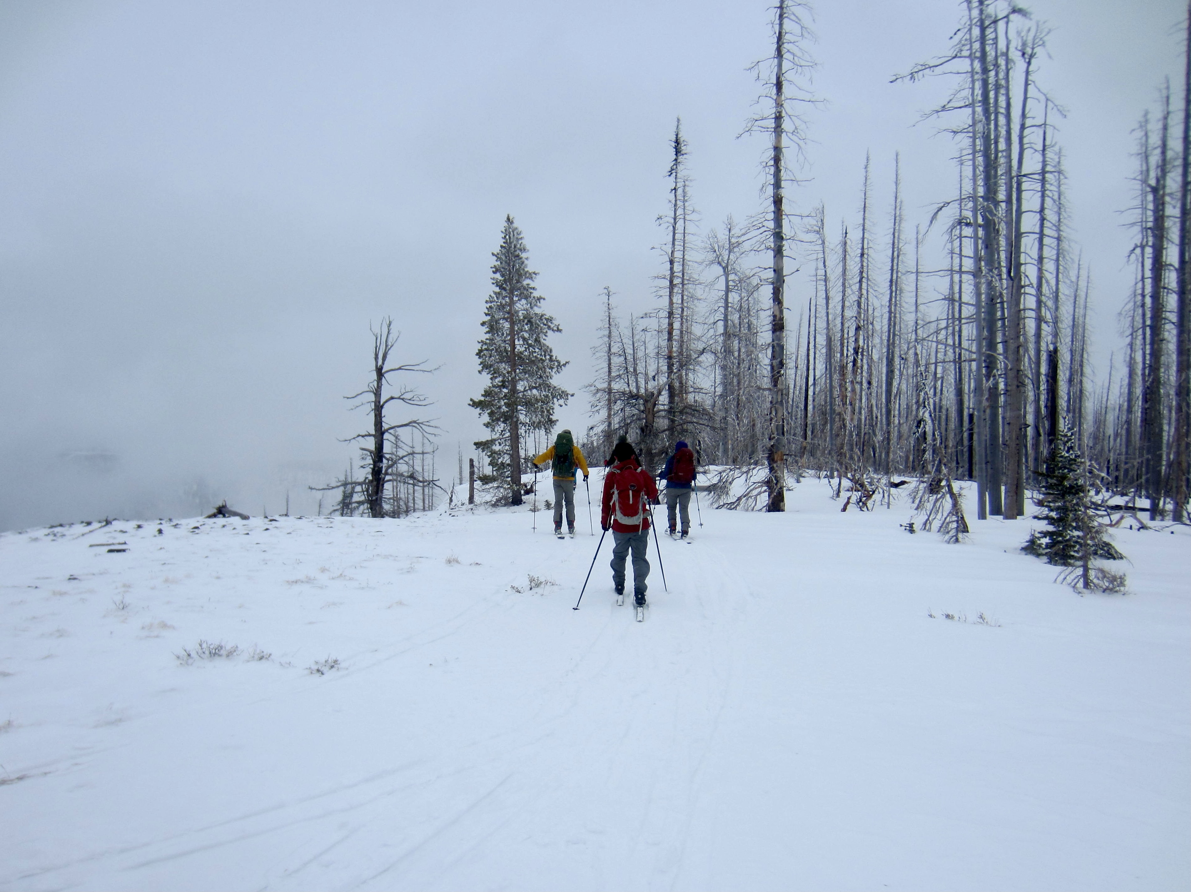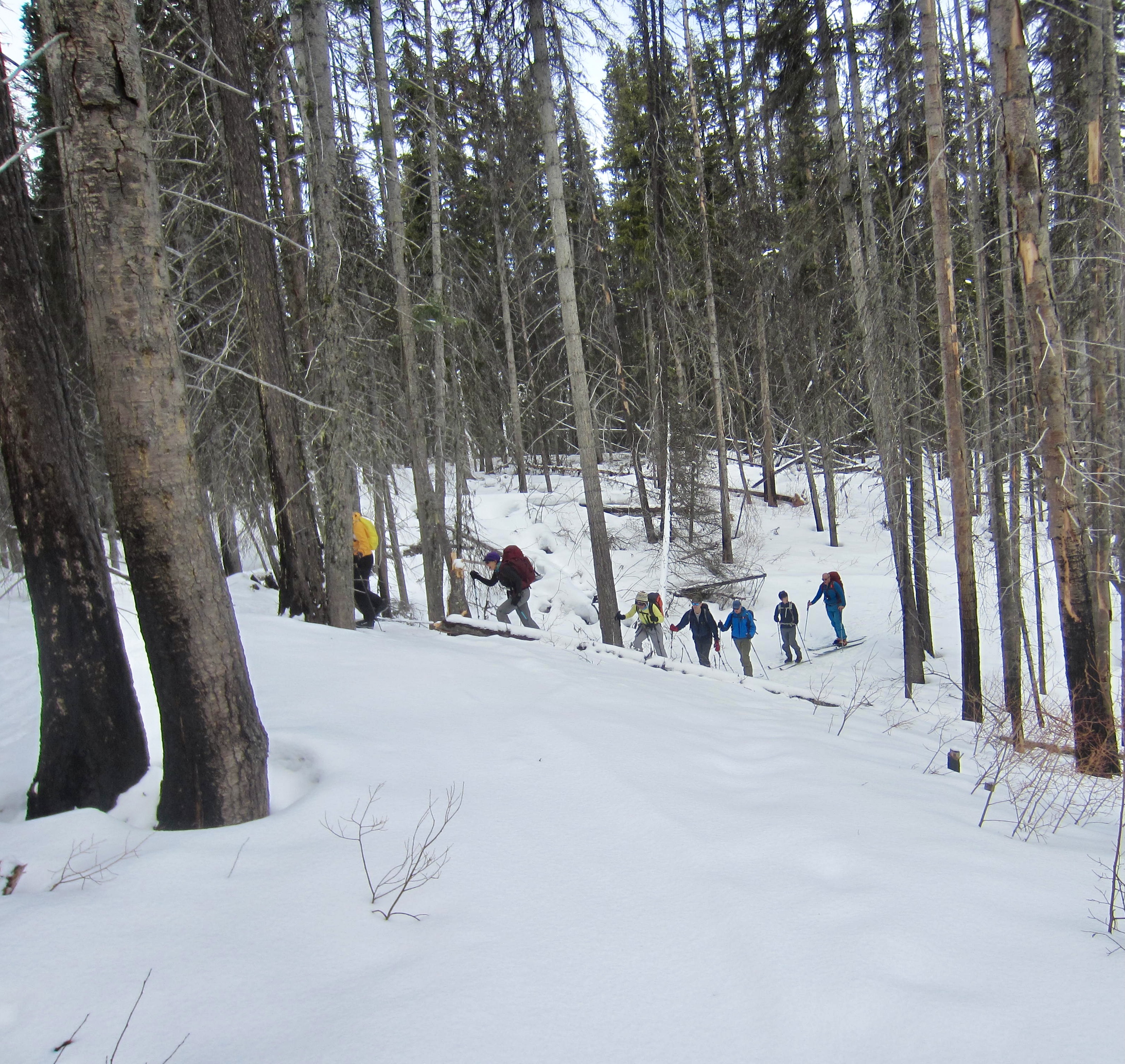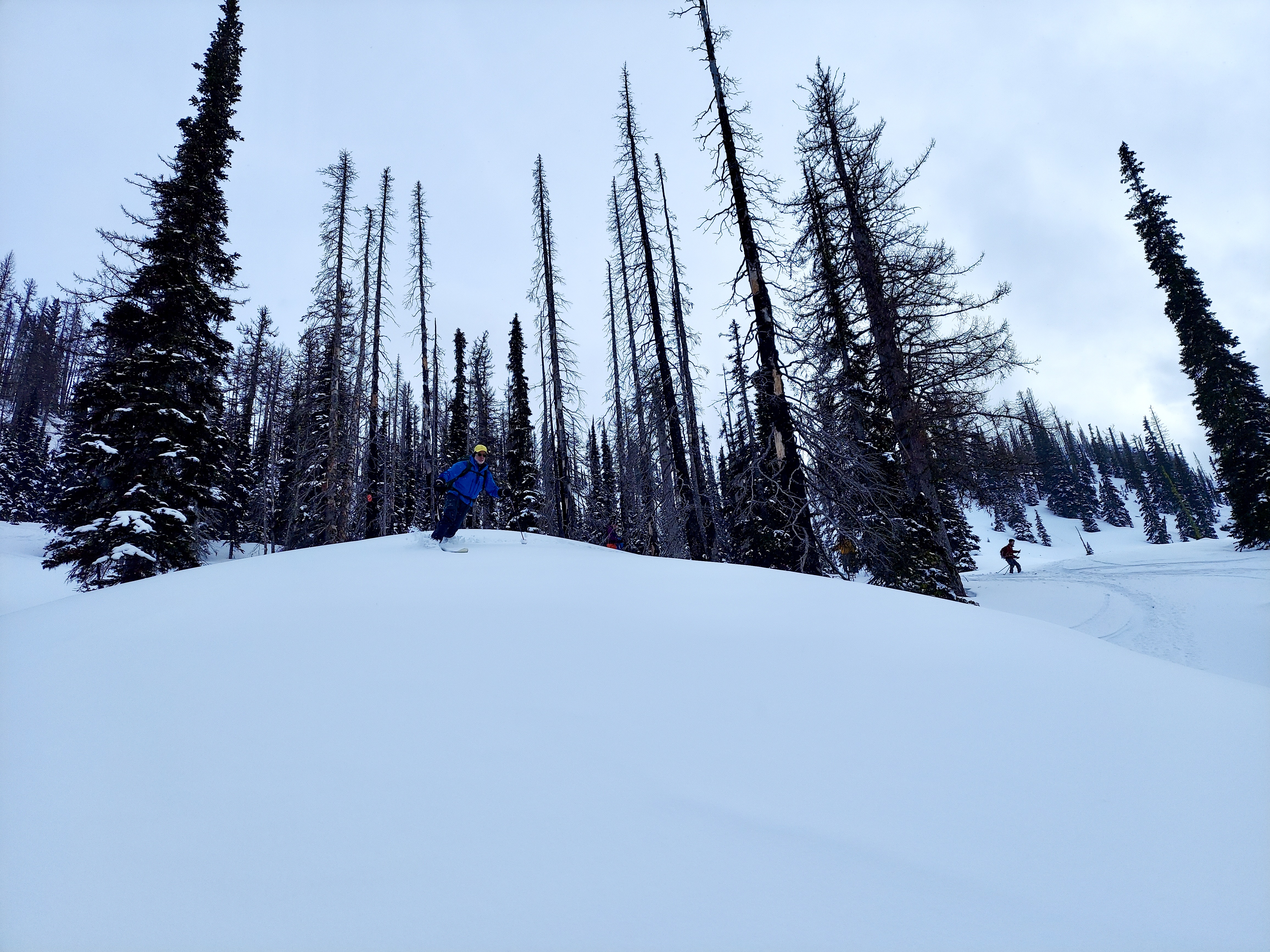 We carefully picked our way down the east ridge of Tronsen Head, dodging fallen trees, and then crossed through Haney Gap to reach the north-facing slopes. The snow here was relatively good—at least in isolated places—such that we collectively managed to squeeze in some nice telemark and alpine turns. There were also lots of spectacular tumbles and face-plants.