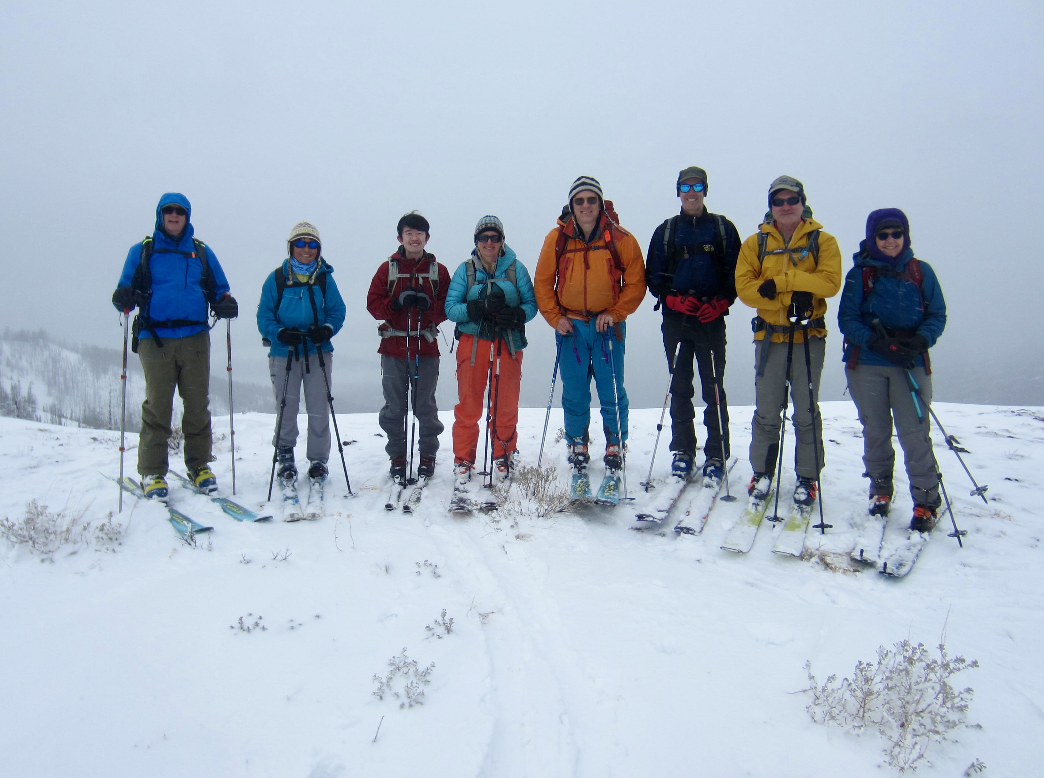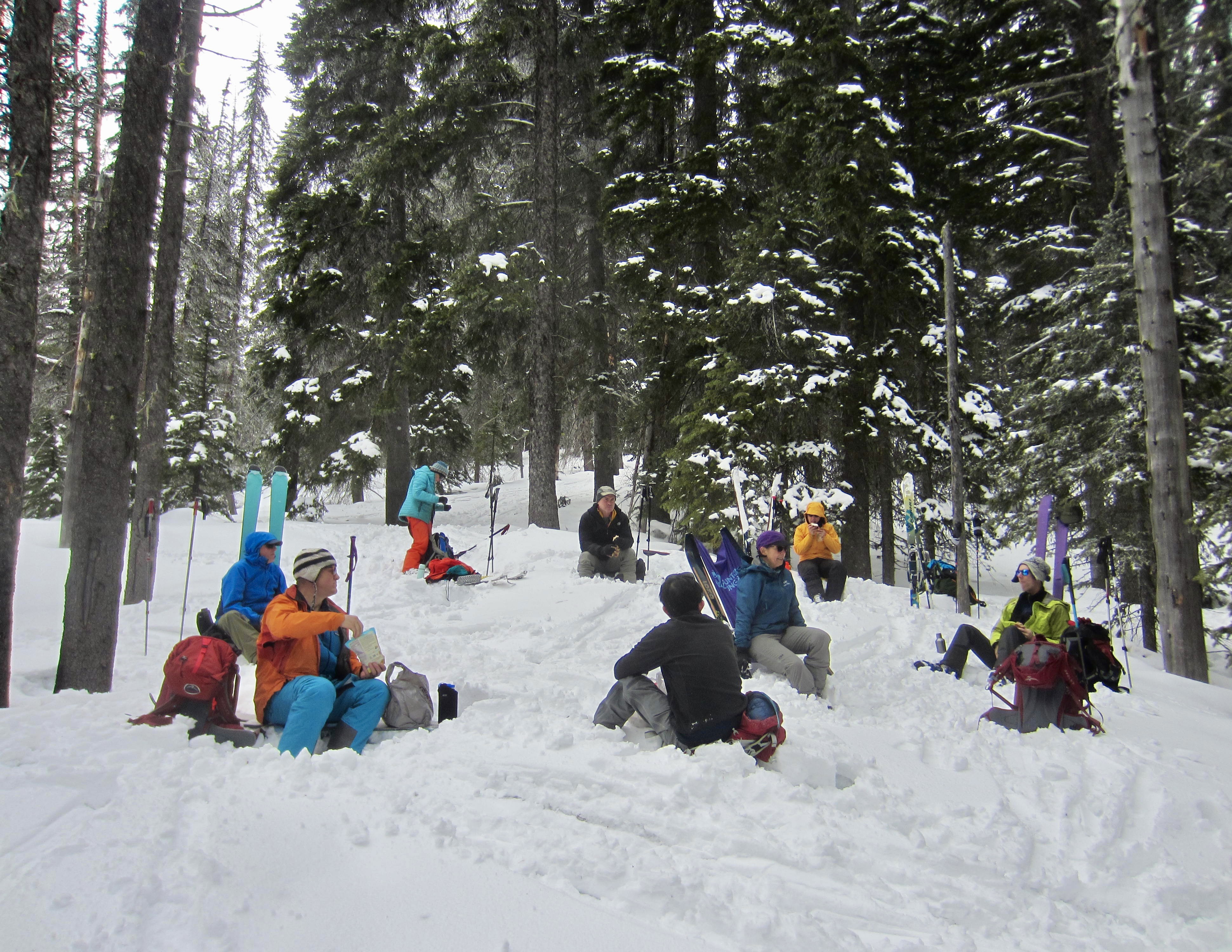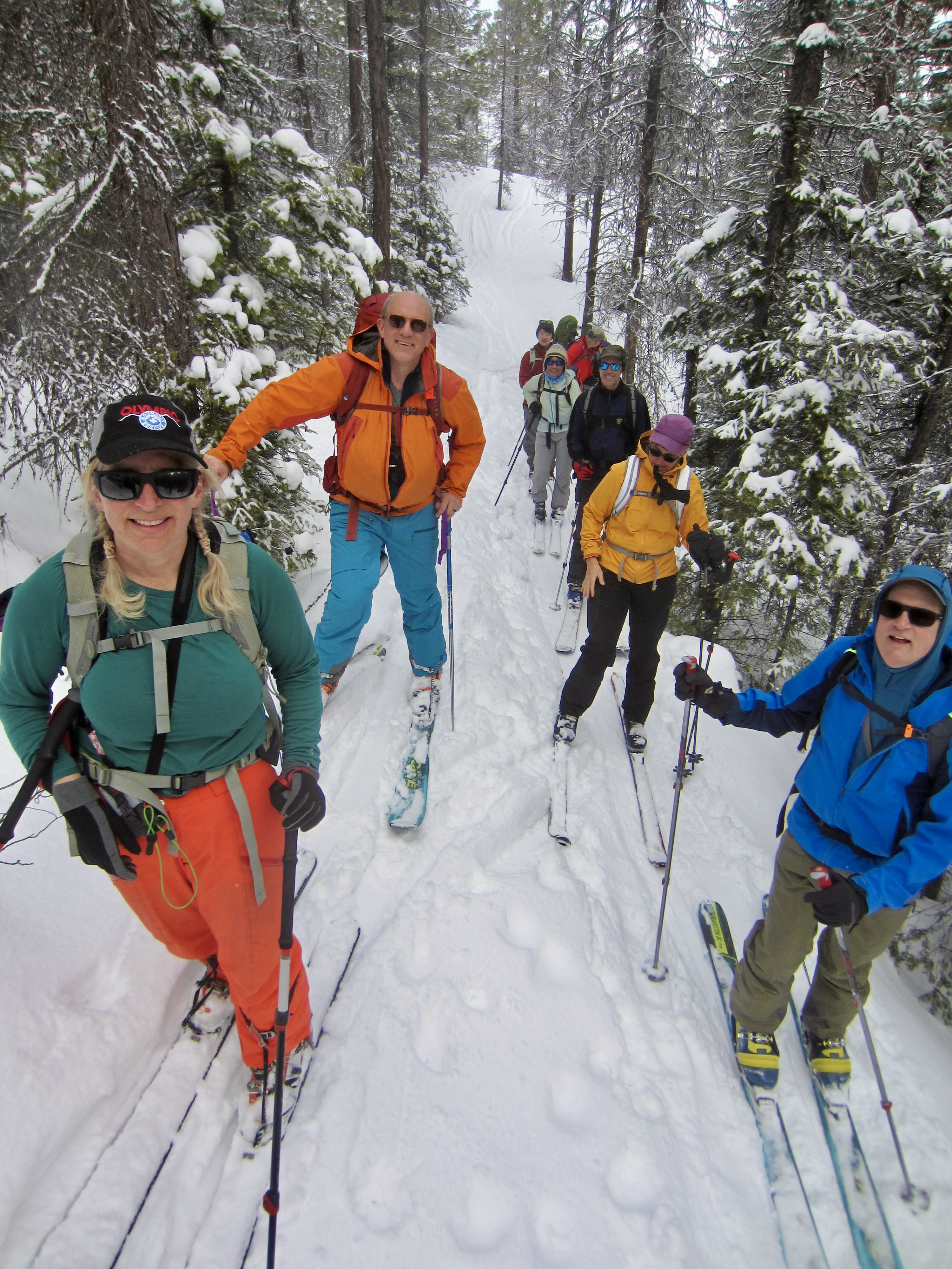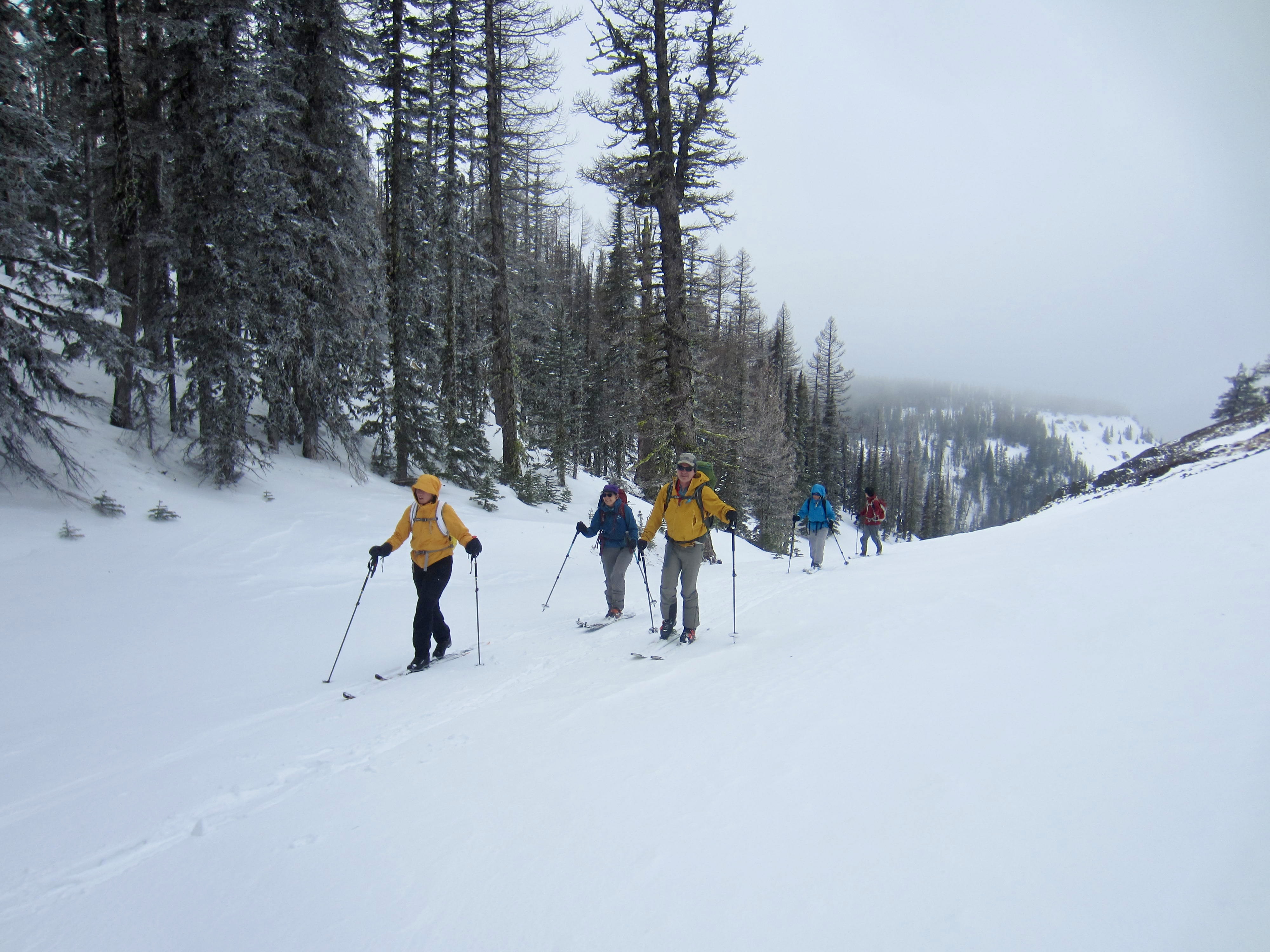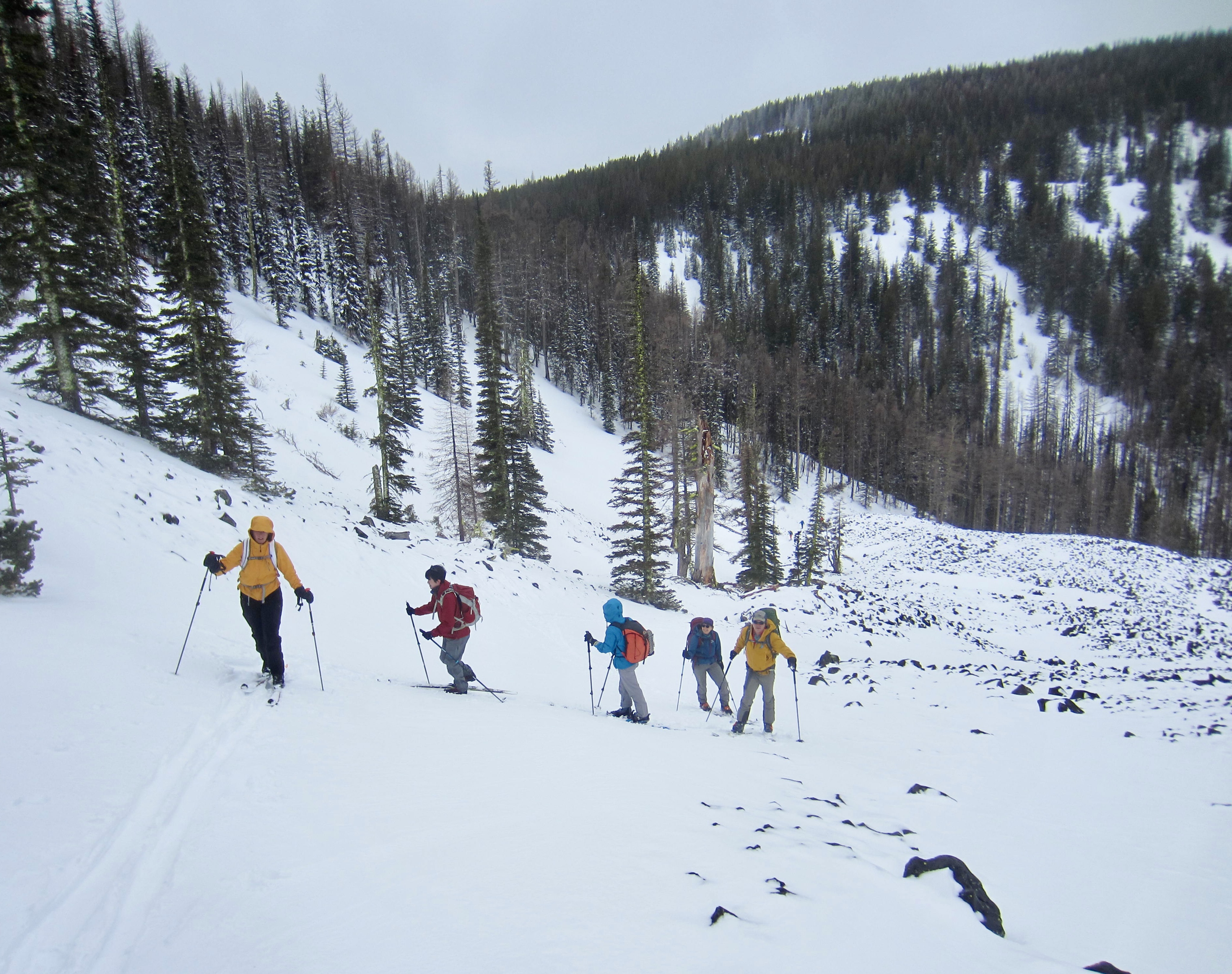 We started at the Blewett Pass Sno-Park and skinned up through sparse forest on the eastern flank of Diamond Head. The old crust was covered by 2 to 6 inches of fresh snow that became stickier as the day warmed up, giving everyone in our group a crucial lesson in the value of skin wax.