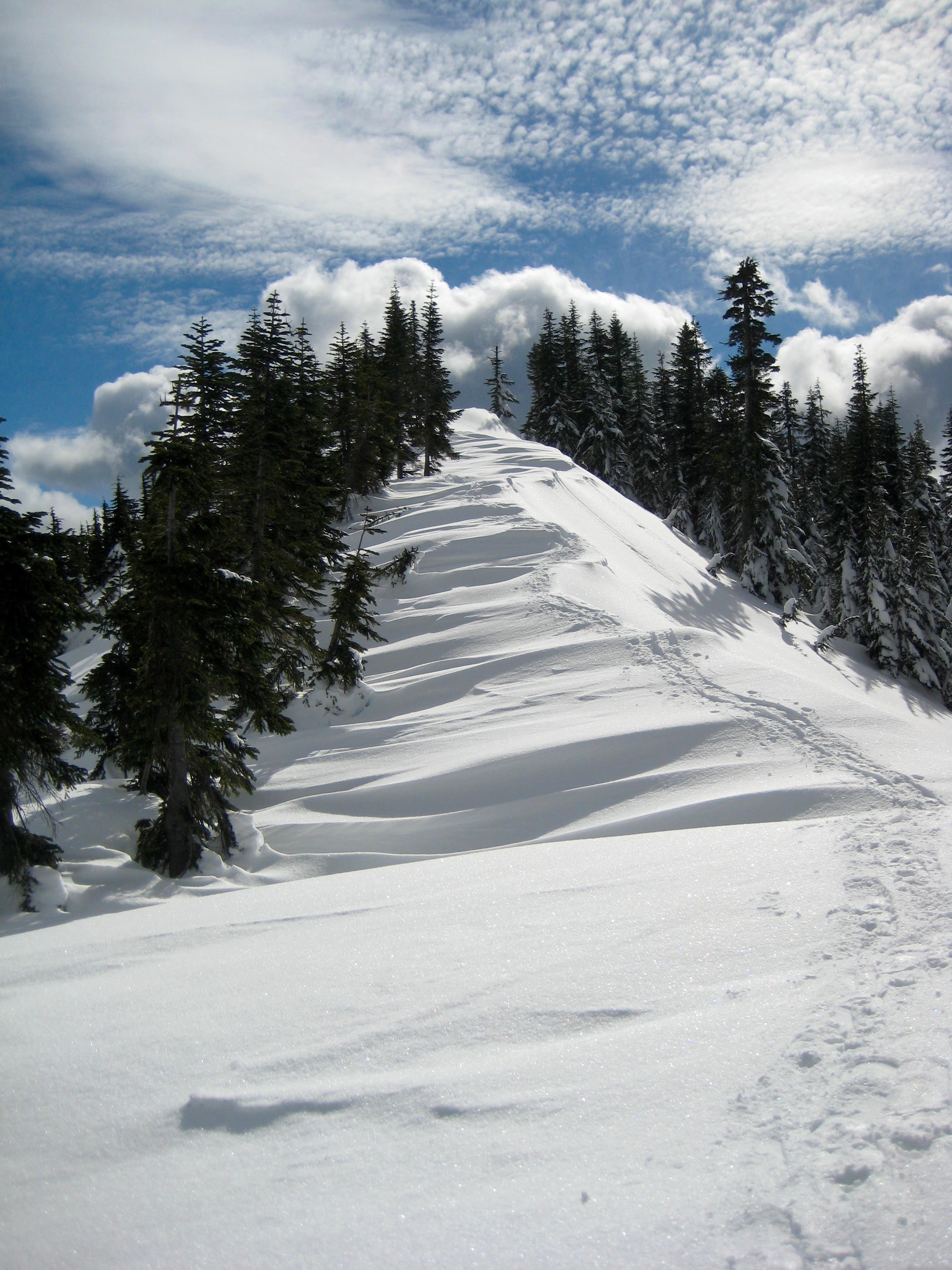 We started at the Pratt Lake / Granite Mountain Trailhead and hiked toward Olallie Lake, first on bare trail and then on snow-covered trail. Soon after passing the trail junction and crossing two small creeks, at an elevation of 3200 feet, we left the trail and began snowshoeing straight upslope through moderately steep, dense forest.