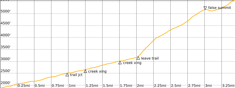 With increasing elevation, the wide forest slope transitioned to a rounded ridge crest, and the trees gradually thinned out. The gradient also eased a bit, forming a slight shoulder at 4400 feet, then it steepened again just before we came over a false summit at 5180 feet. From here, the true summit was visible straight ahead. We descended 80 feet to a saddle and then angled up a broad, open slope to gain the summit (3.8 hours + 3800 feet from TH).