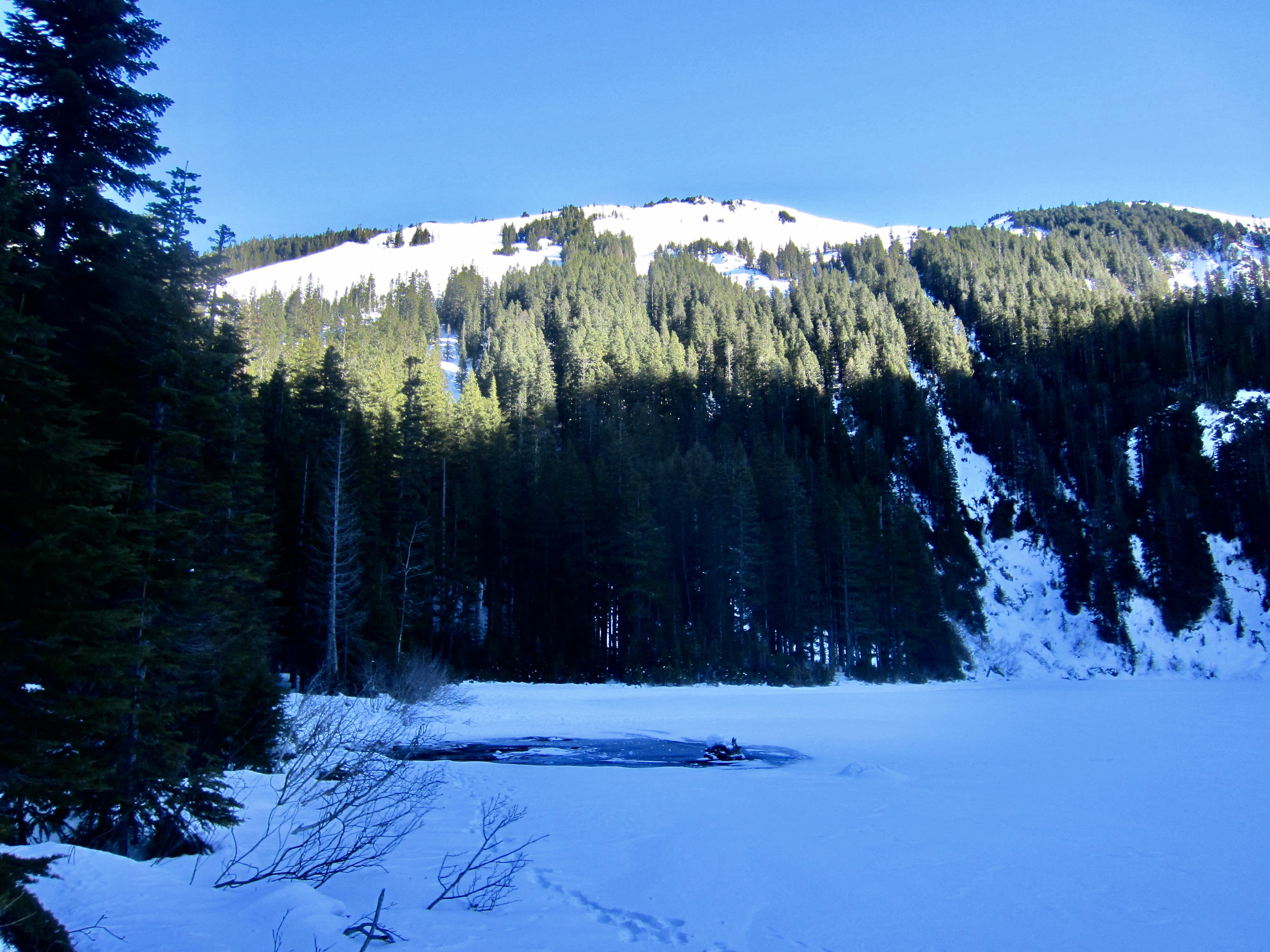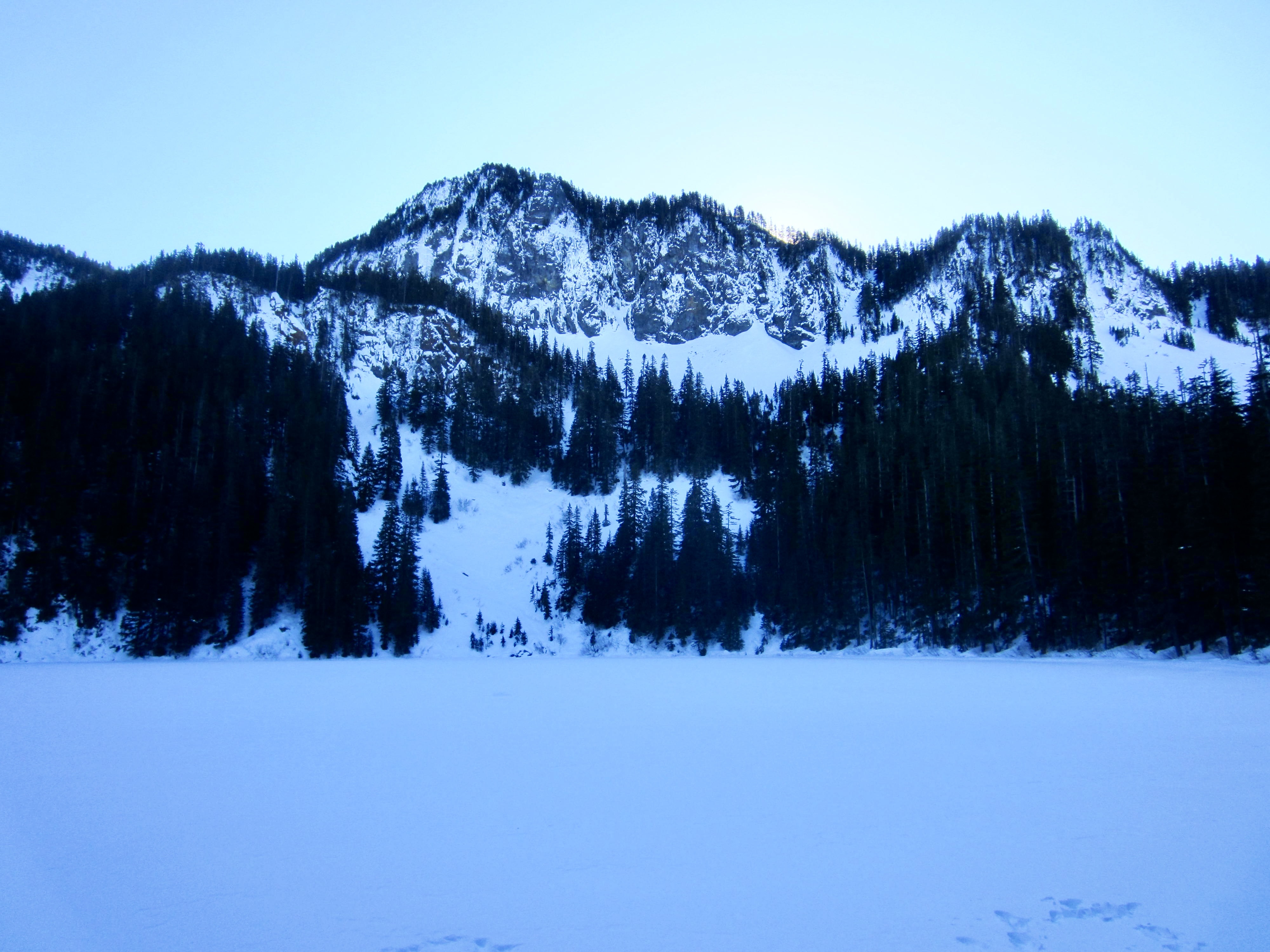 After climbing steadily for 2½ miles, the trail tops out and makes a nearly level traverse for an additional mile before arriving at Annette Lake (3.4 miles + 1850 feet from sno-park). This pretty little lake sits in a shallow bowl that is bounded by Silver Peak on the left (east), Humpback Ridge on the right (west), and Abiel Peak straight ahead.