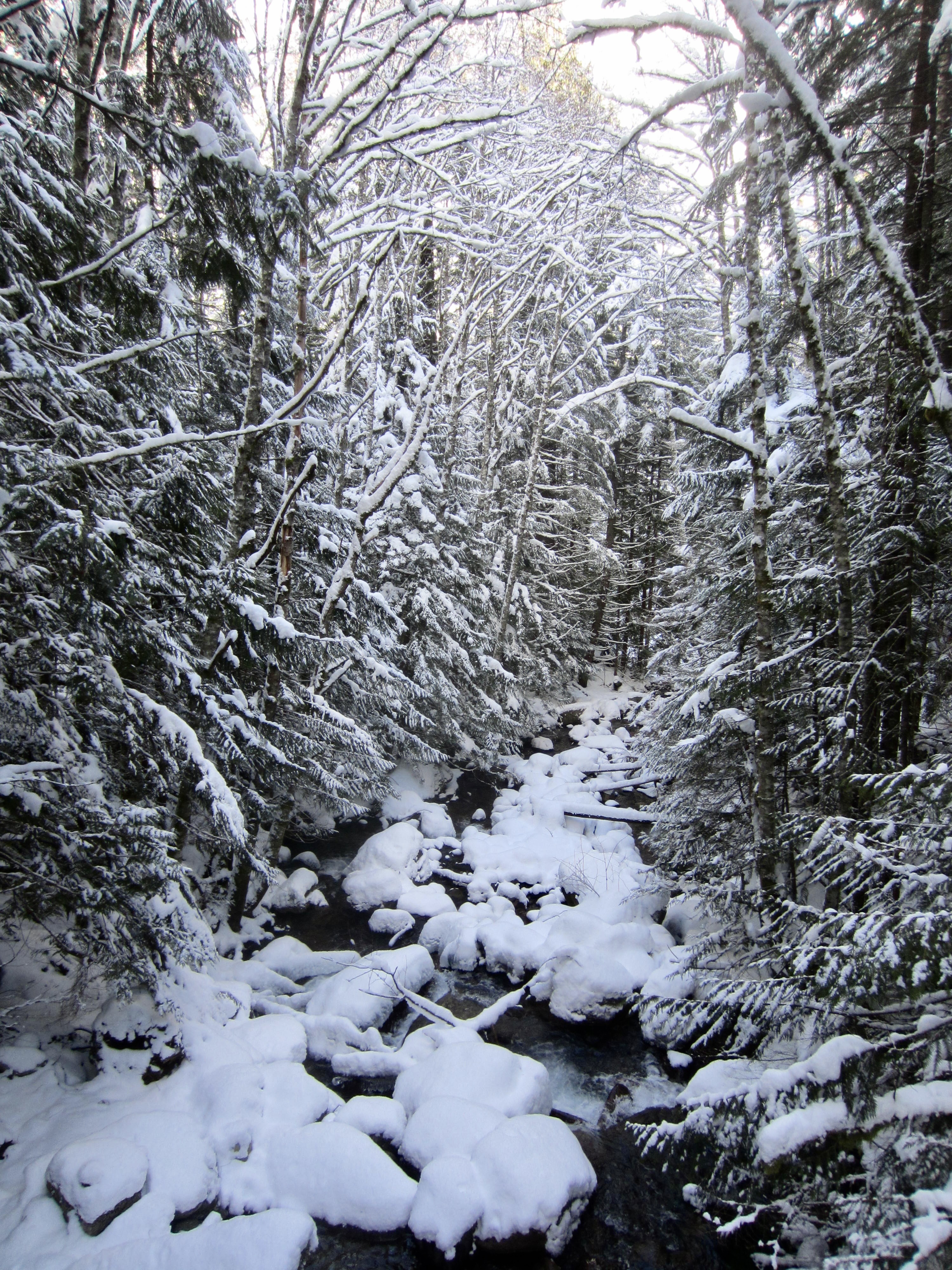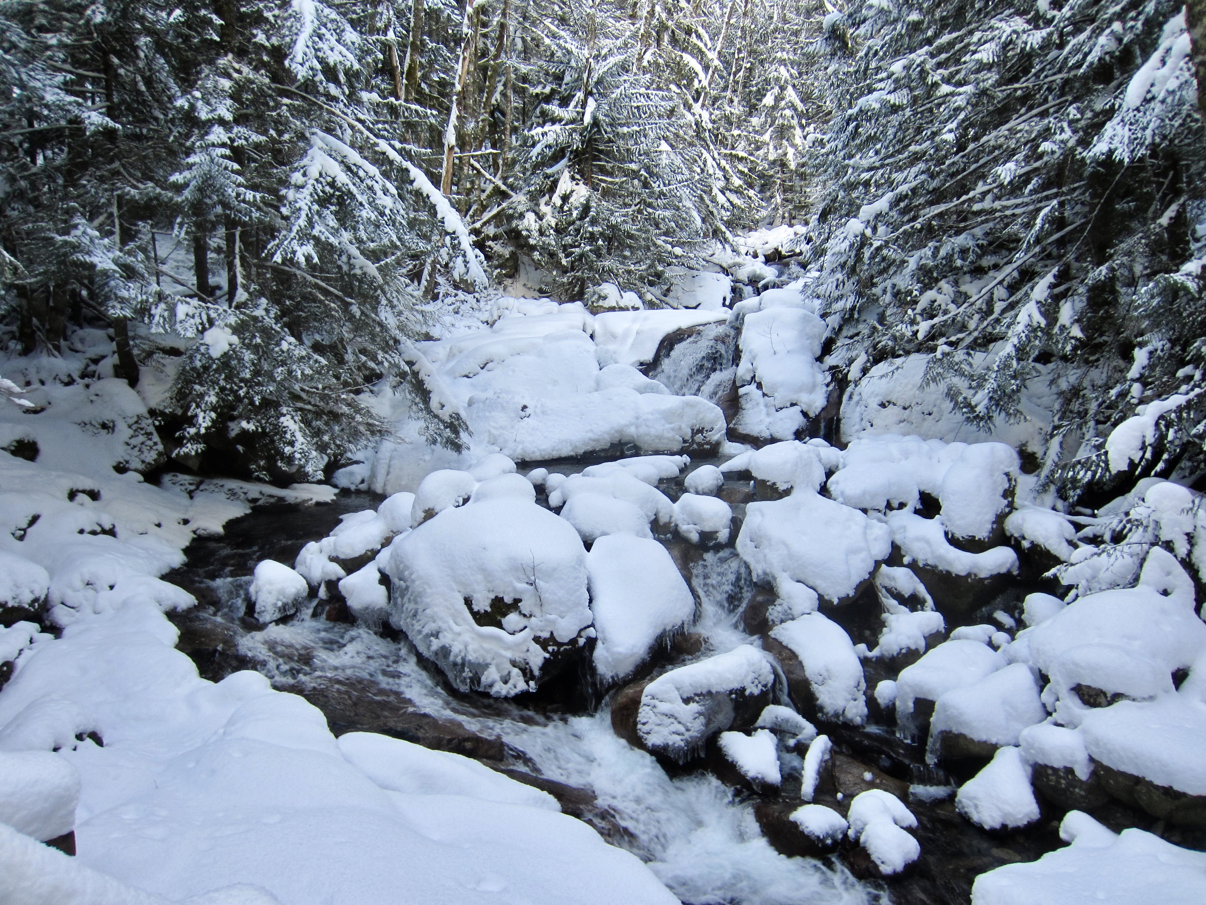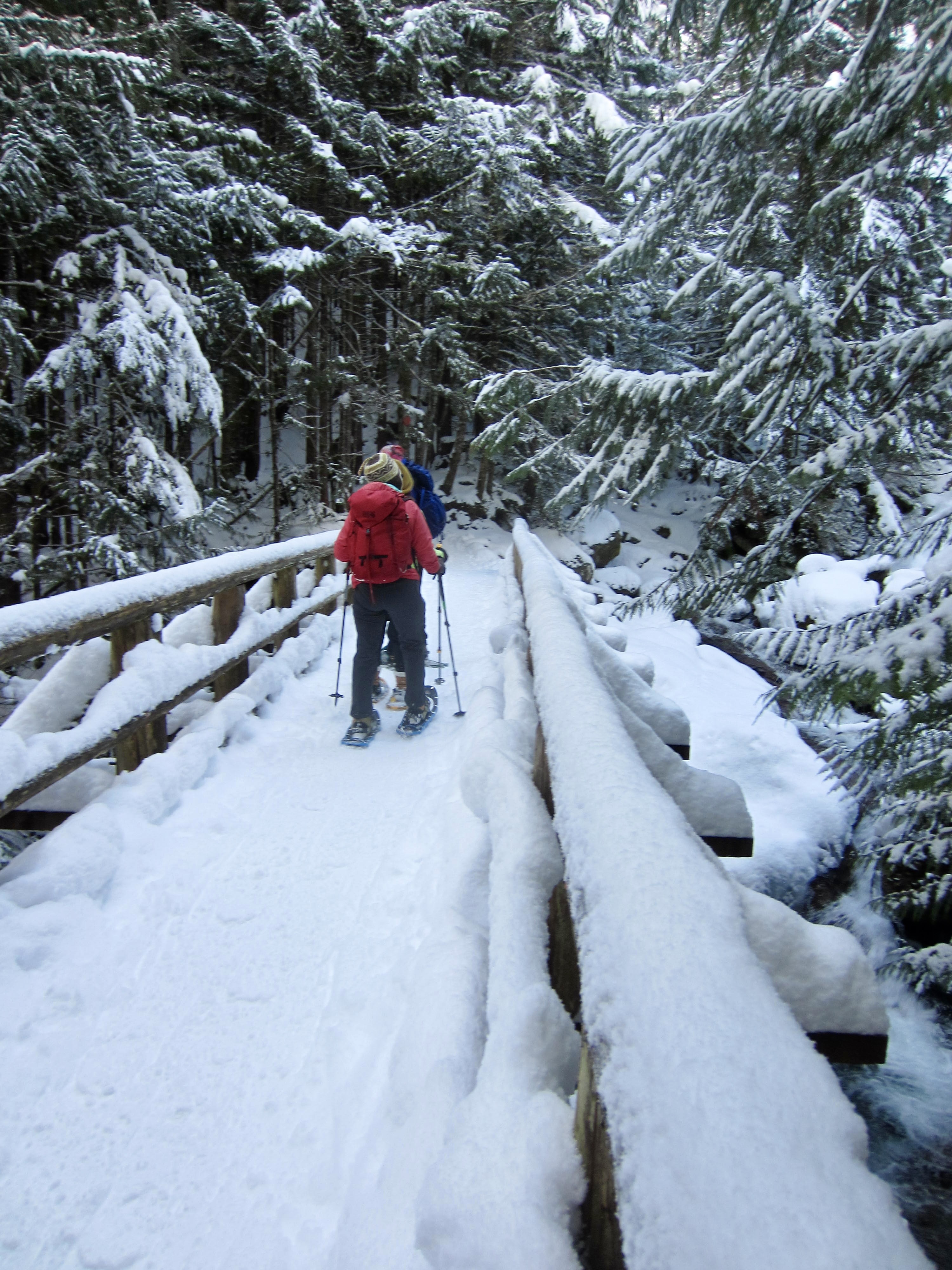 Both snowshoe treks begin by following the Annette Lake Trail, which switchbacks upward through dense forest. Very soon, the trail crosses Humpback Creek on a long wooden bridge. Pause to enjoy the view of this beautiful creek spilling over smooth slabs and rounded boulders.