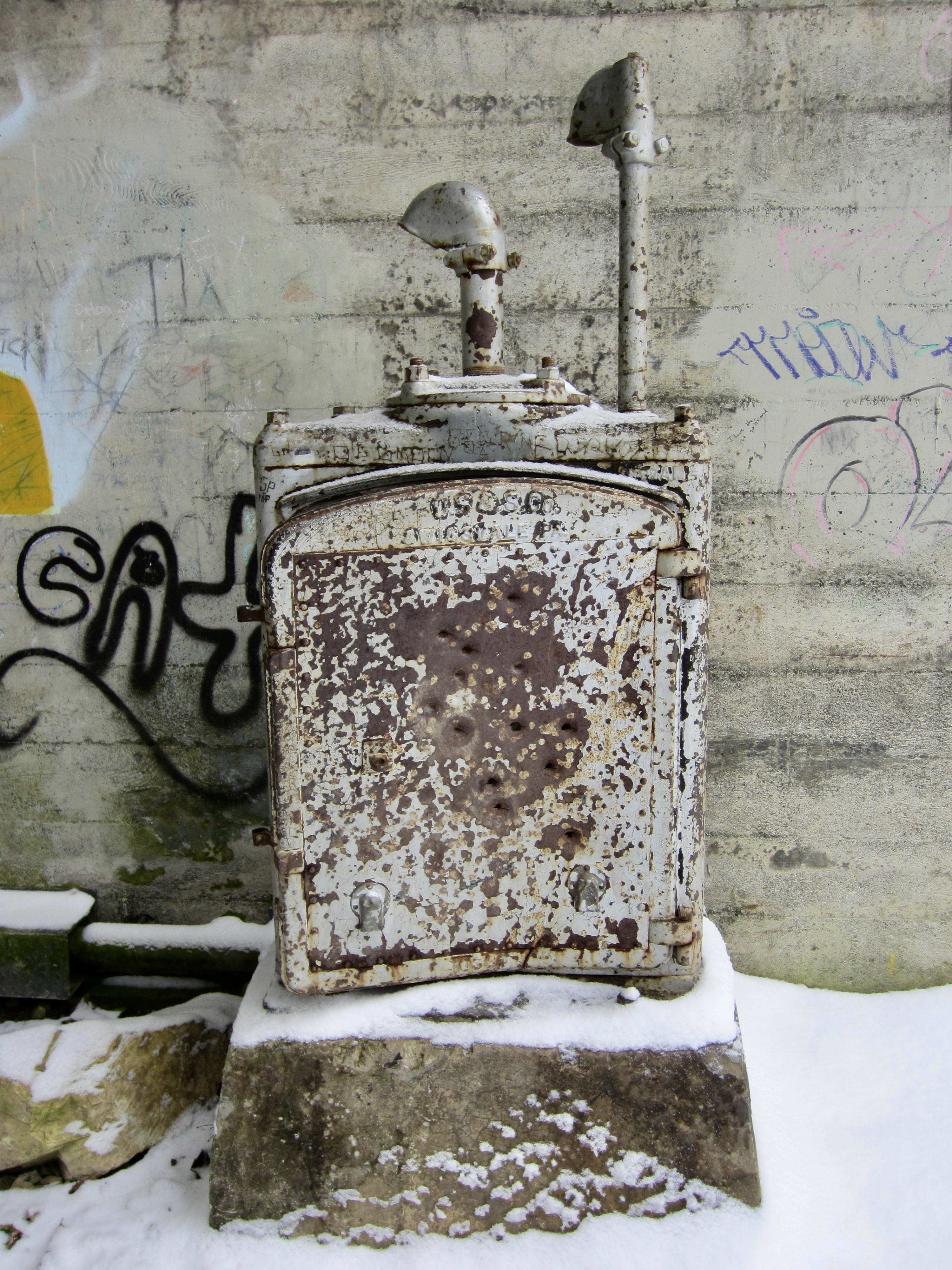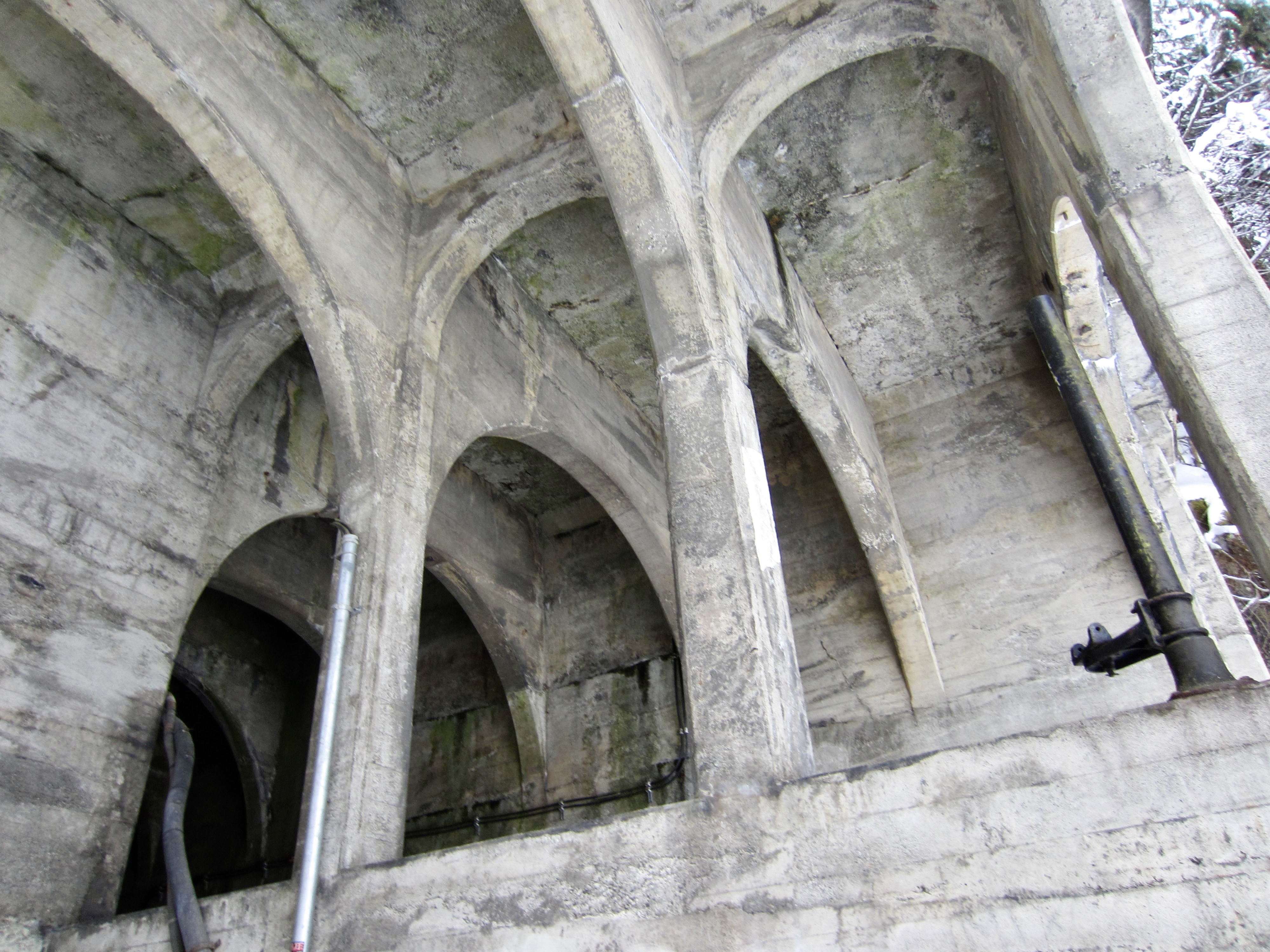 The West Portal displays some impressive architecture in the form of criss-crossing concrete arches, as well as some interesting railroad artifacts. Also, on the right side of the portal, you will see a “50” stamped into the concrete. Between Chicago and Seattle, there were 51 tunnels constructed along The Milwaukee Road, consecutively numbered (with some exceptions) from east to west. Snoqualmie Tunnel No. 50 was the penultimate tunnel in the sequence and was by far the longest. (Whittier Tunnel No. 49 is located about 10 miles to the east. Landsburg Tunnel No. 51, located near Maple Valley, was the very last tunnel.)
