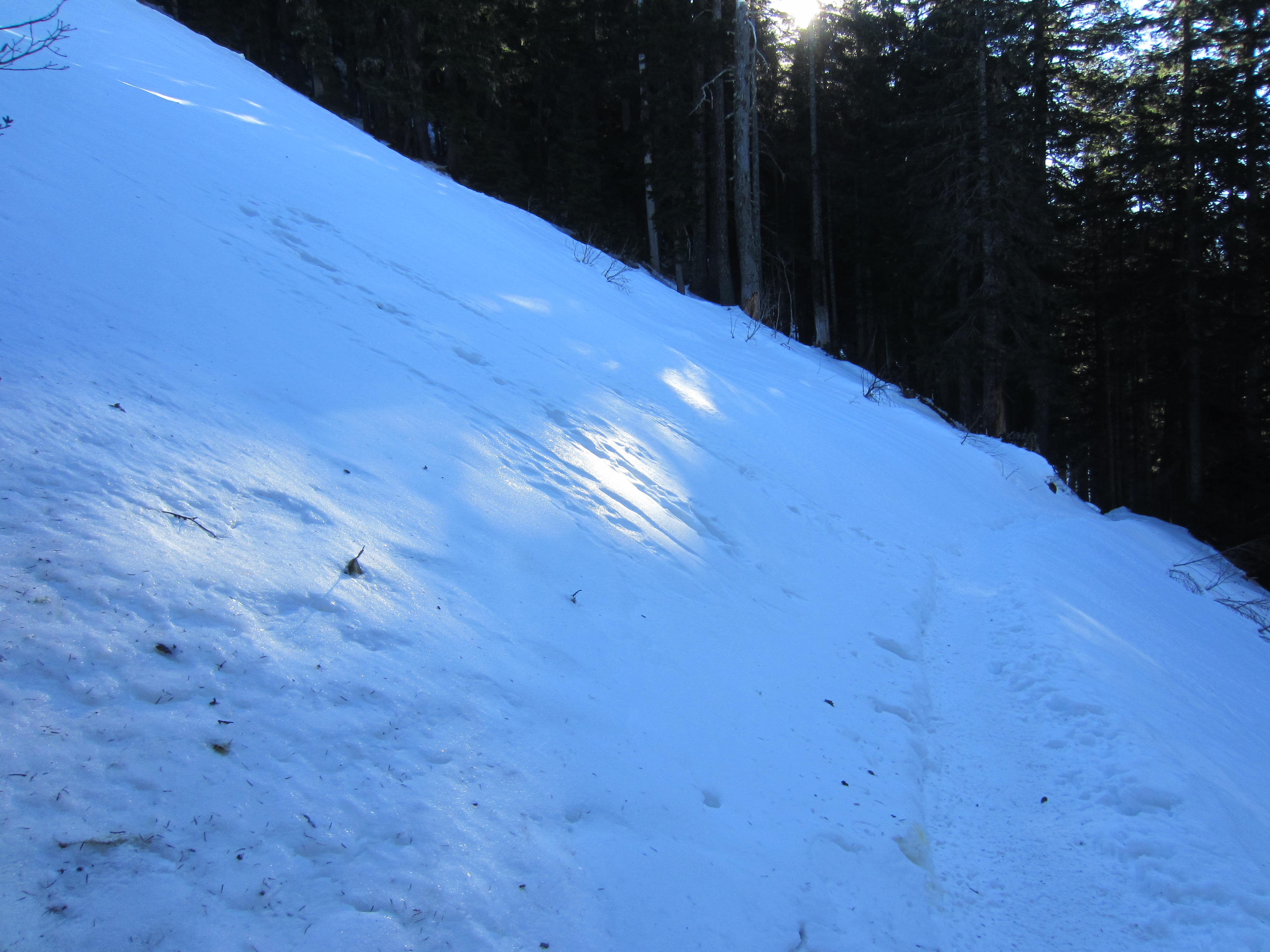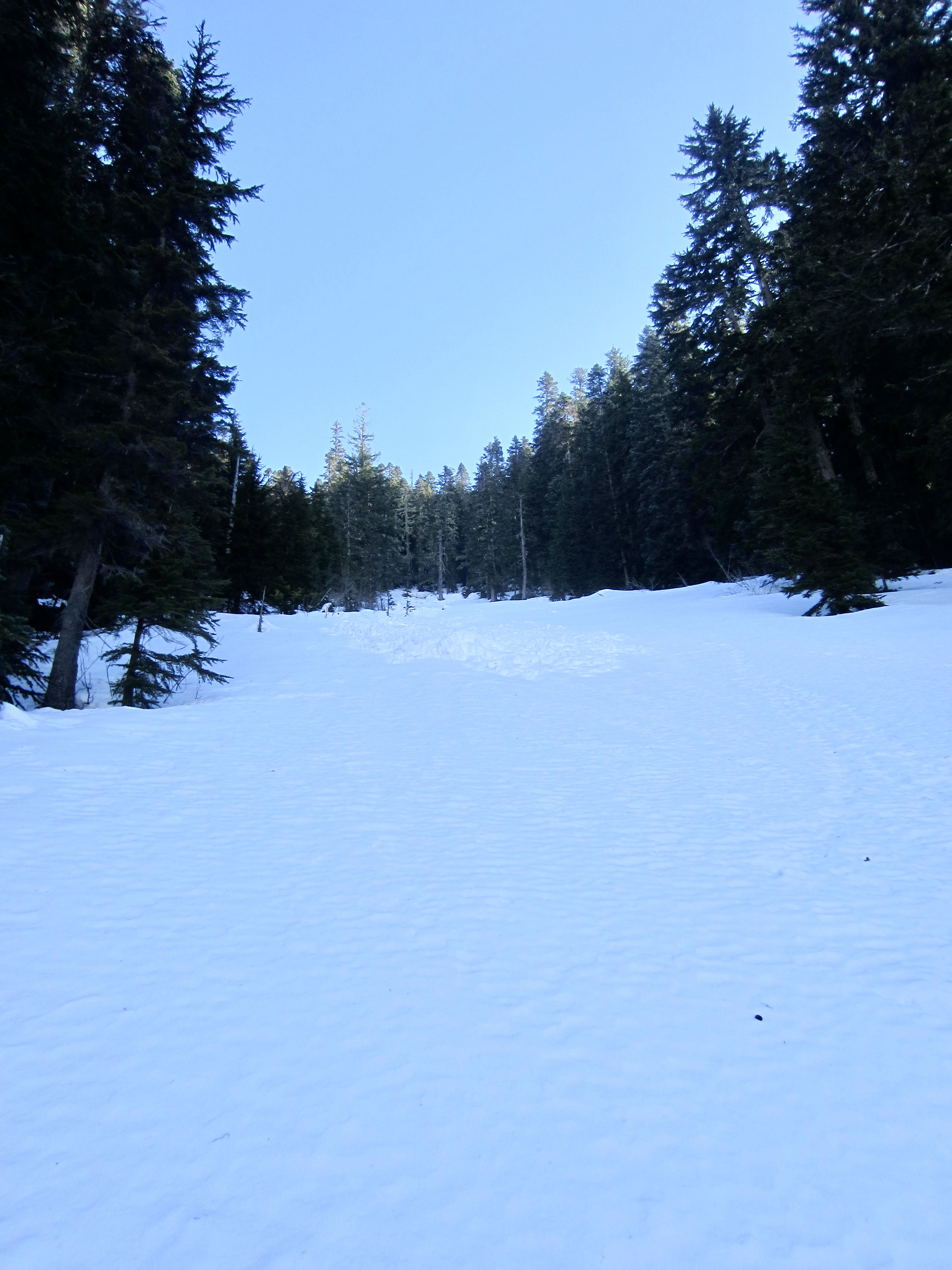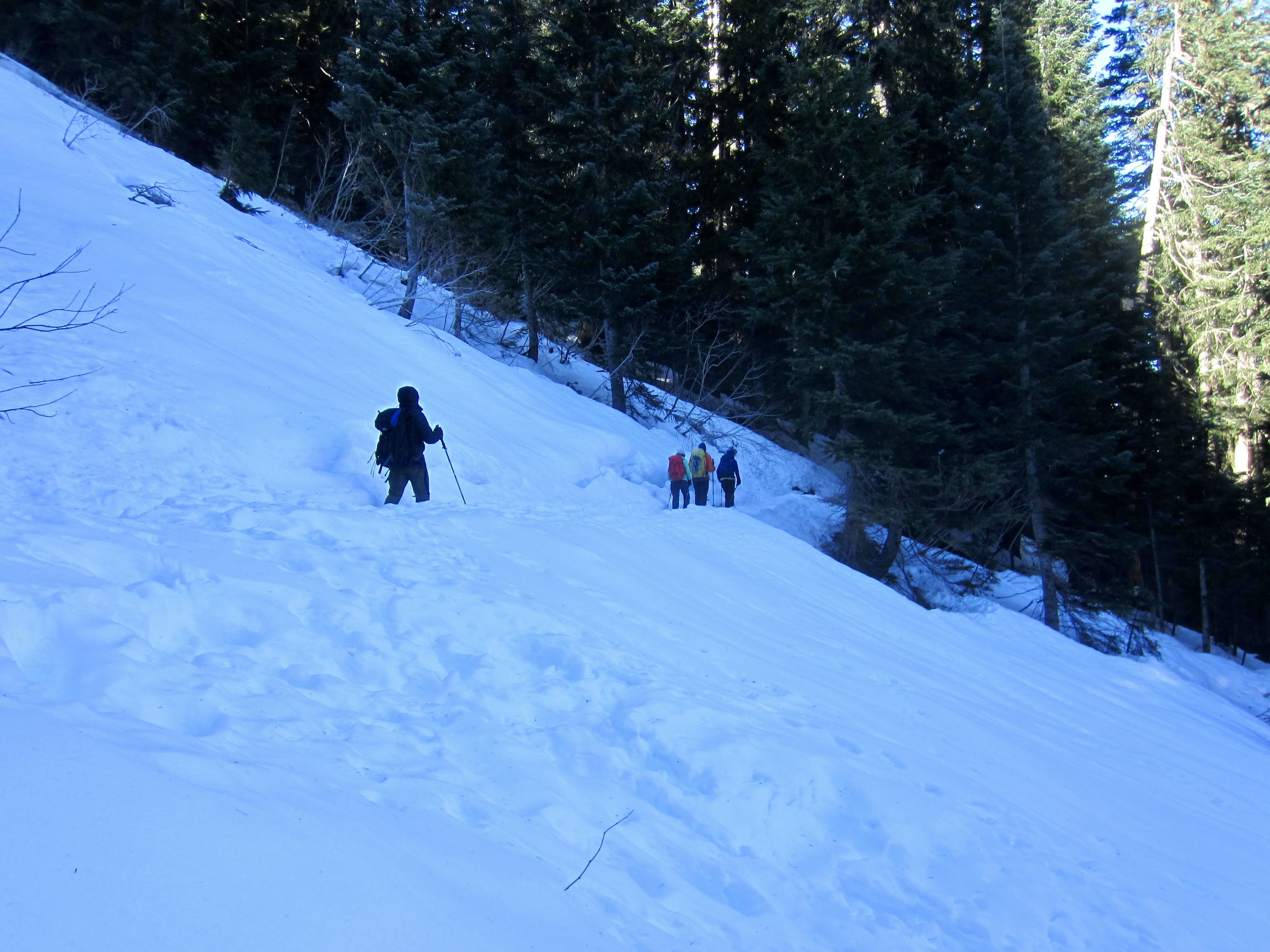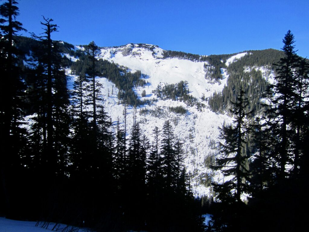 Farther along, the trail passes through a series of long, narrow clearings that can become avalanche chutes during the winter and spring. Make a careful assessment of snow stability before heading across any of these chutes, and be prepared to turn around if conditions are unstable.