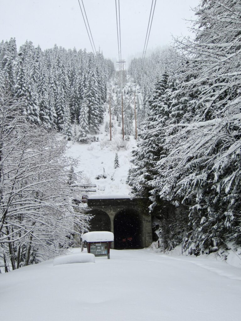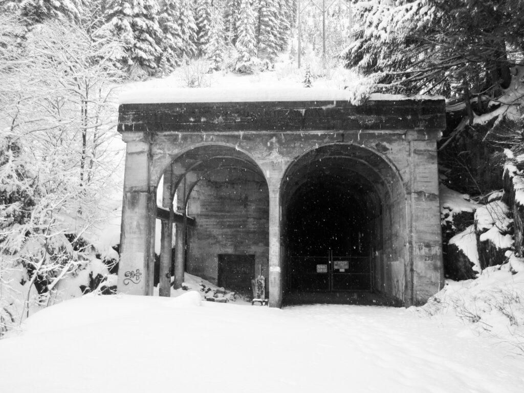 A final straightaway brings you to Rockdale Picnic Area and the West Portal of the historic Snoqualmie Tunnel (2.5 miles + 600 feet from sno-park). This 2.3-mile-long tunnel was constructed during the years 1912-14 and served as a critical segment of The Milwaukee Road for approximately 65 years. Nowadays, the tunnel is open to hikers, bikers, and horses, although safety concerns keep it closed throughout the winter months.