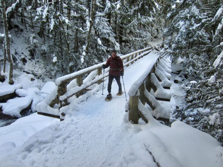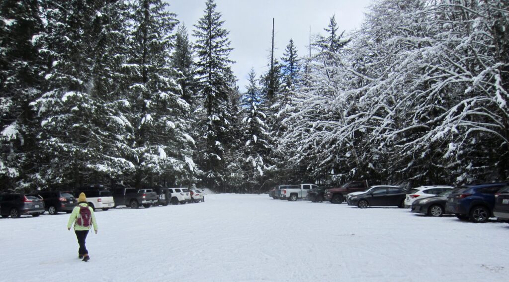 Parking for both snowshoe treks can be found at Annette Lake Sno-Park, which is located on the south side of Interstate-90 across from the Asahel Curtis Picnic Area. To reach this sno-park, get off the freeway at Exit 47 and go south to a “T” intersection. Go left (east) on Forest Road 5500 for approximately ⅓ mile, then turn right into the large parking lot. Be aware that a Washington State Sno-Park permit is required here.