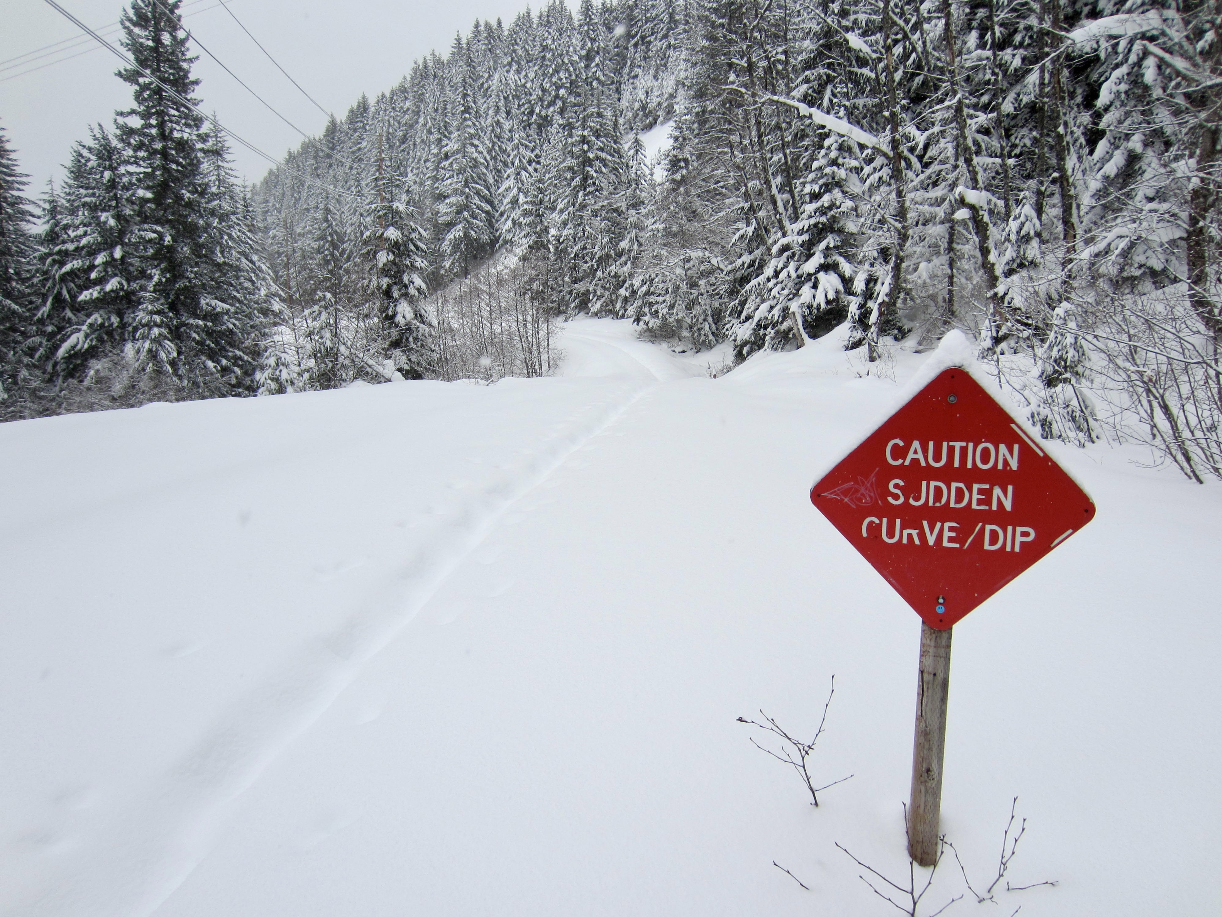 After a mile of easy hiking, the P2C Trail dips down to cross Olallie Creek and curves to the left. Contrary to a warning sign here, neither the dip nor the curve is at all sudden—at least, not when you are snowshoeing!. Shortly beyond, Interstate-90 can be seen and heard far below.