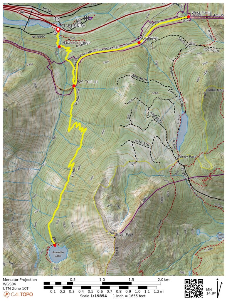 The following three subsections describe (1) the shared route from Annette Lake Sno-Park to the Palouse-To-Cascades (P2C) Trail junction, (2) the continuation route to the West Portal, and (3) the continuation route to Annette Lake