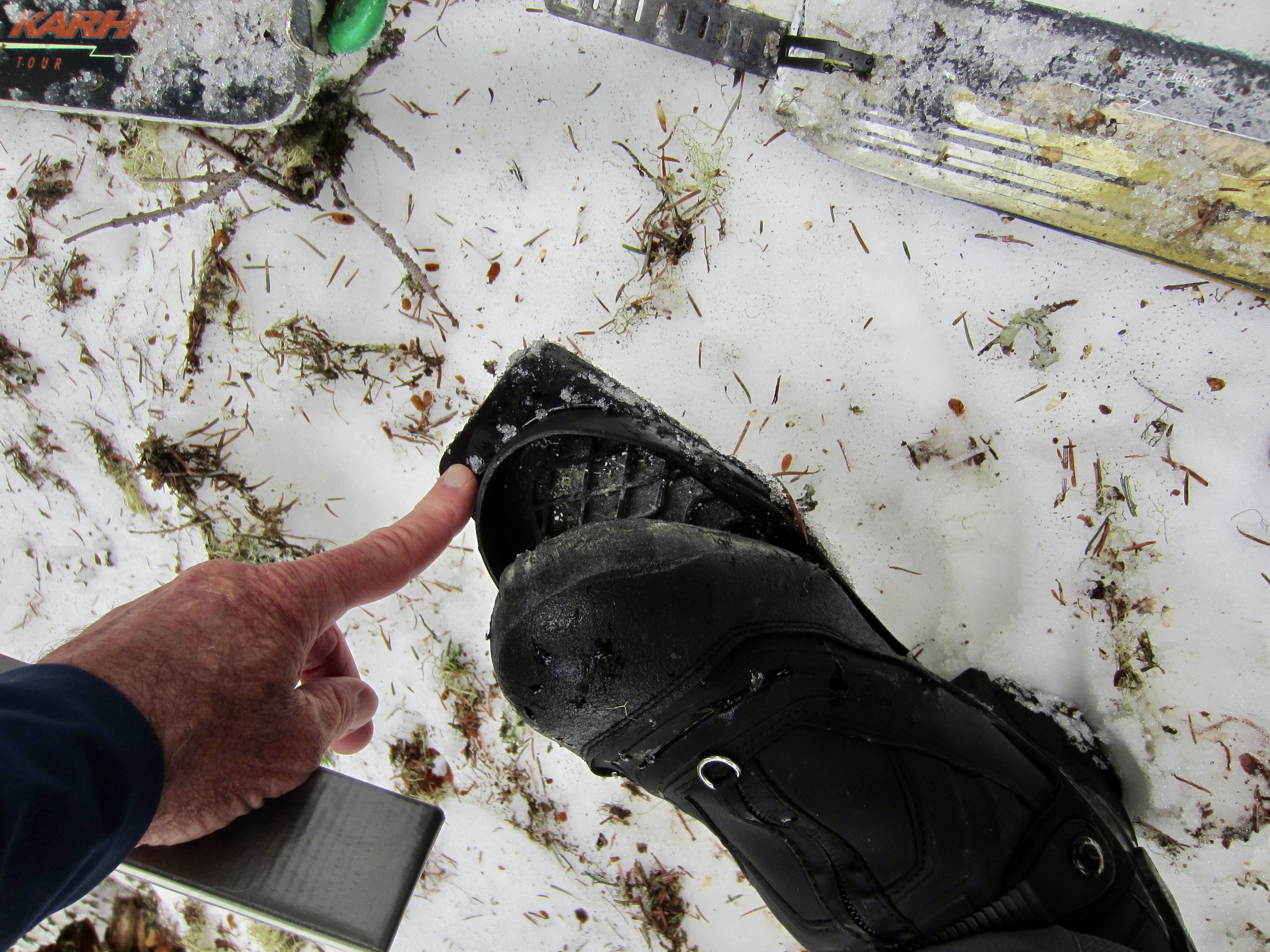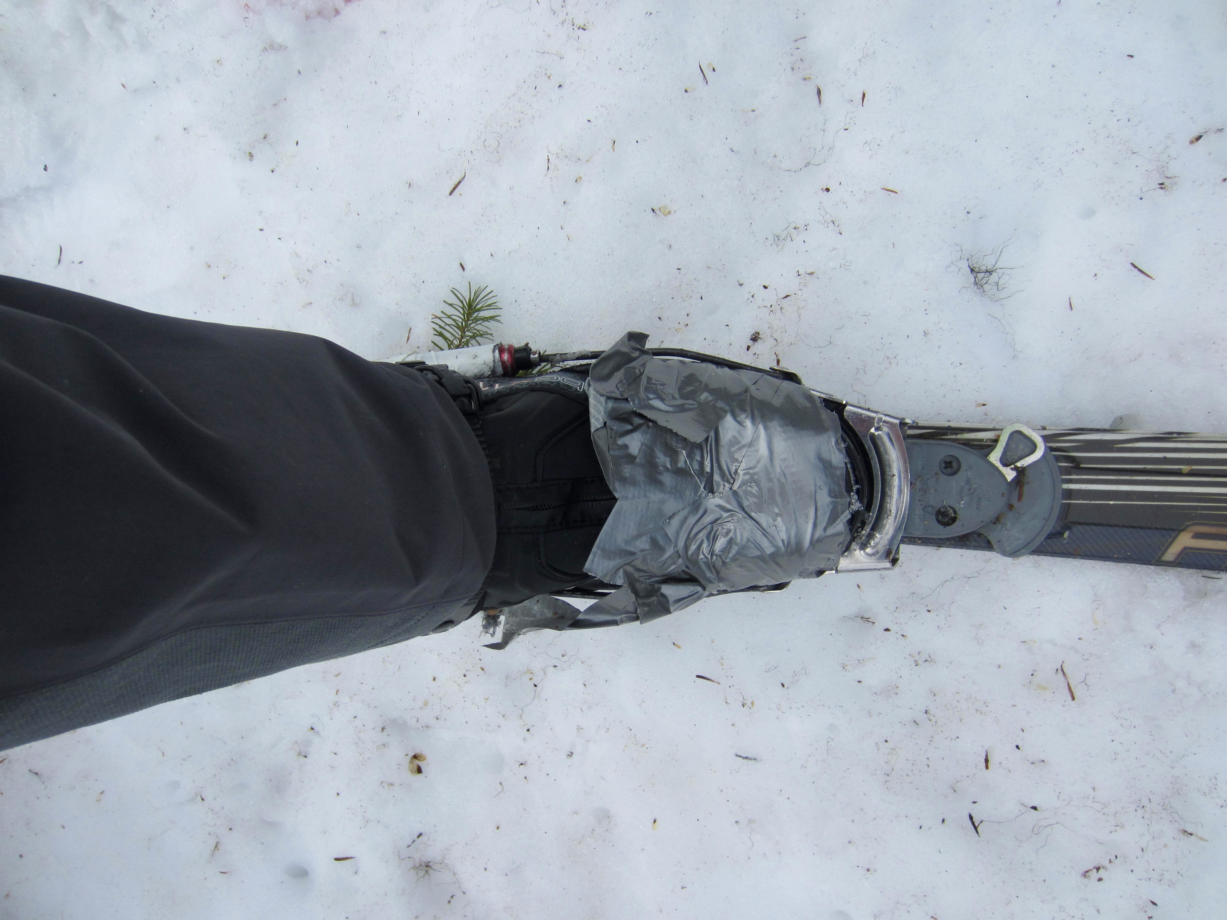 Duct Tape for innumerable repair situations. One time, I had an NNN-BC binding pull out of my ski, and another time I had a duck-bill boot sole delaminate from the upper. Both times, I was able to get back to the car several miles away by simply taping my boot and binding onto my ski (see photos below). Gorilla Tape and T-Rex Tape are two brands of high-strength, high-stick duct tape. Rather than carry an entire roll, simply wrap a few yards of tape around a dowel rod or old credit card.